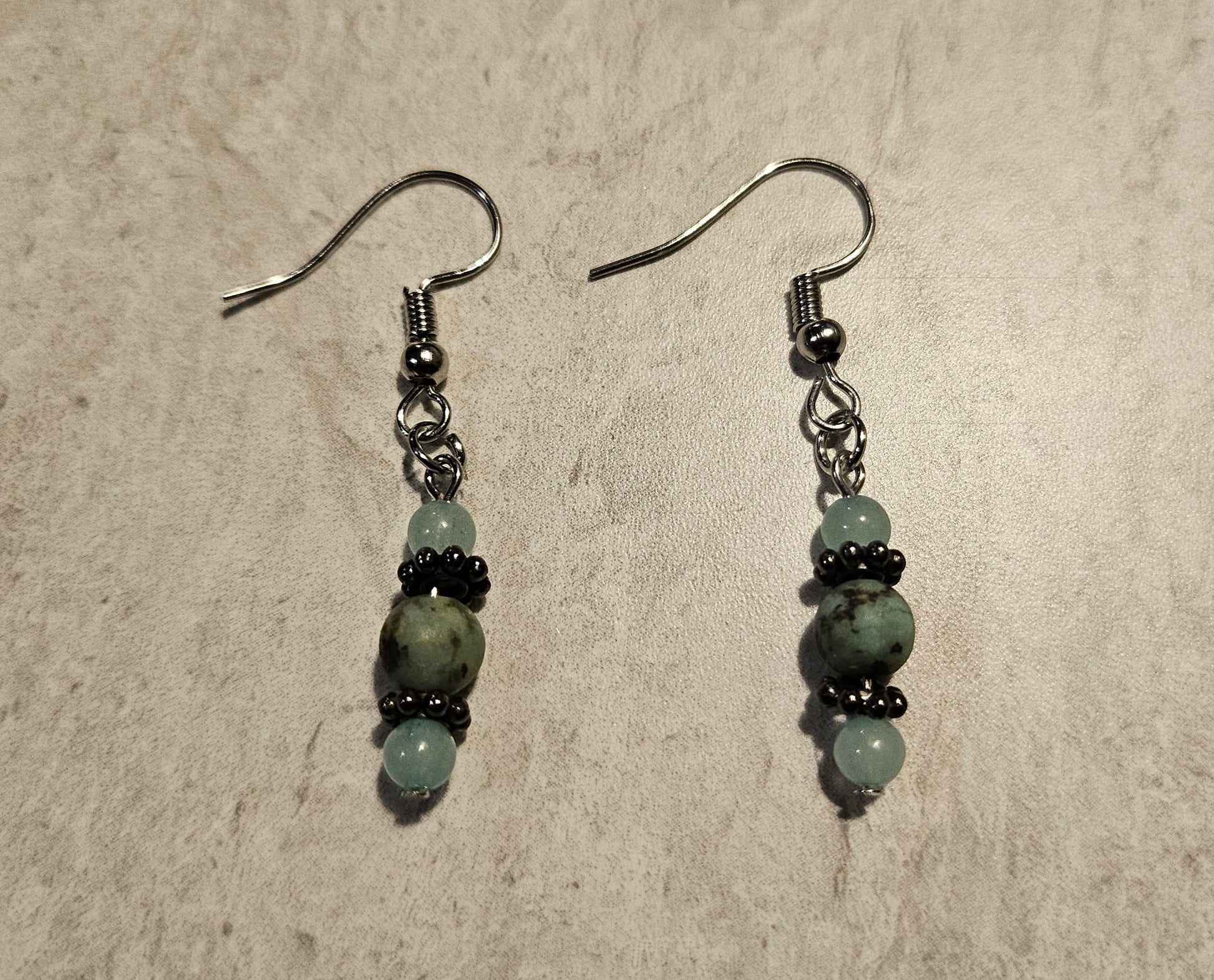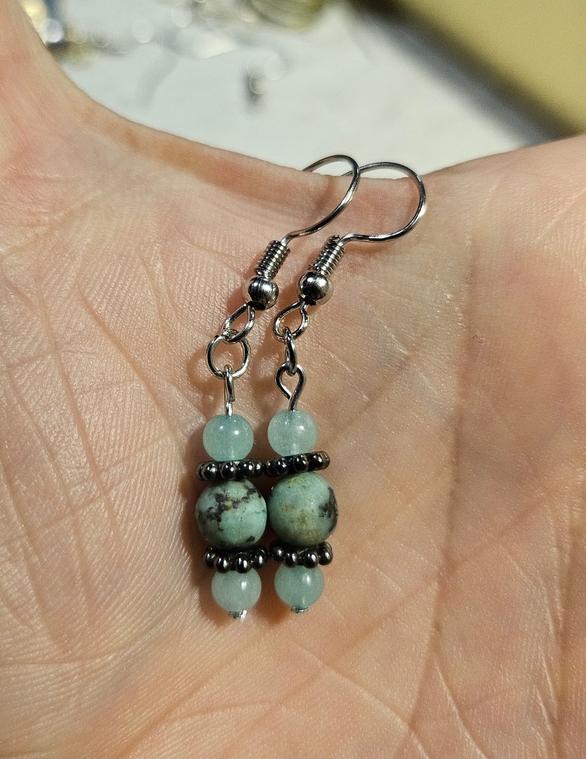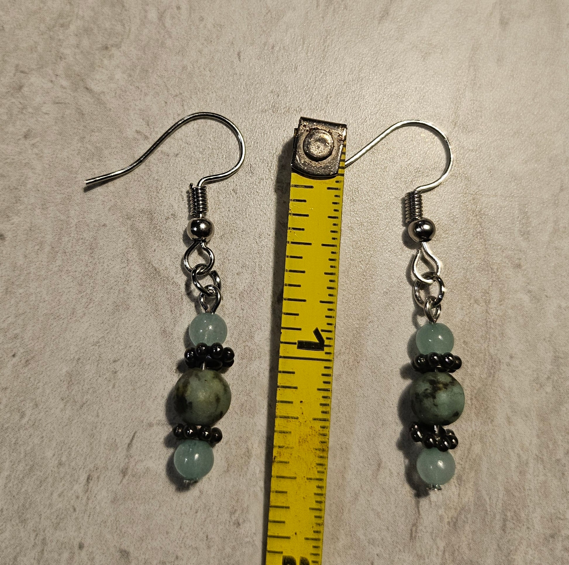 A pair 1.5" earrings made with two kinds of amanzonite beads on a silver eye pin with fishook earrings.