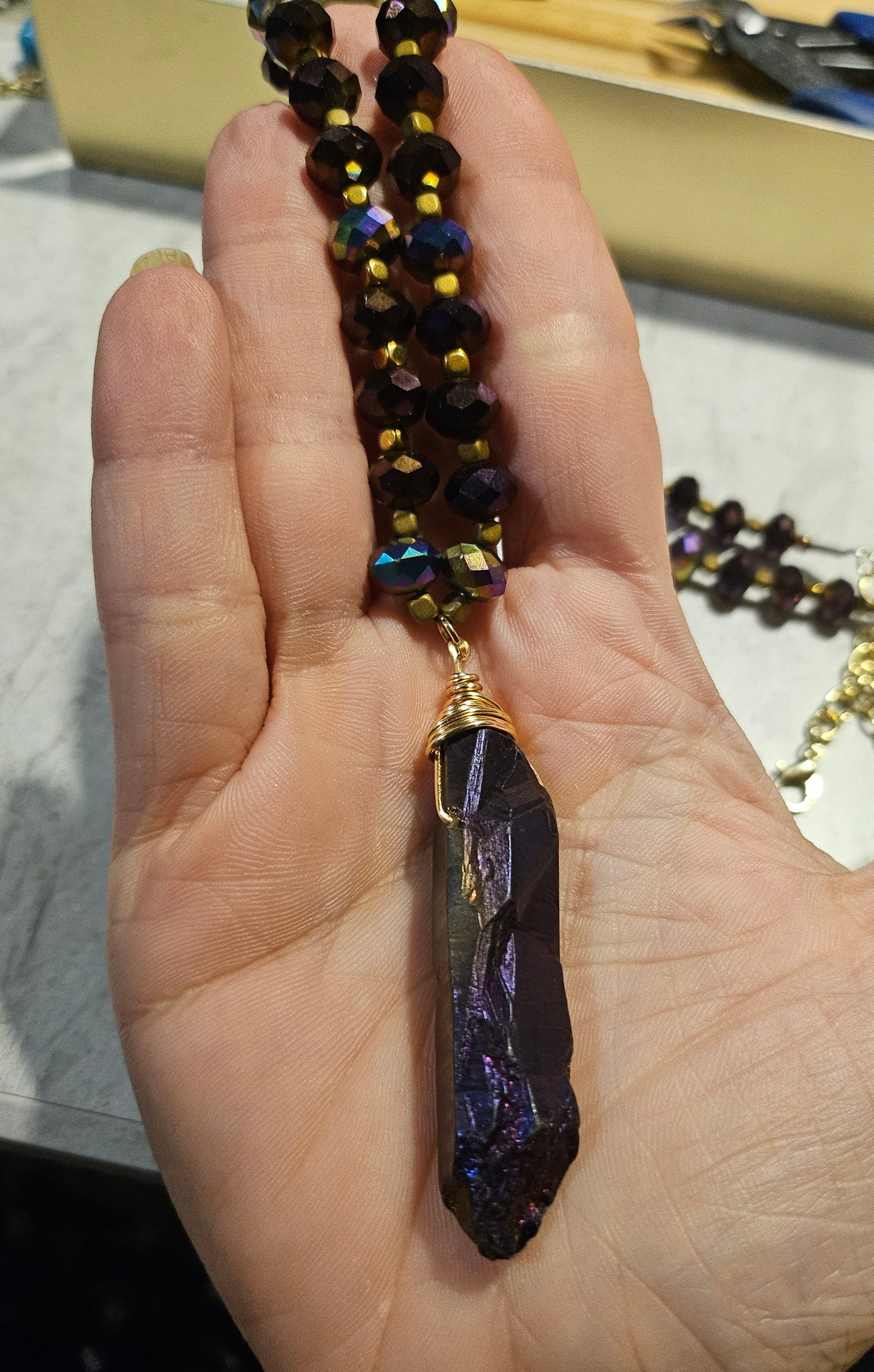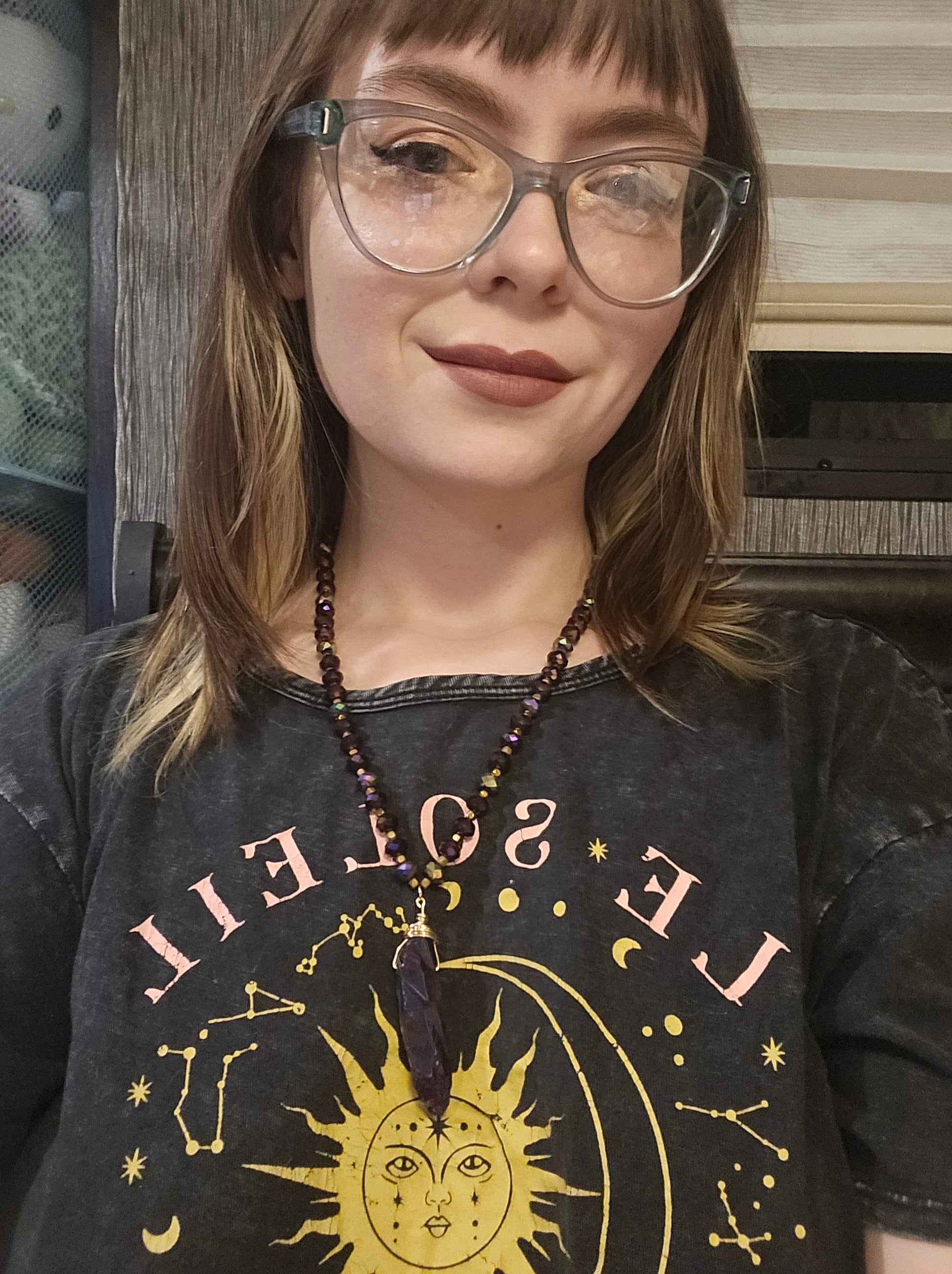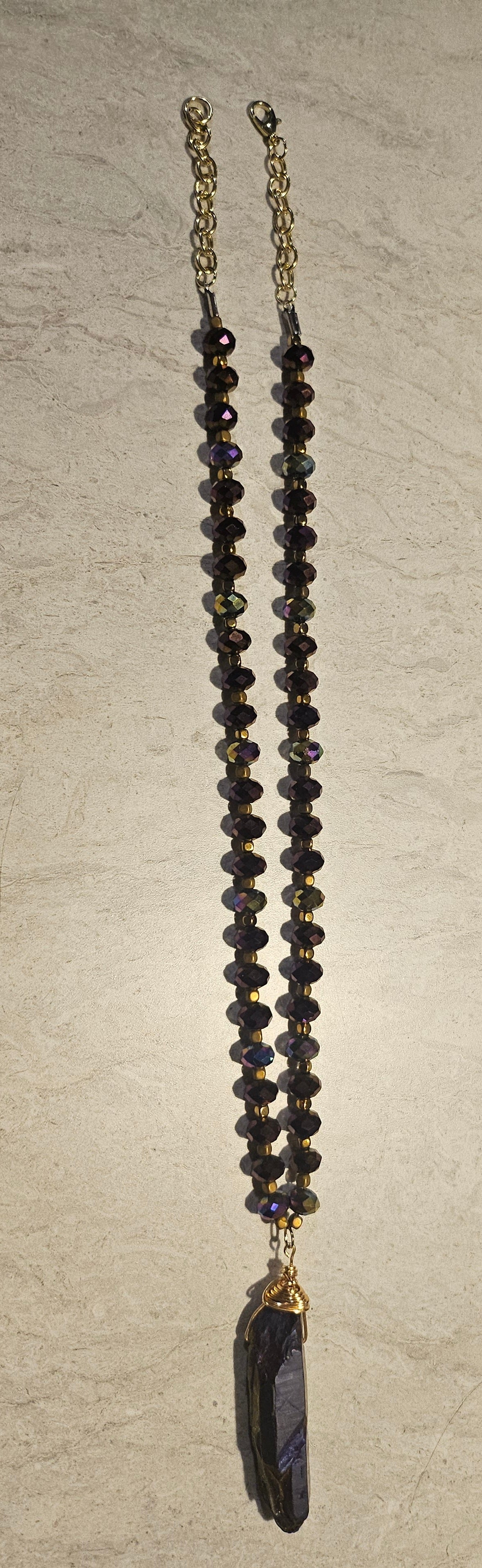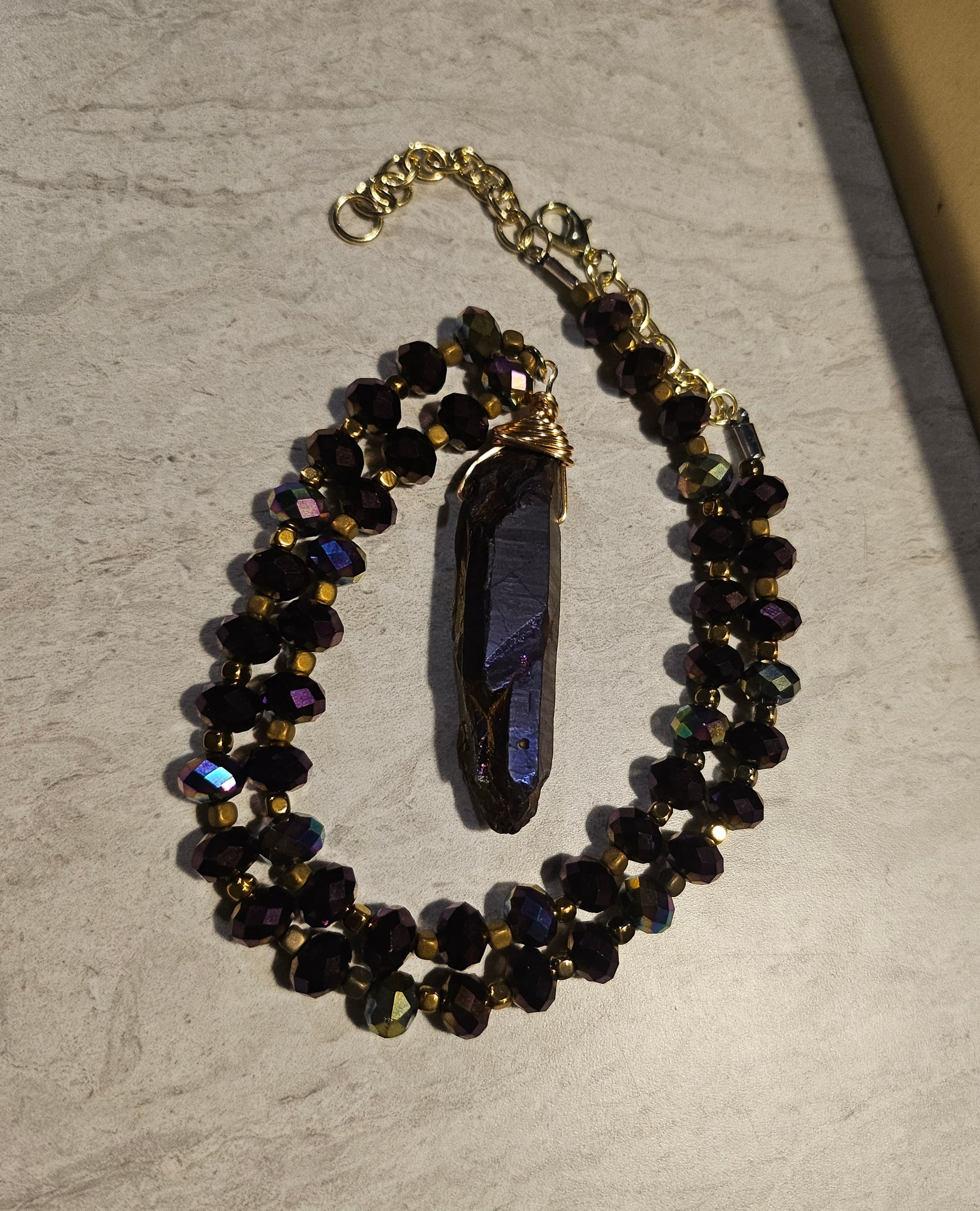 A 10" beaded fishhook necklace featuring iridescent glass purple beads and a dark purple dyed iridescent crystal charm. On beadalon string with gold hardware.