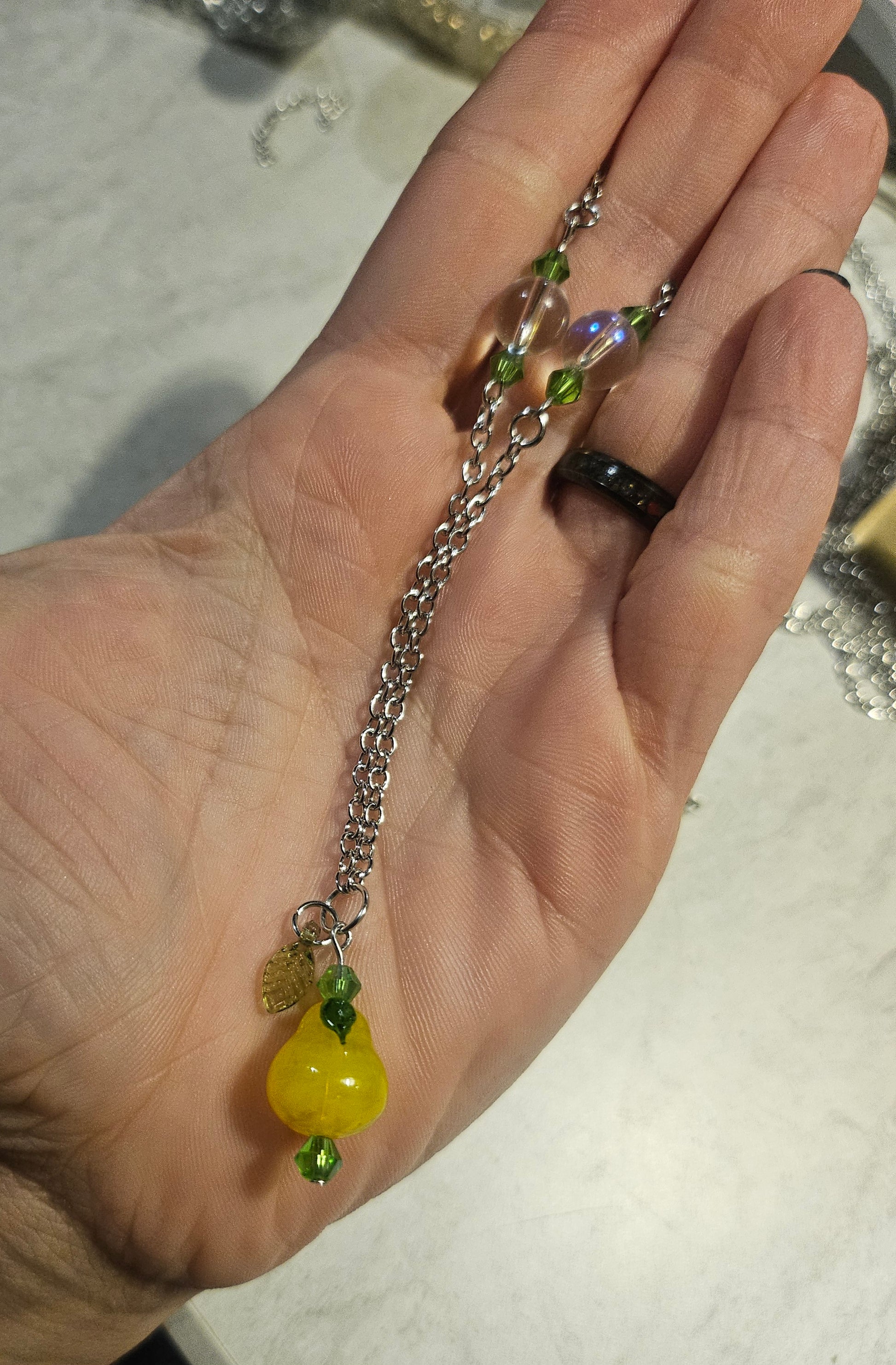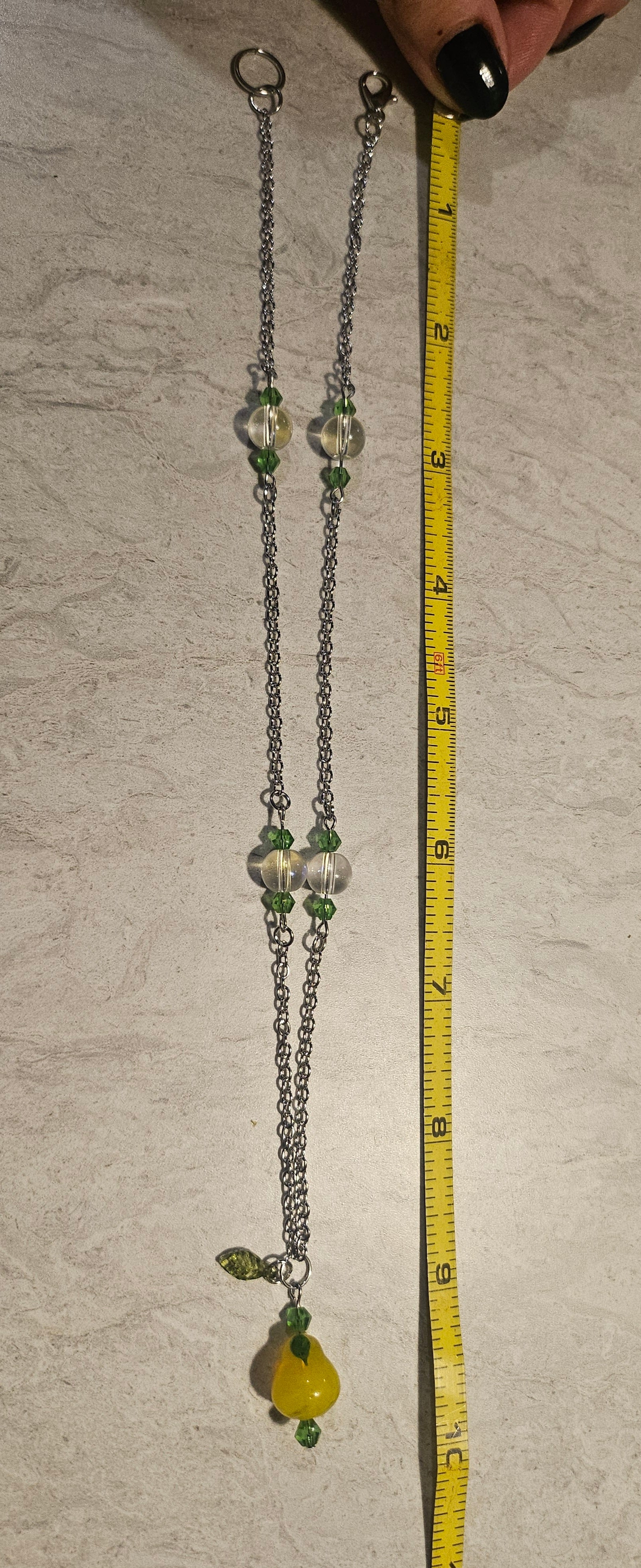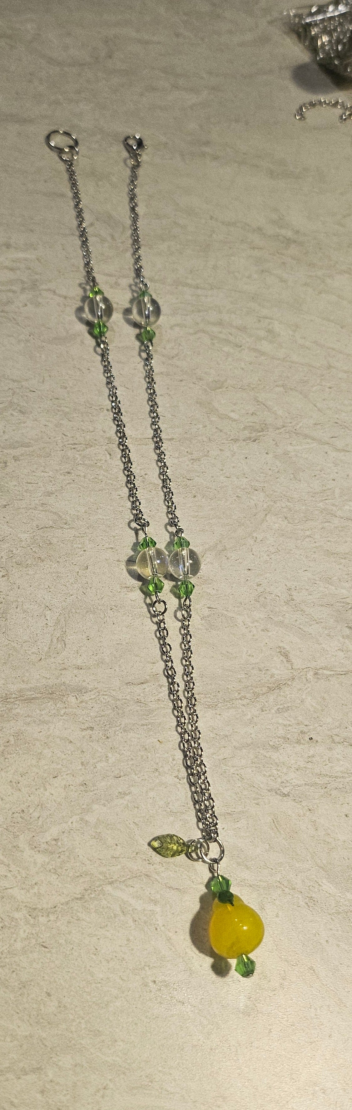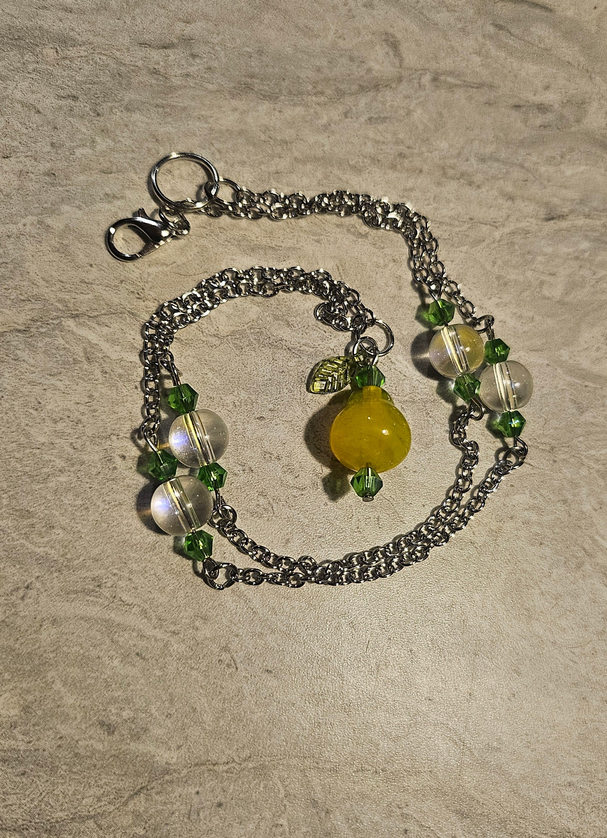 A 10" lobster clasp necklace made with a glass pear bead, glass iridescent beads and green glass beads.
