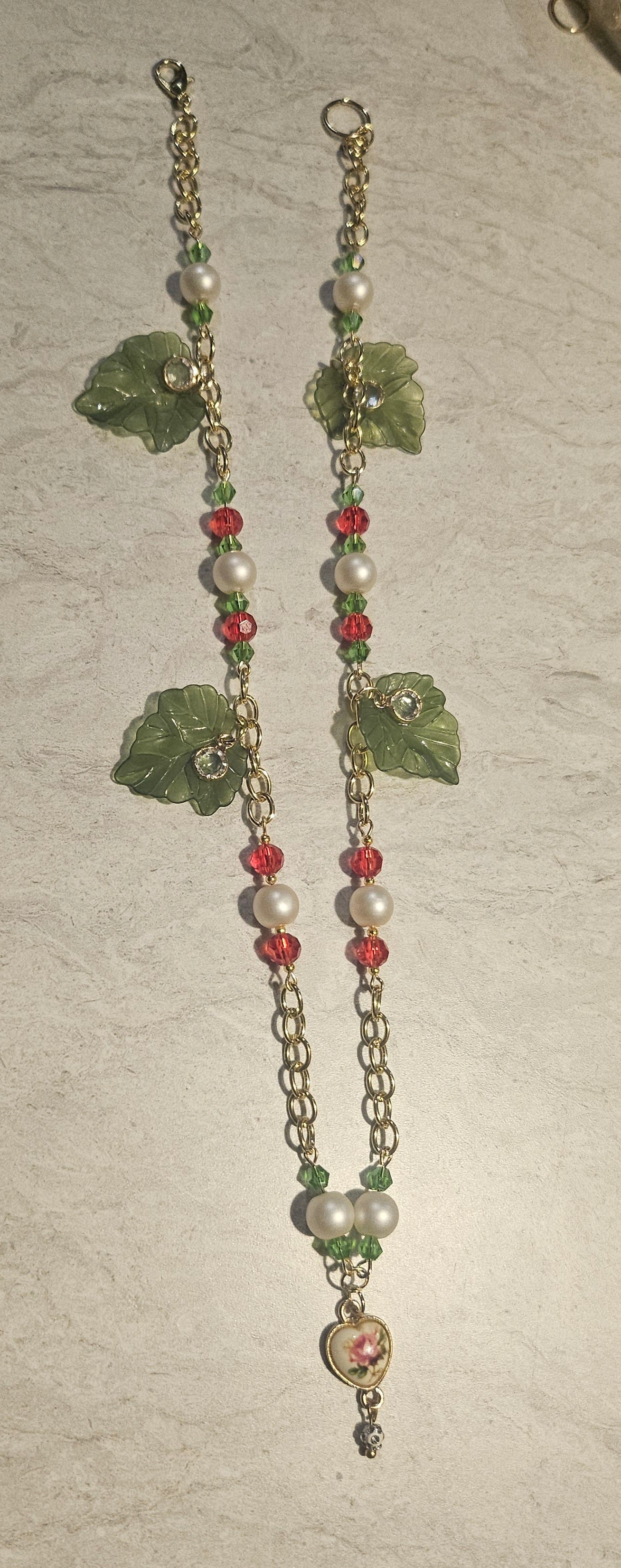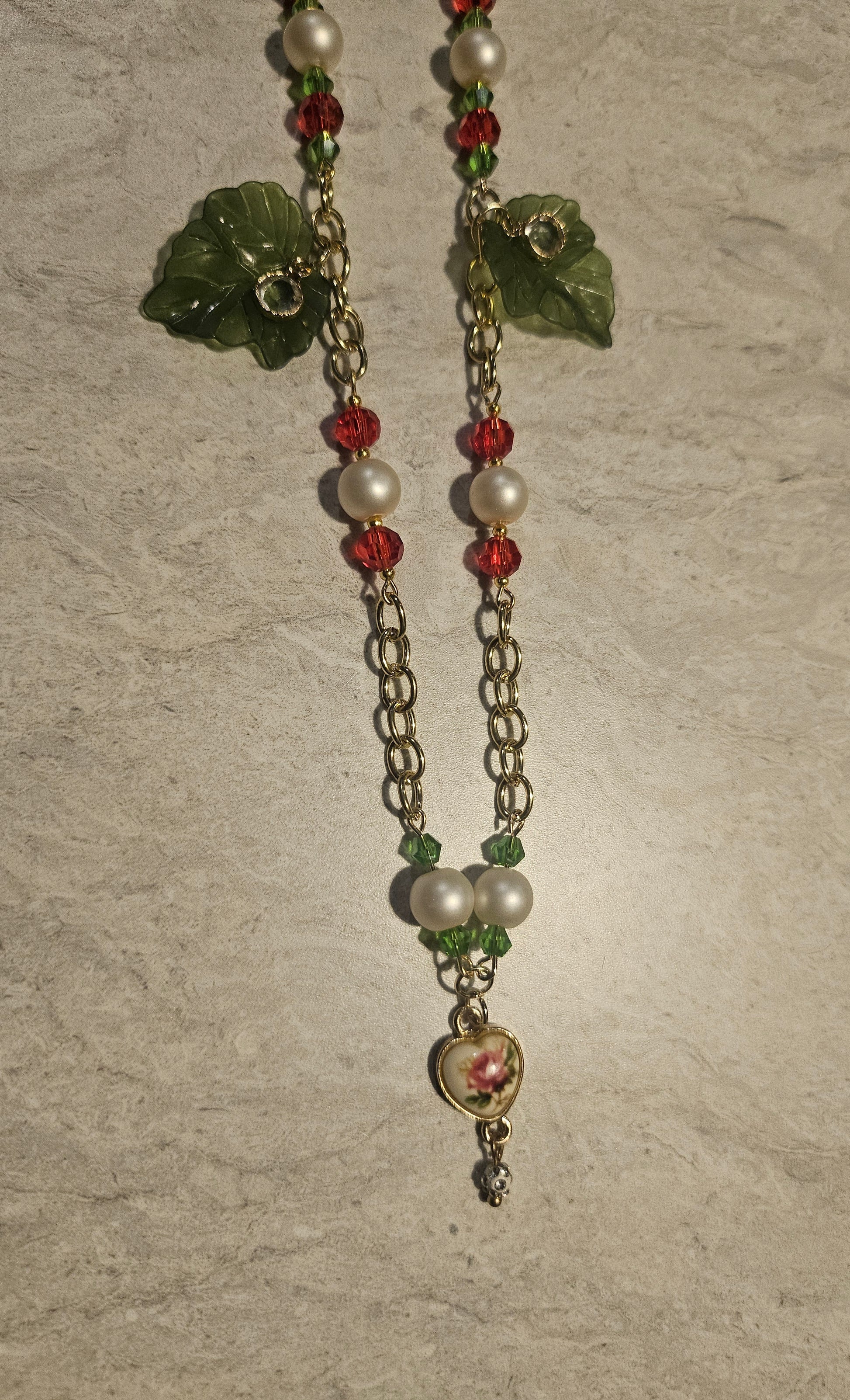 A 10" beaded necklace made with cream round beads, faceted red beads and glass forest green beads for spacers. Closure is lobster clasp.