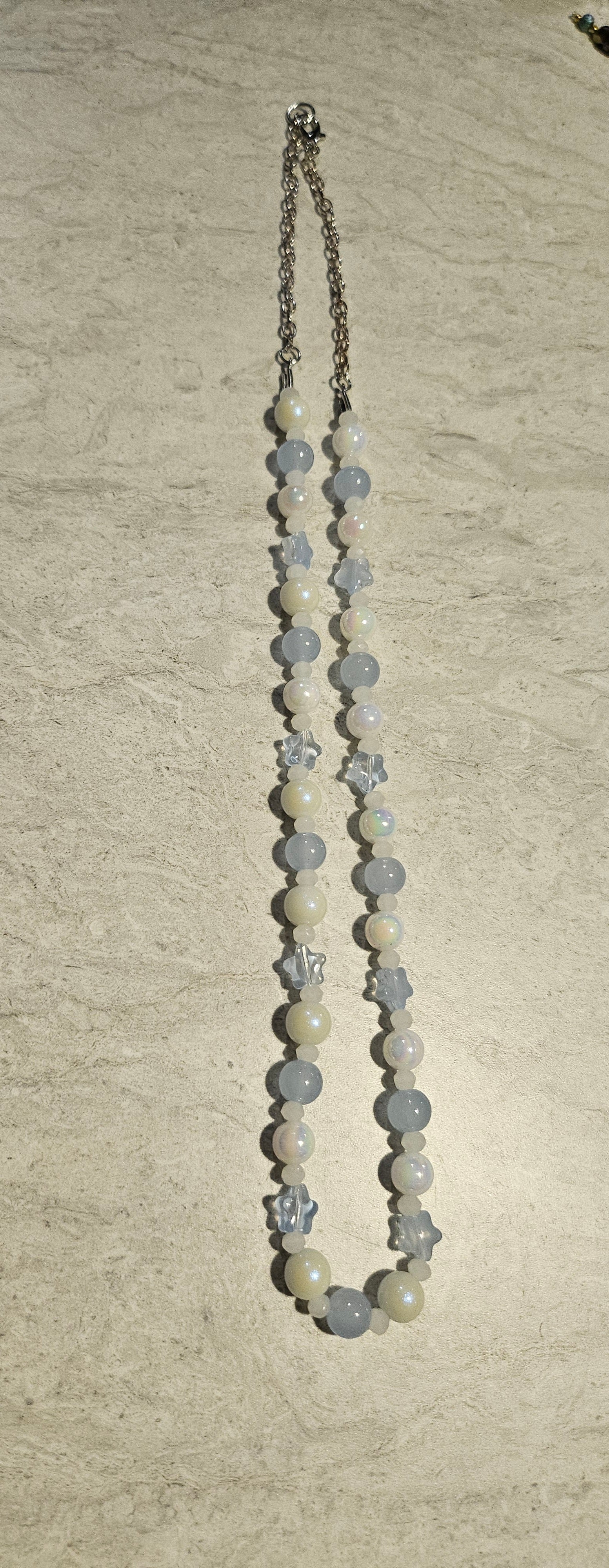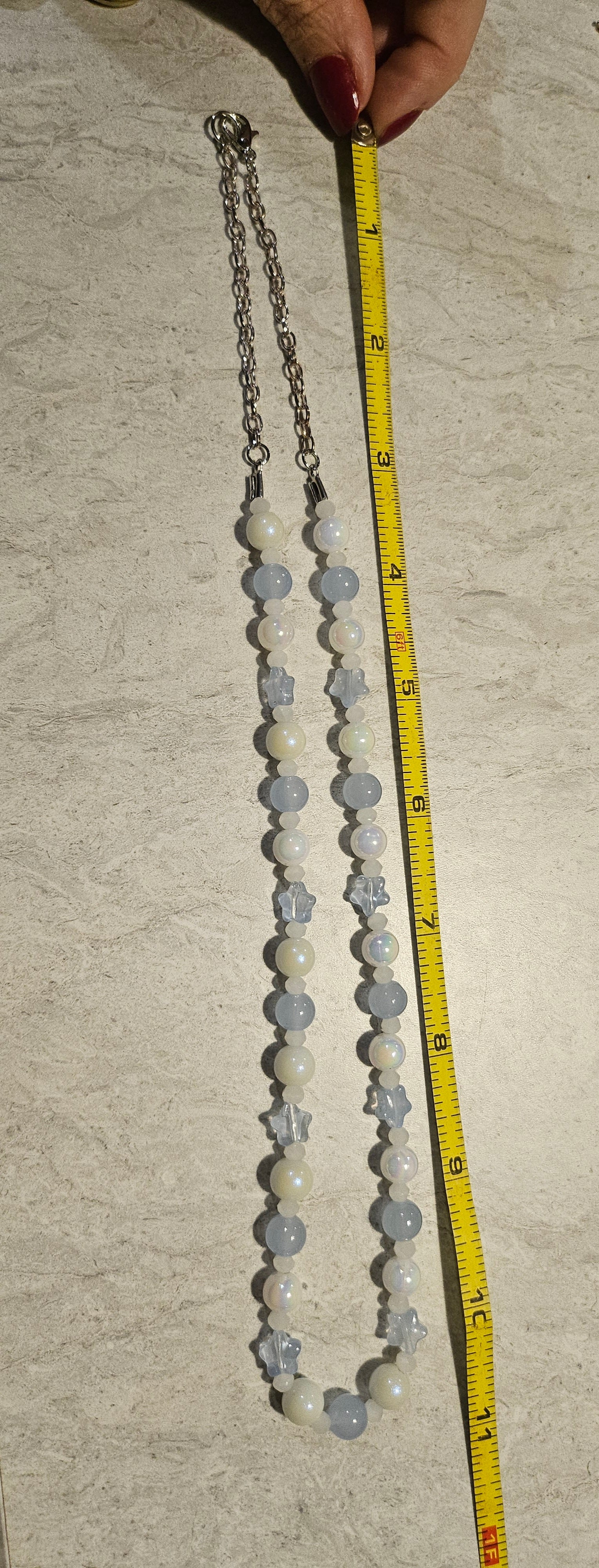 An 11" lobster clasp beaded necklace made with baby blue glass beads and glass stars.