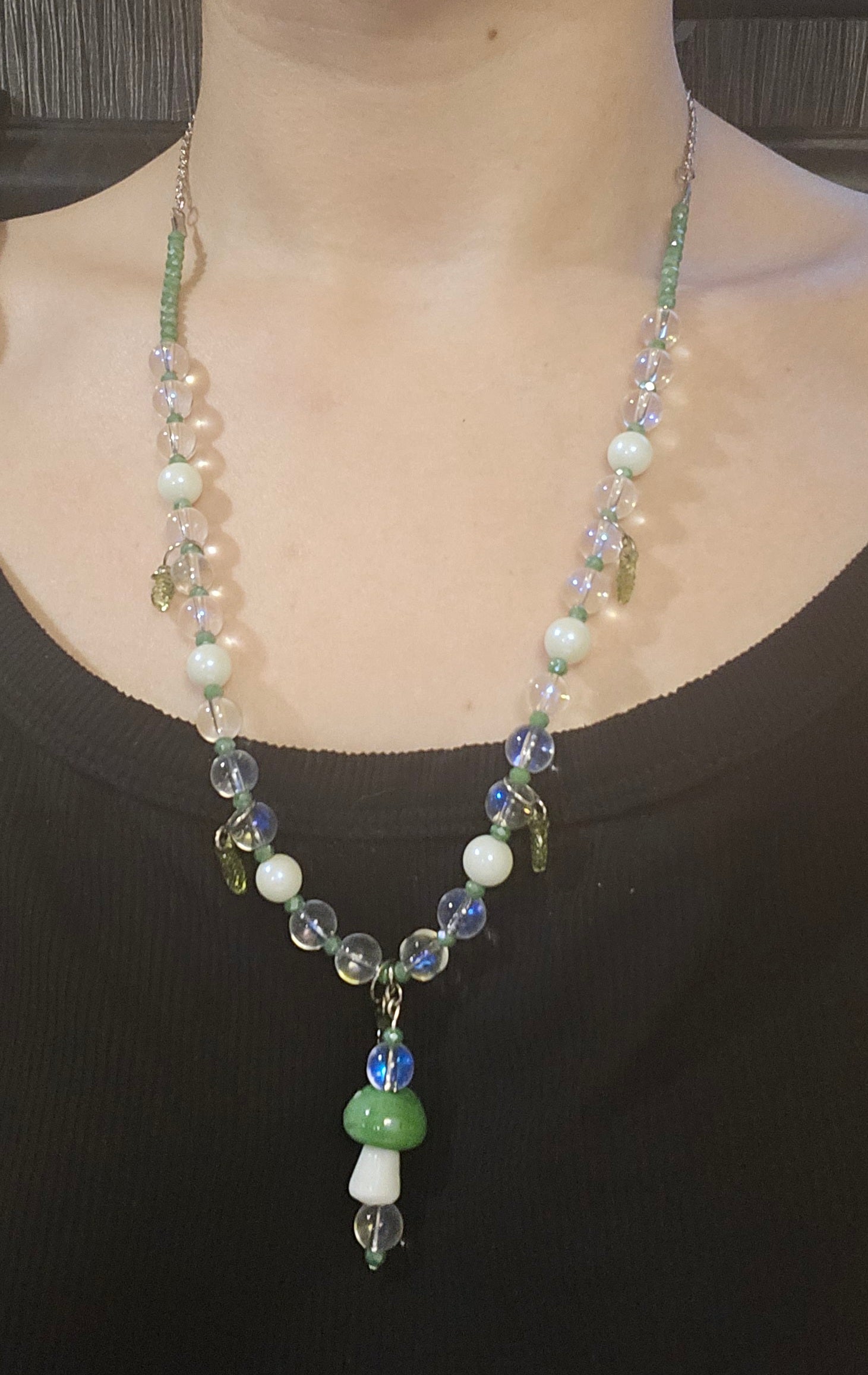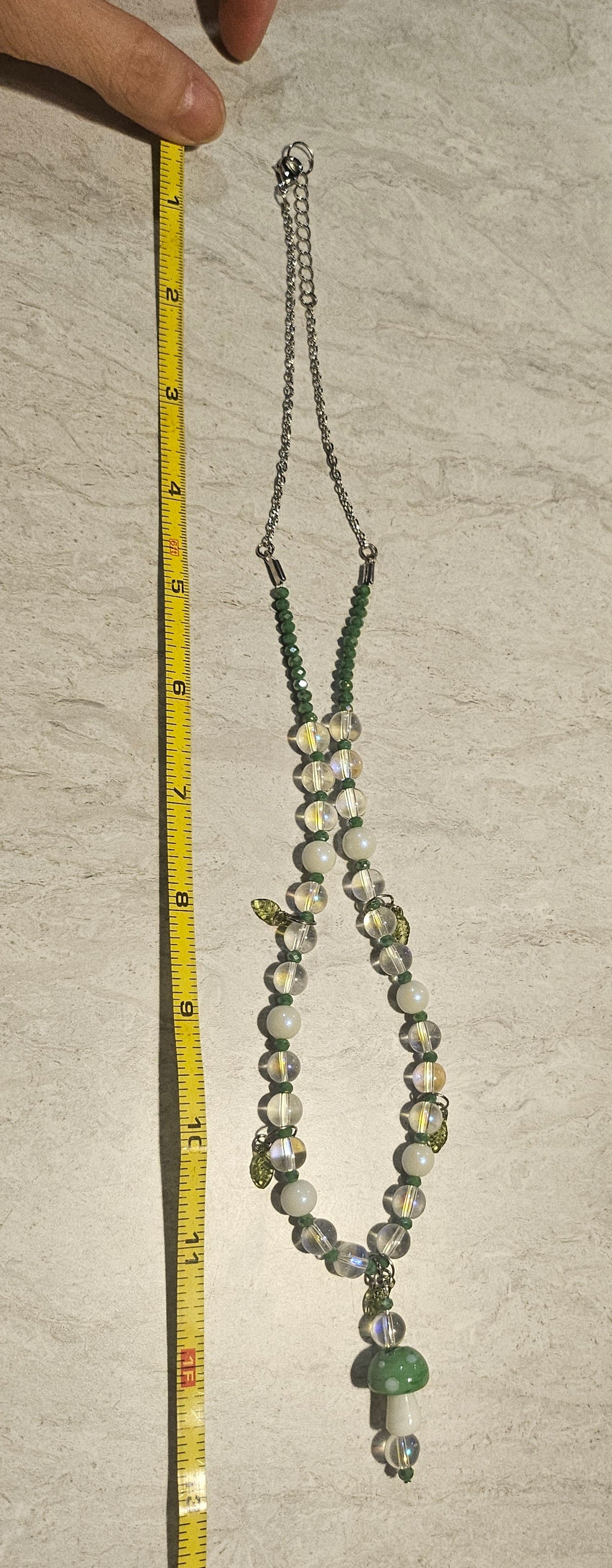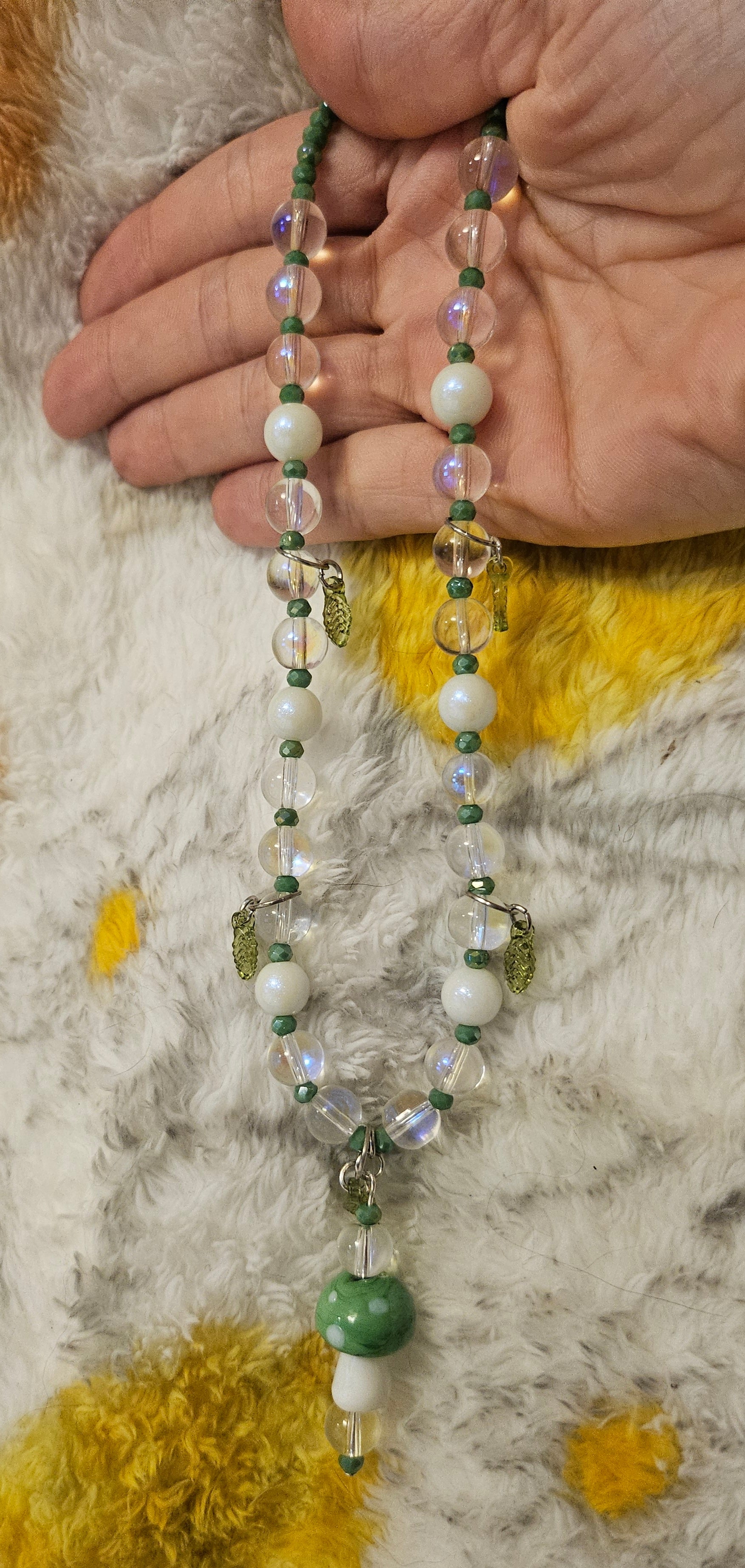 An 11" lobster clasp necklace featuring a light green glass mushroom bead, spaced with reflective glass beads and faux white pearls.