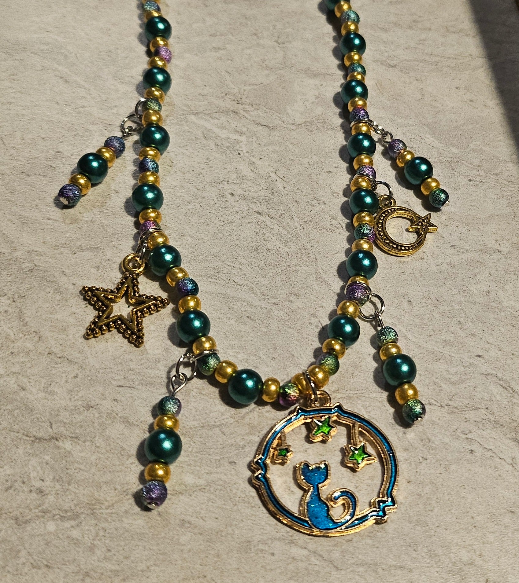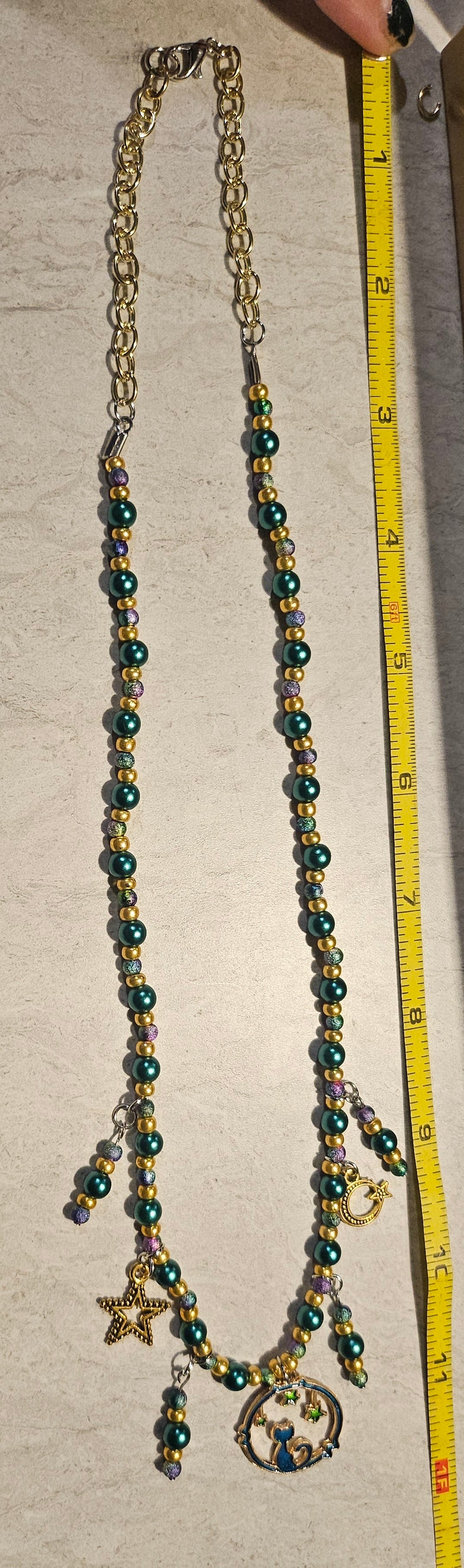 An 11" beaded necklace on beadalon string with a lobster clasp. The beads are turquoise, gold and green with a sitting kitty charm.