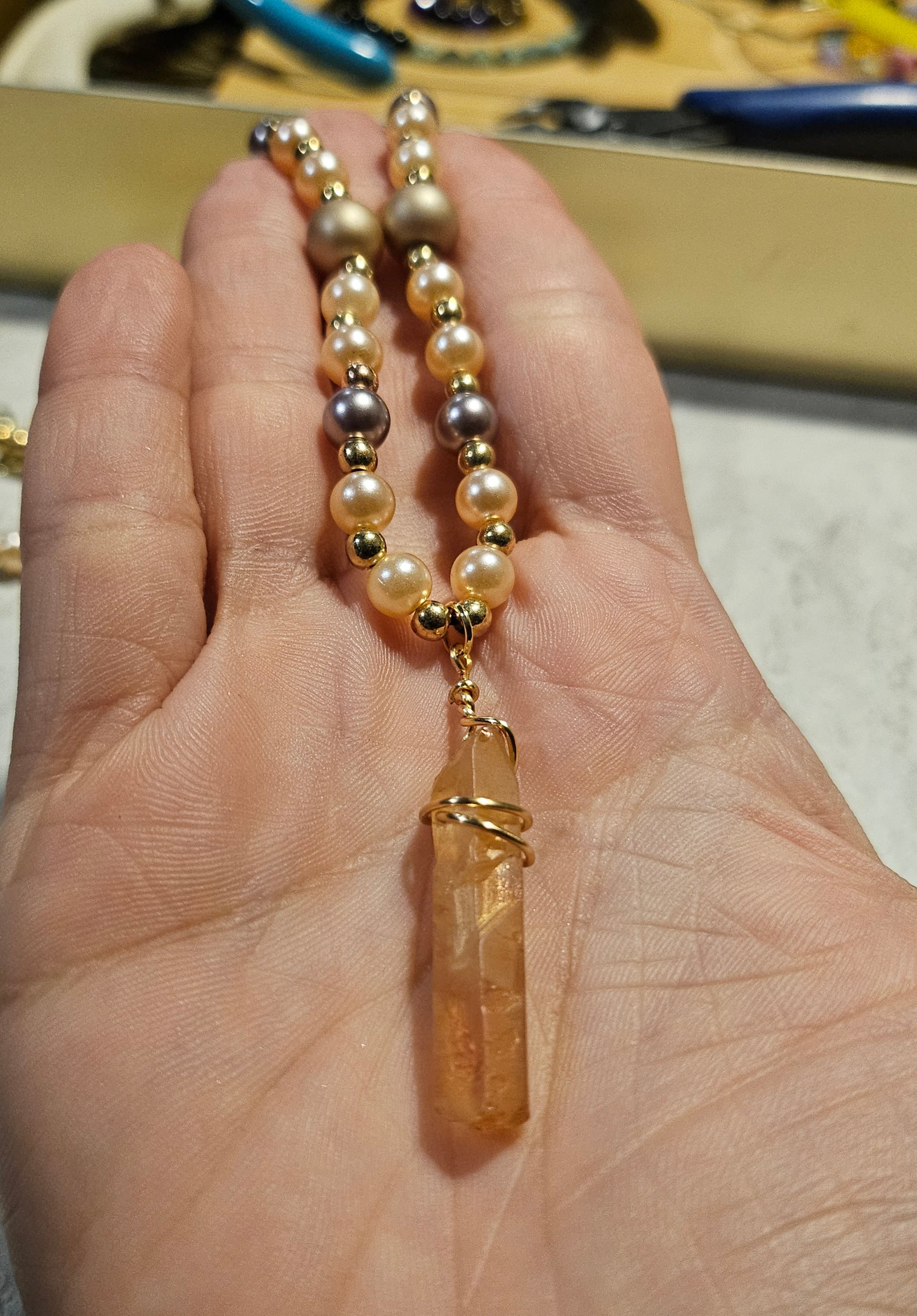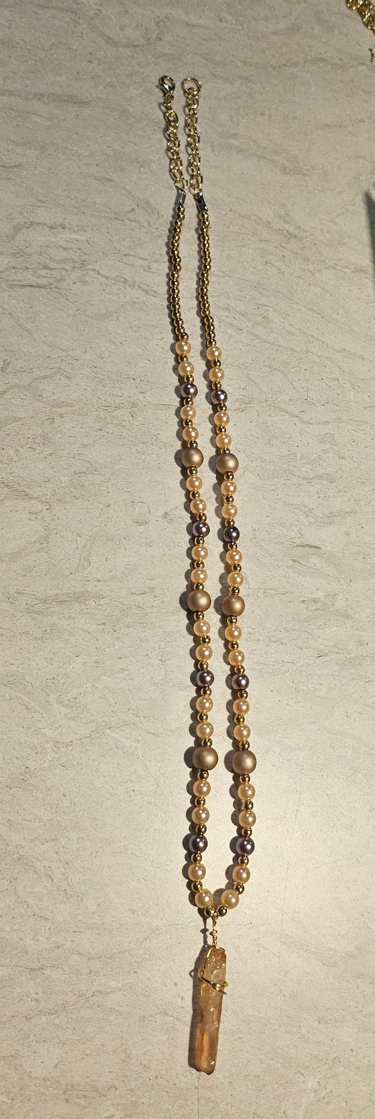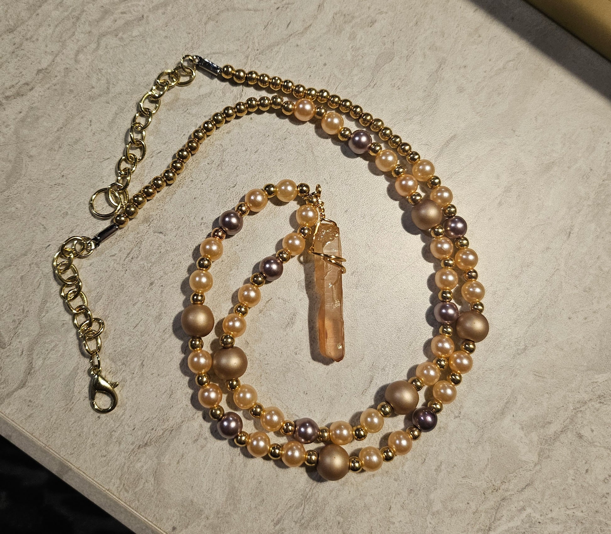 A 13" beaded lobster clasp necklace made with peach and cream colored beads with a soft orange wire wrapped crystal charm. On beadalon string with gold hardware