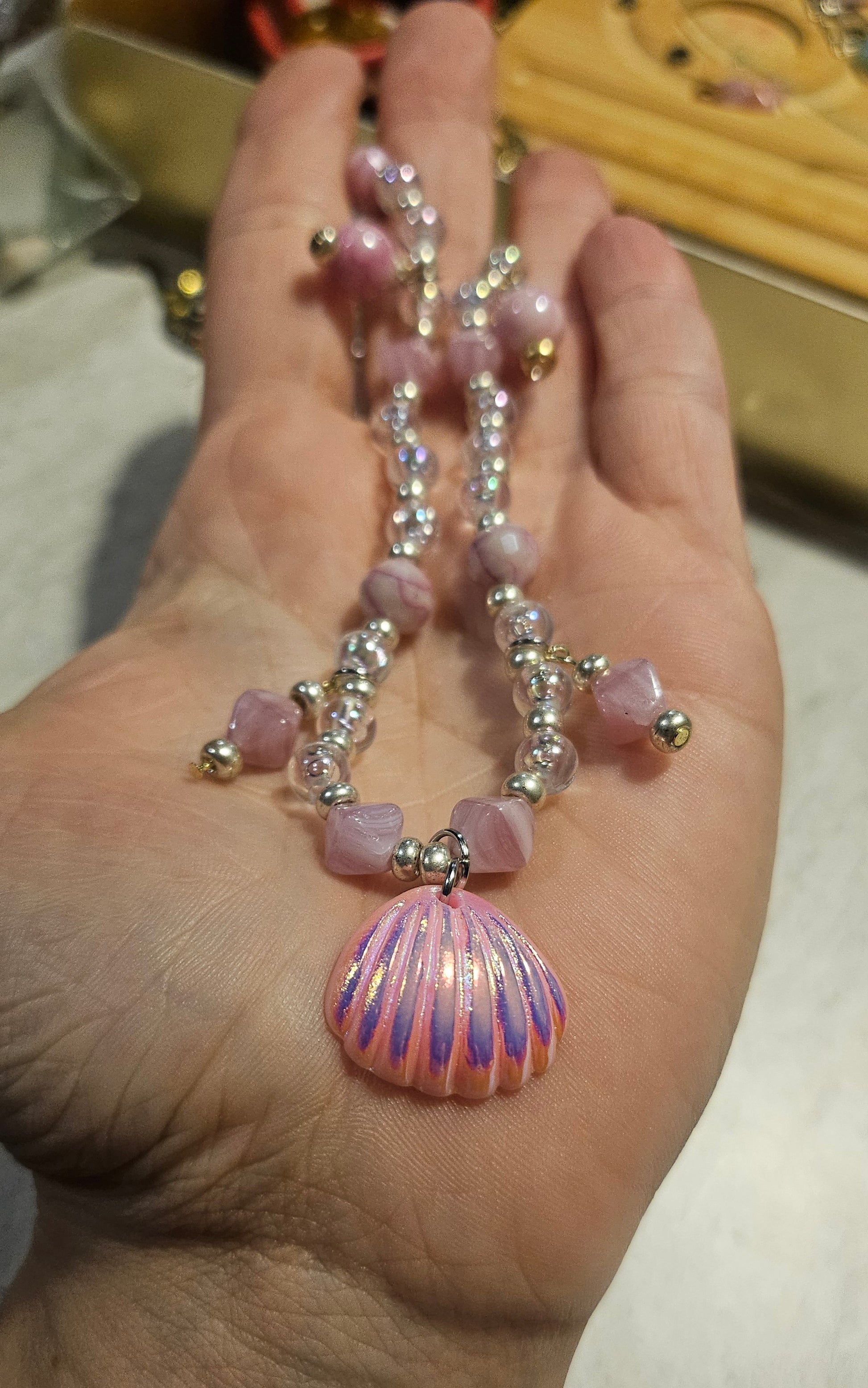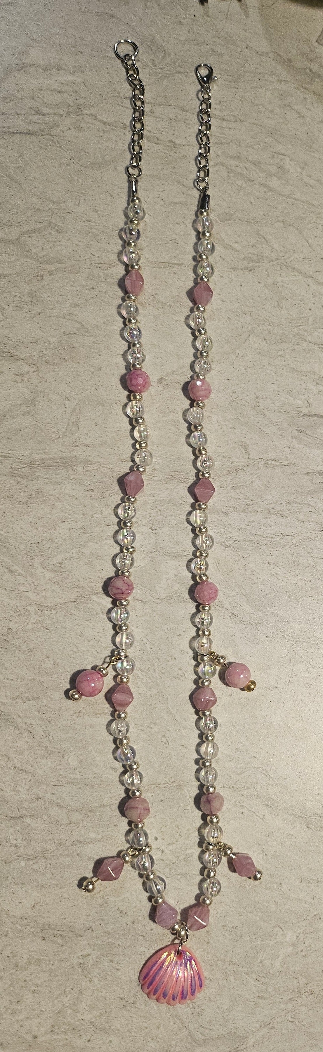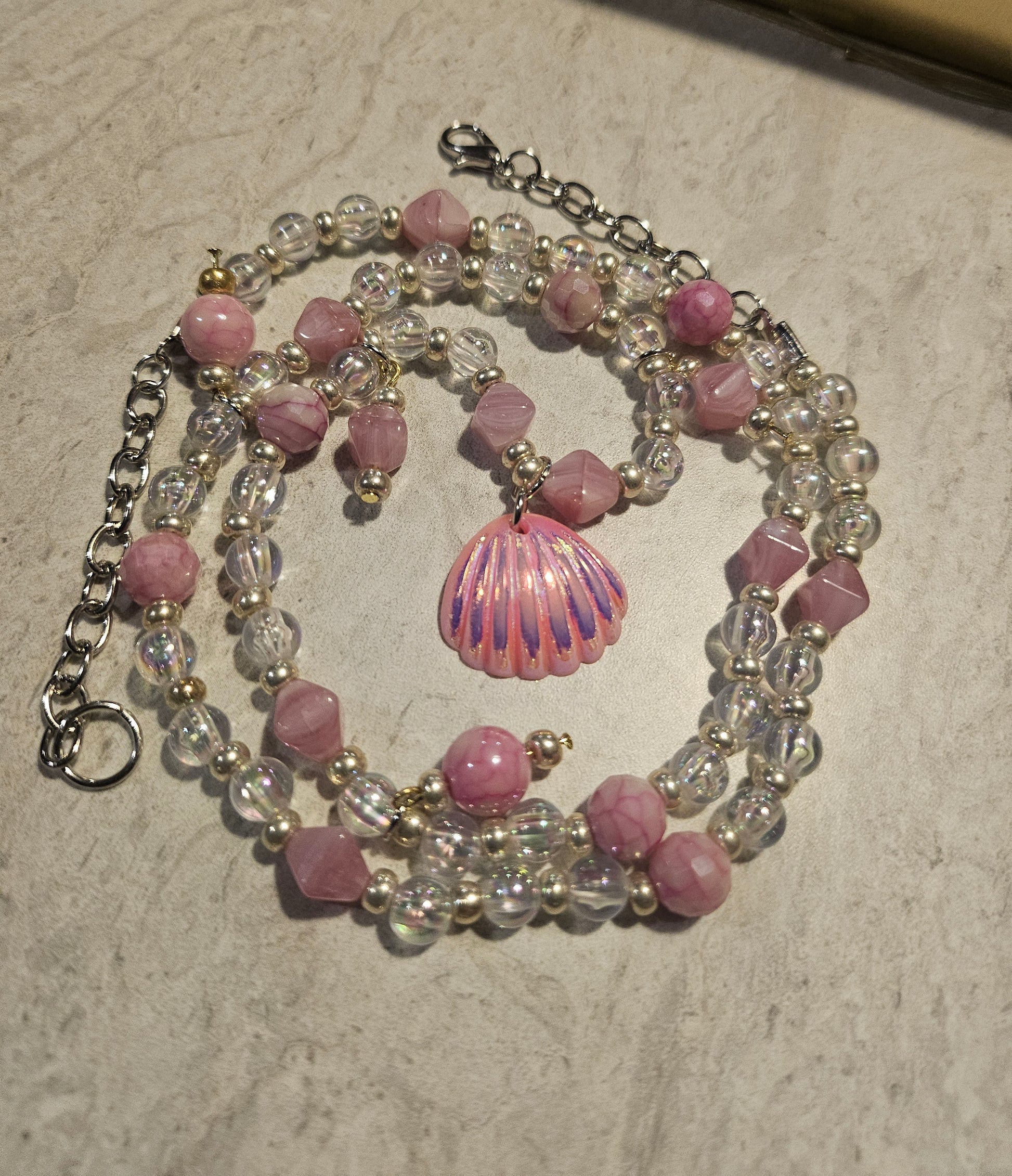 A 13" beaded necklace with silver hardware. The beads are pink and iridescent with champagne bead for a spacer. The charm is an iridescent pink shell.