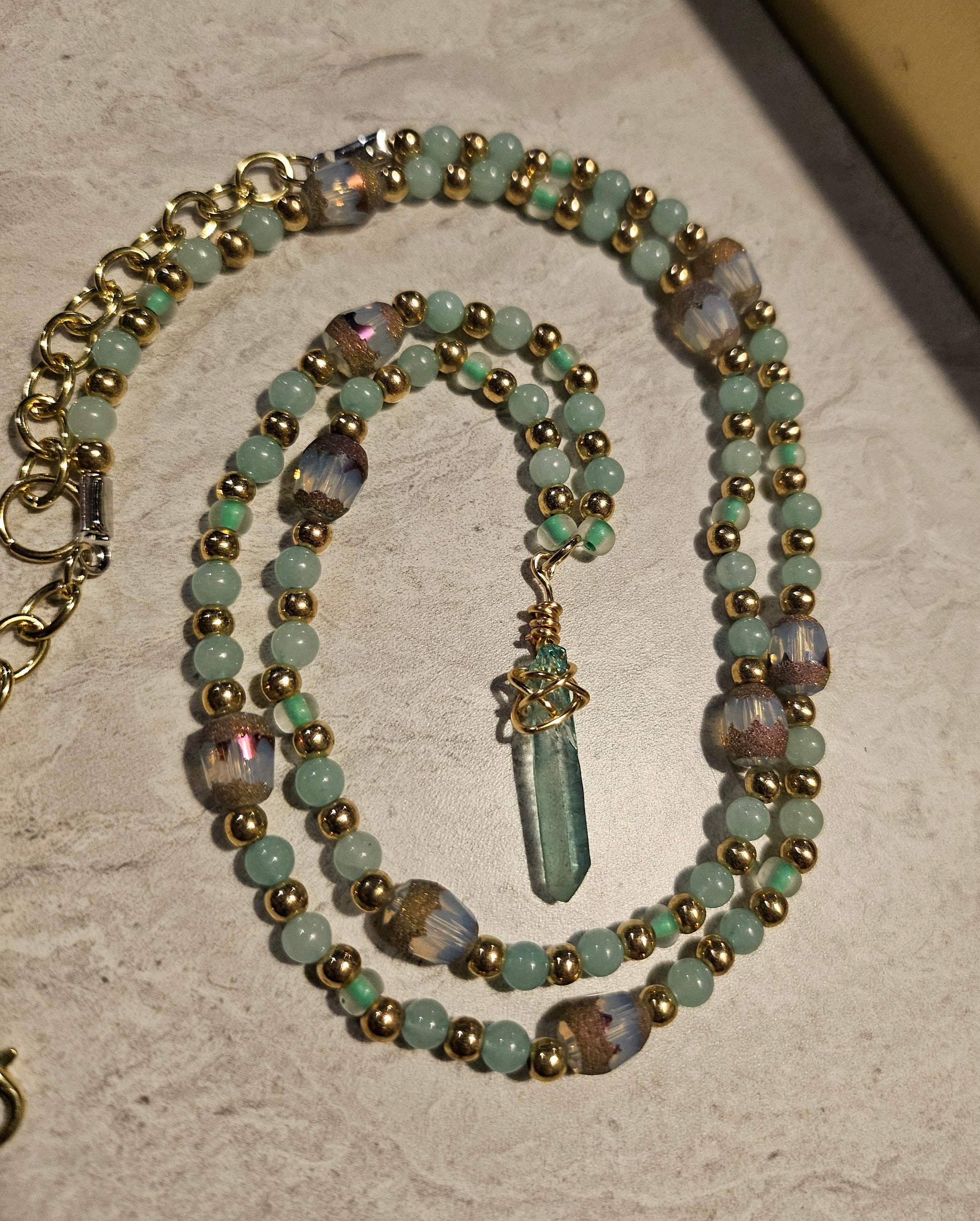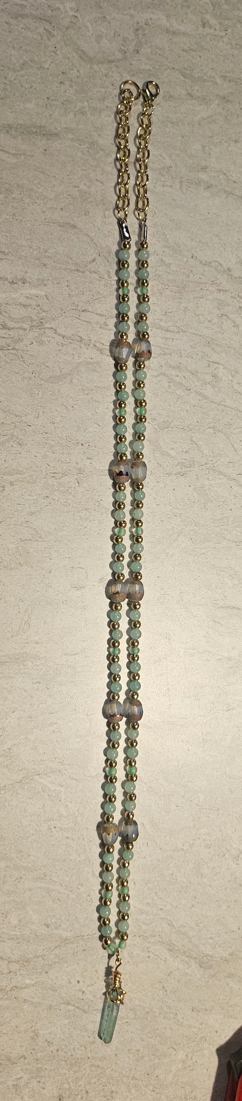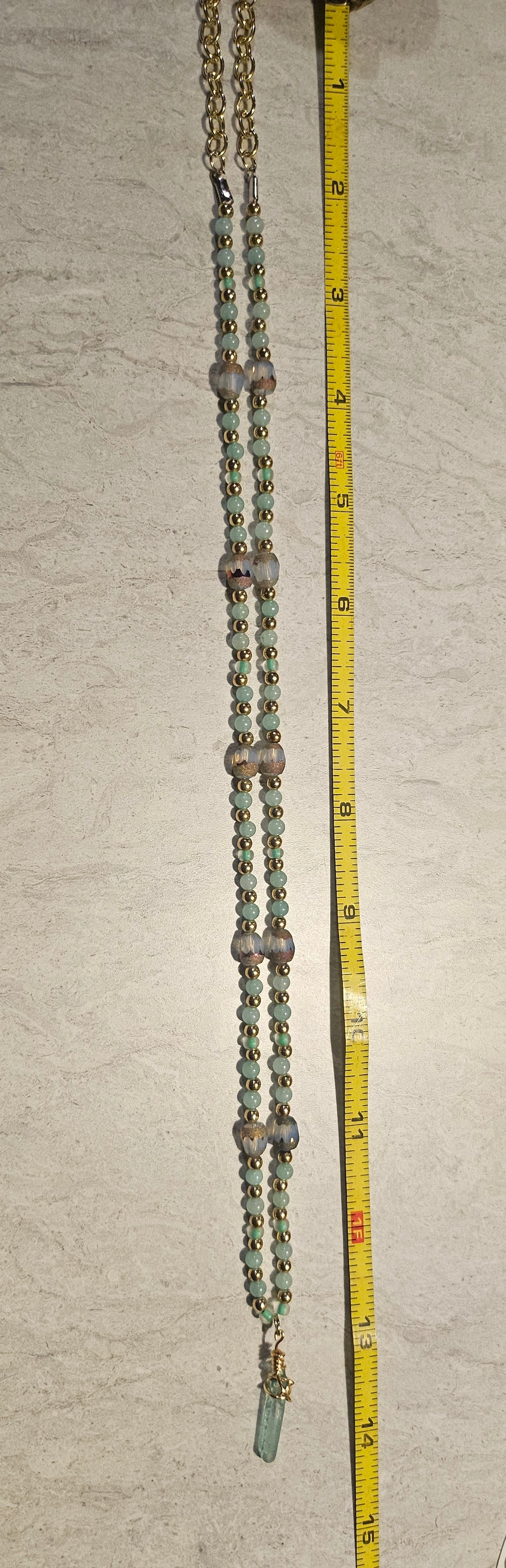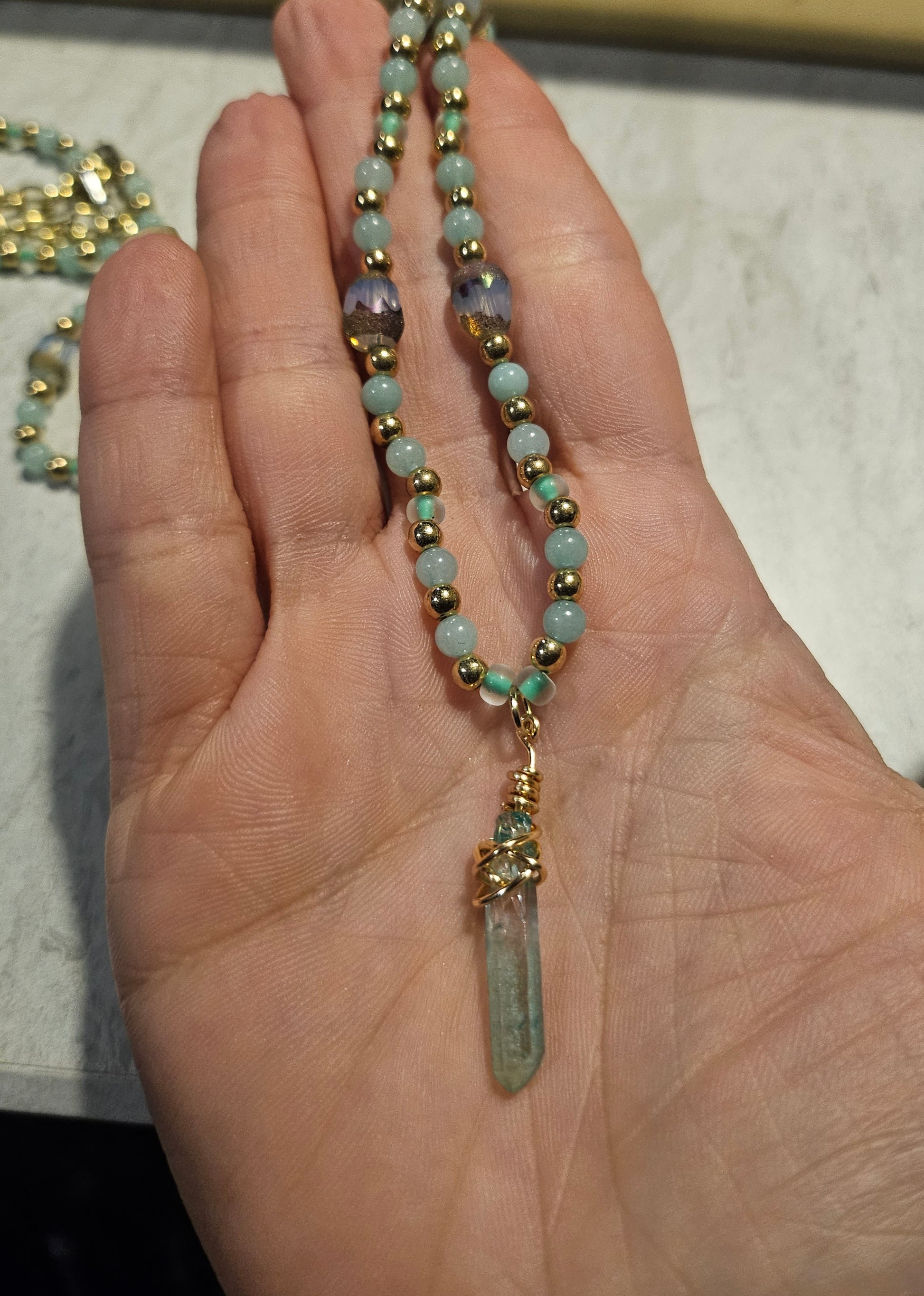 A 13" beaded lobster clasp necklace made with amanzonite and gold spacer beads with a teal wire wrapped crystal charm. On beadalon string with gold hardware