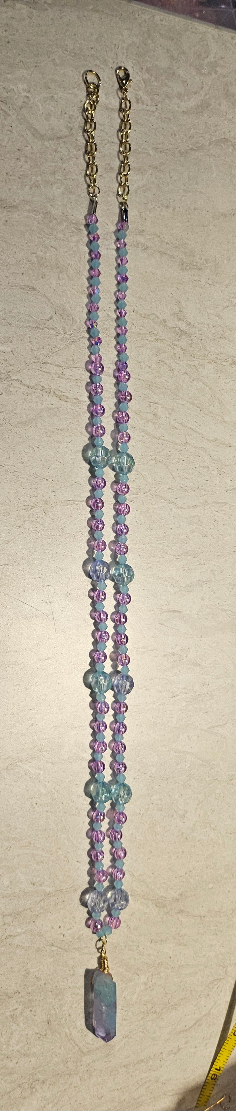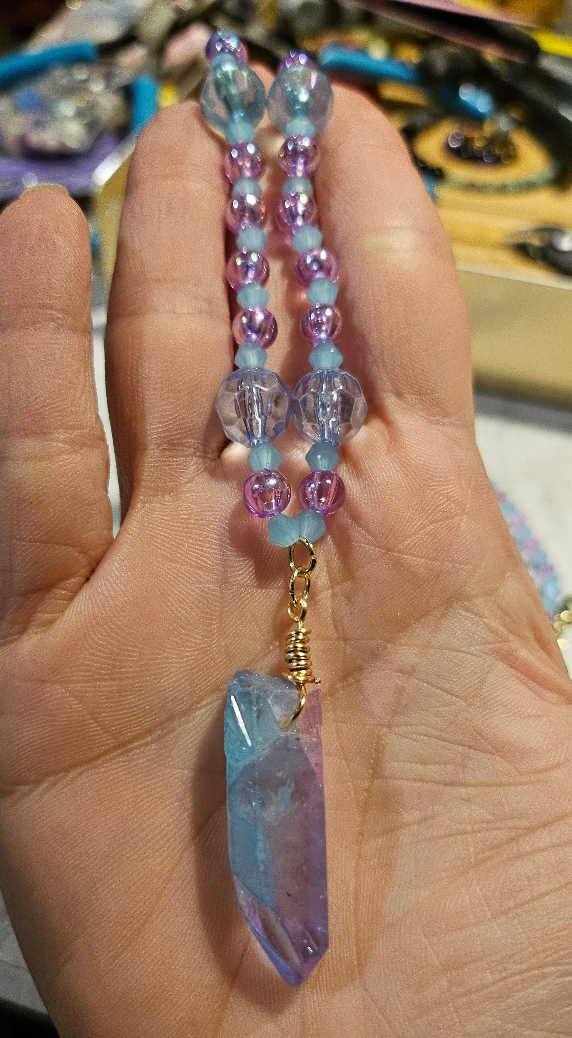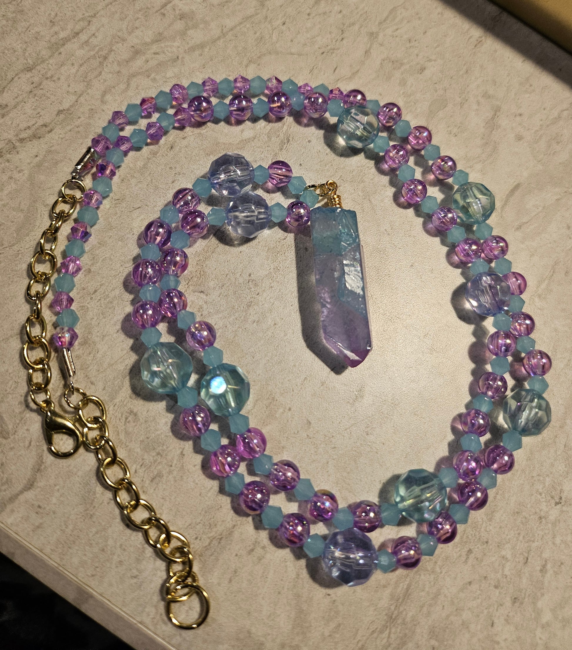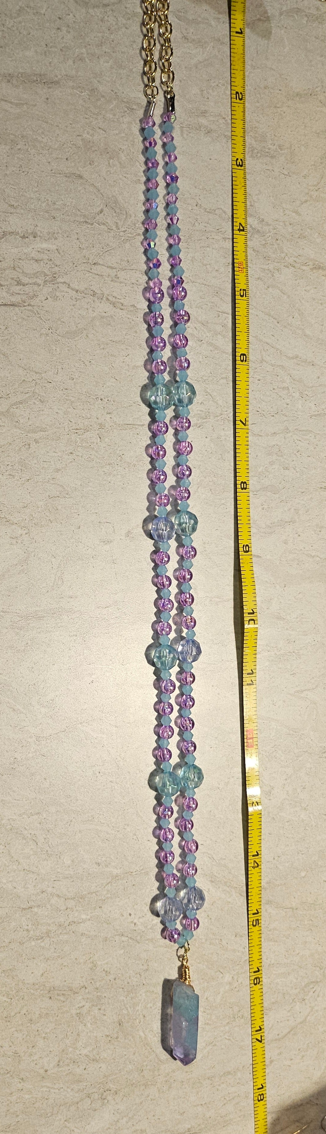 A 16" beaded necklace with gold hardware and a lobster clasp finish. The beads are light blue and pinky/purple on beadlon string with a dyed blue/pink crystal charm.