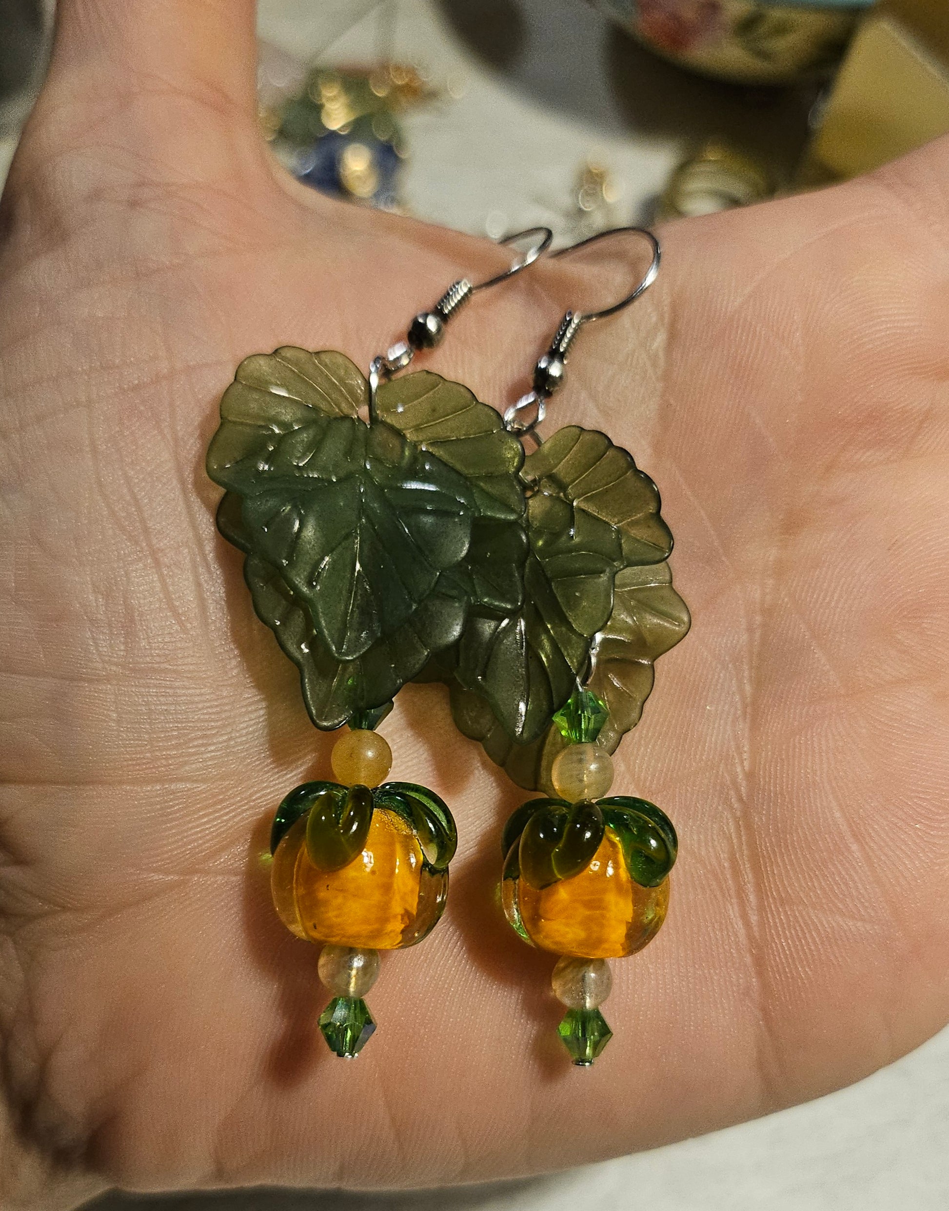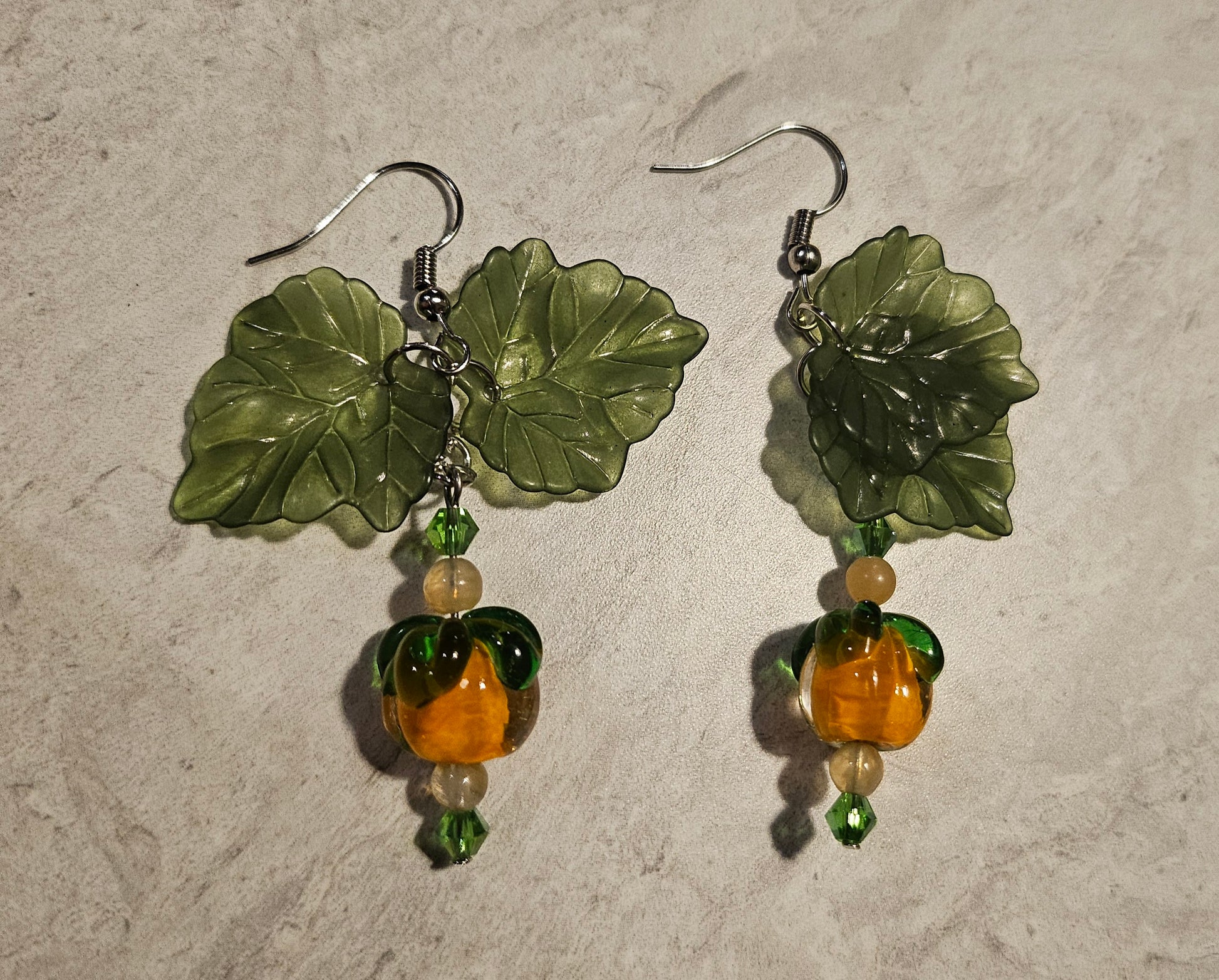 A pair of 2.5" earrings made with glass orange beads, spaced with citrine and green glass beads on a silver eye pin with fishook earrings.