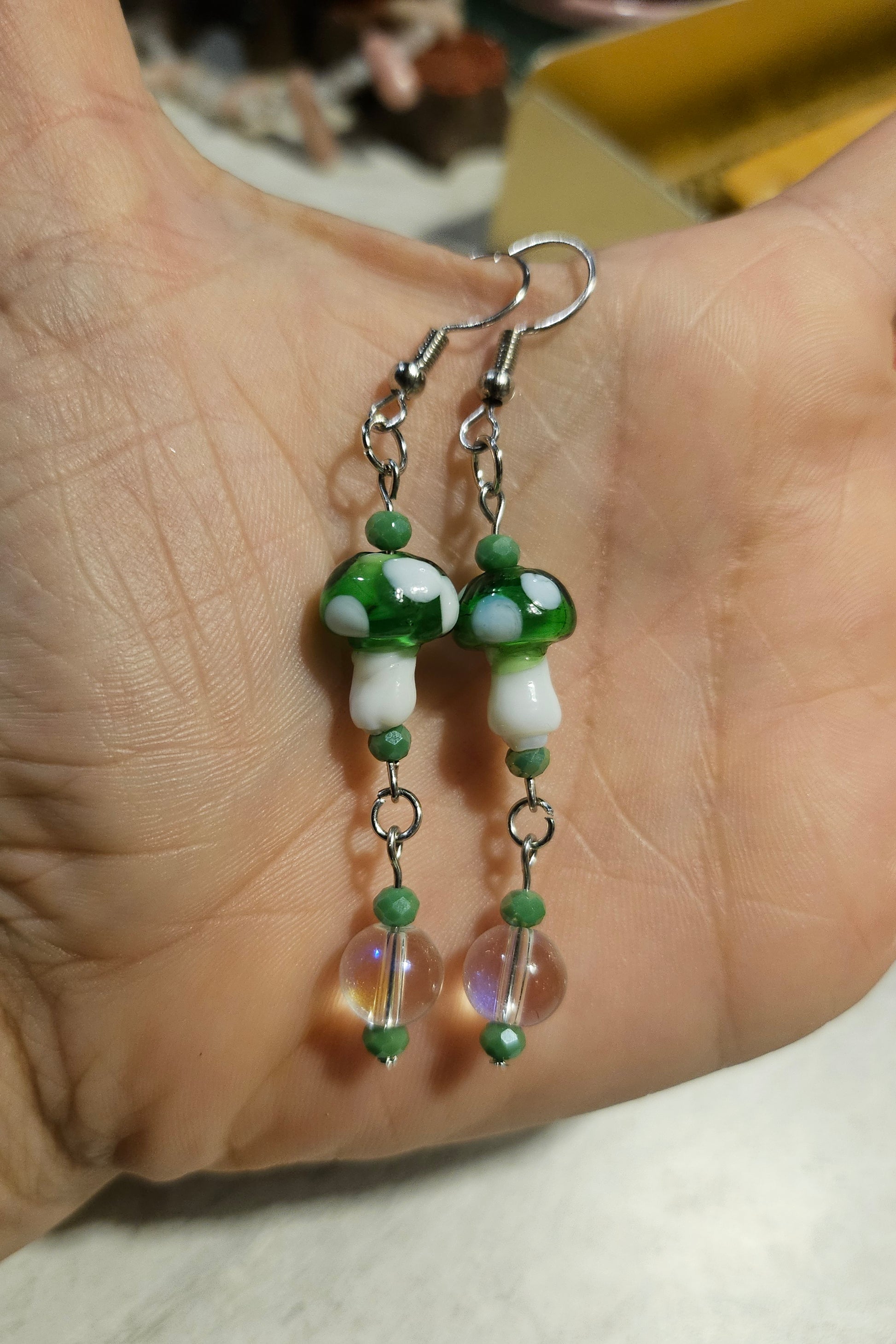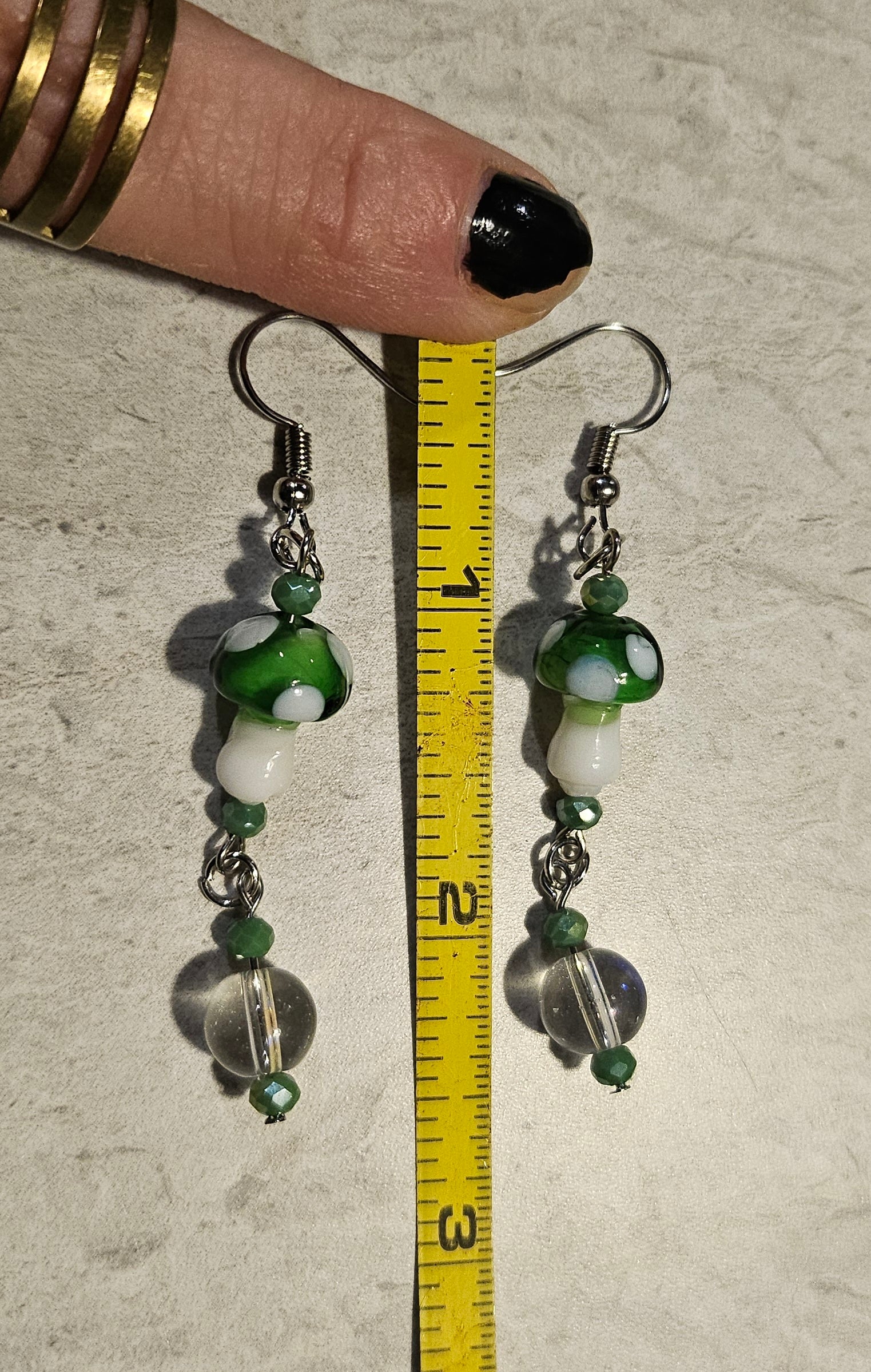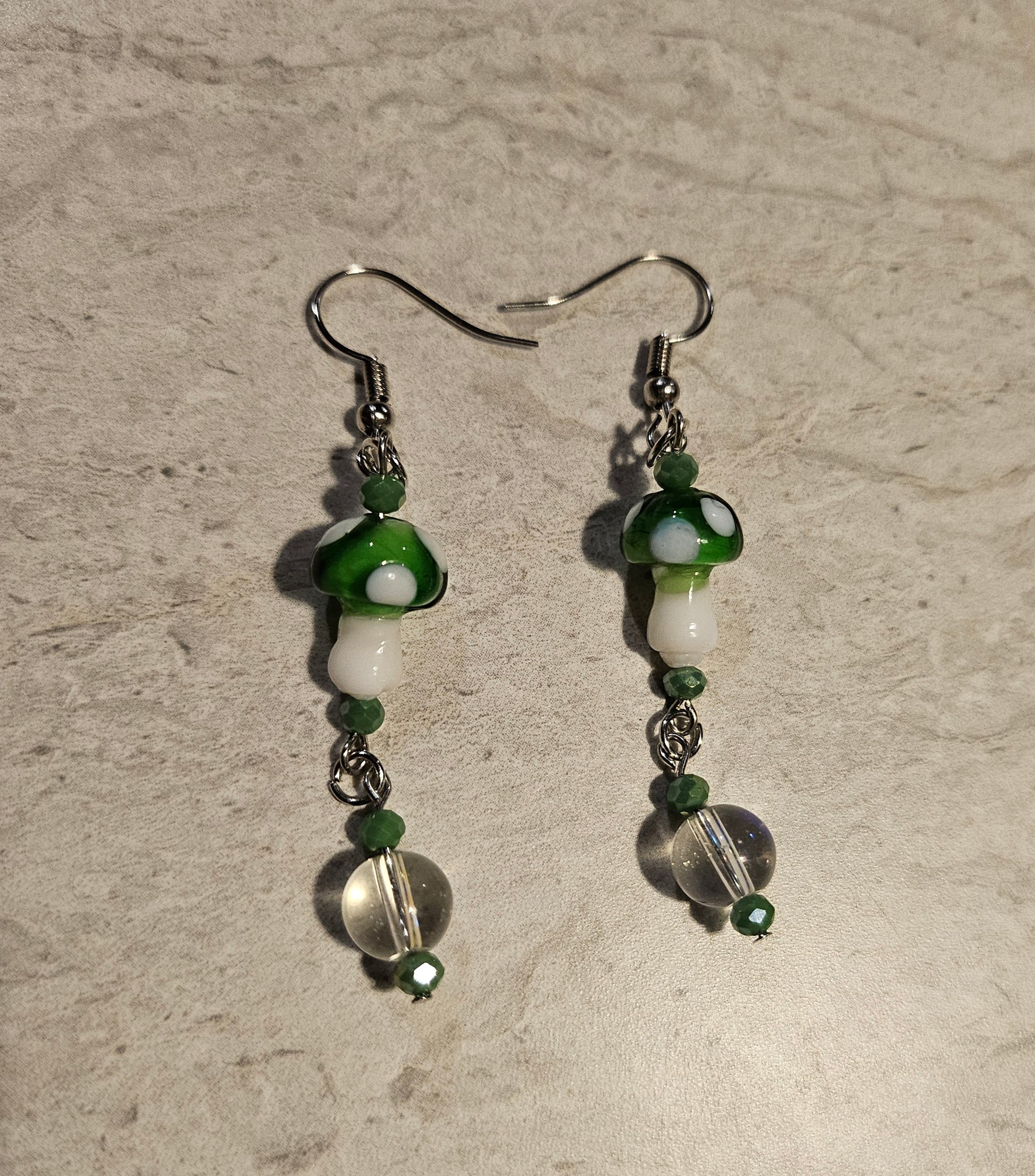 A pair 2.5" fishook earrings made with green glass mushroom beads and an iridescent bead dangle