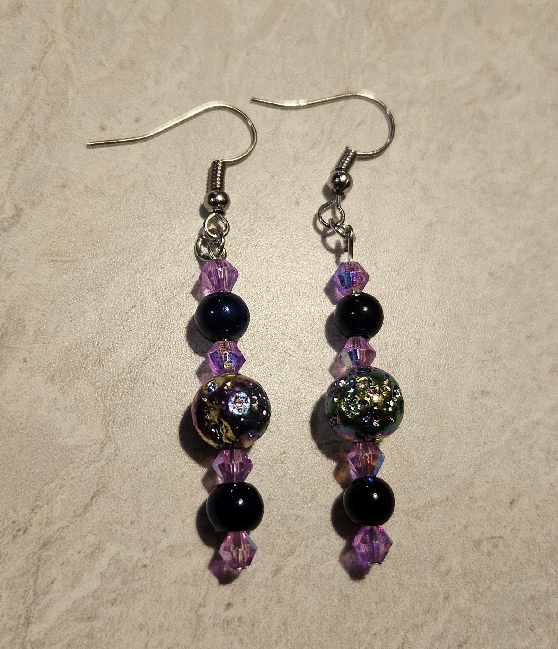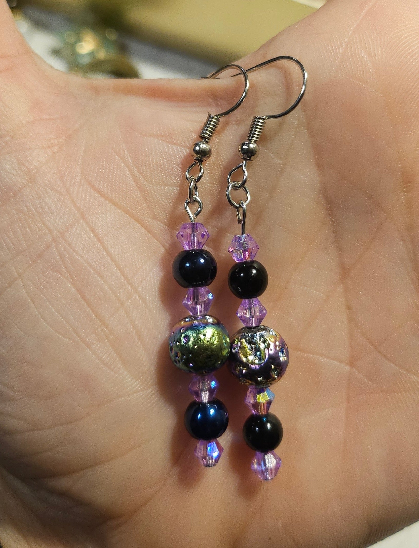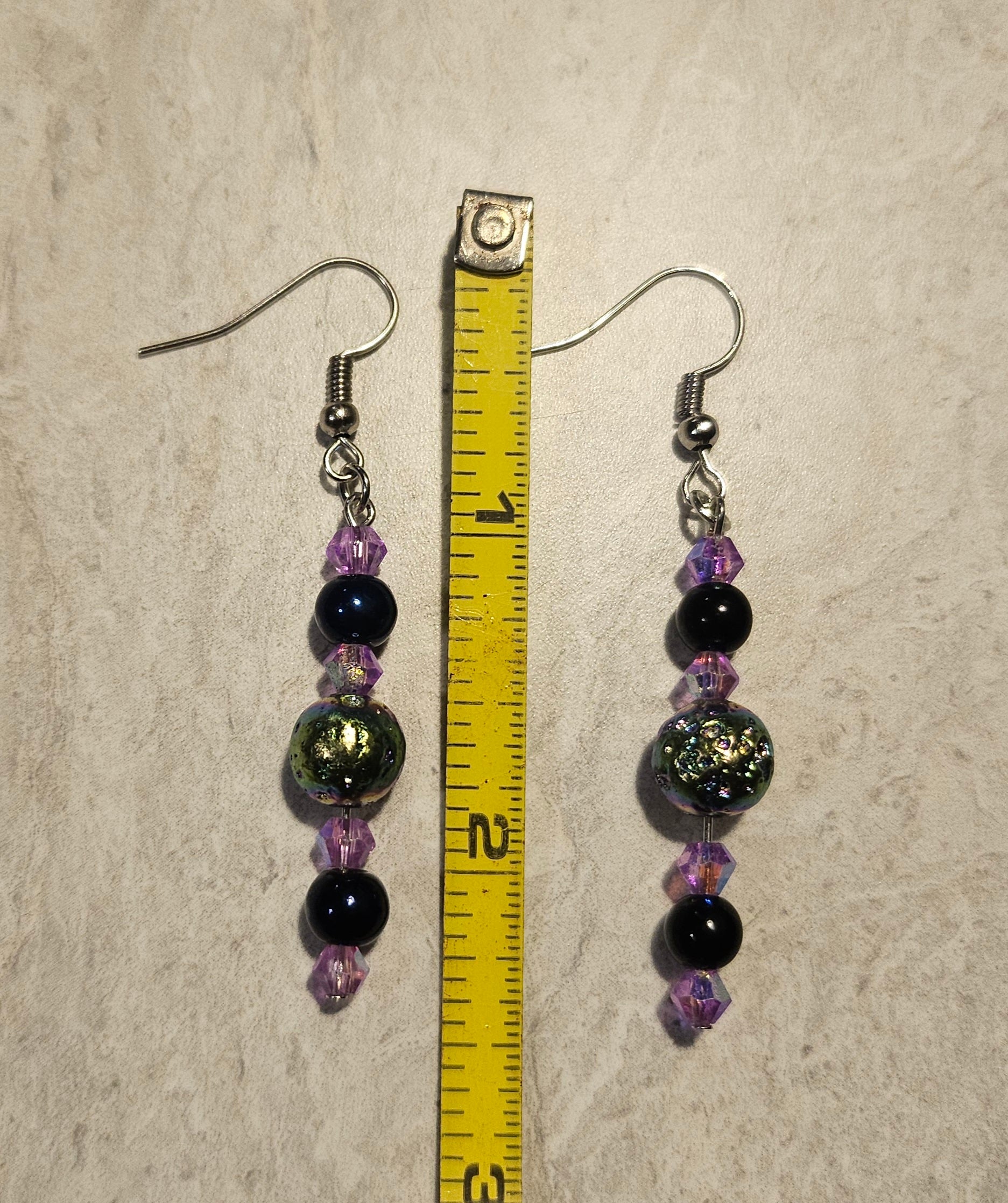 A pair 2" earrings made with iridescent lava rock and black beads spaced with purple glass beads on a silver eye pin with fishook earrings.