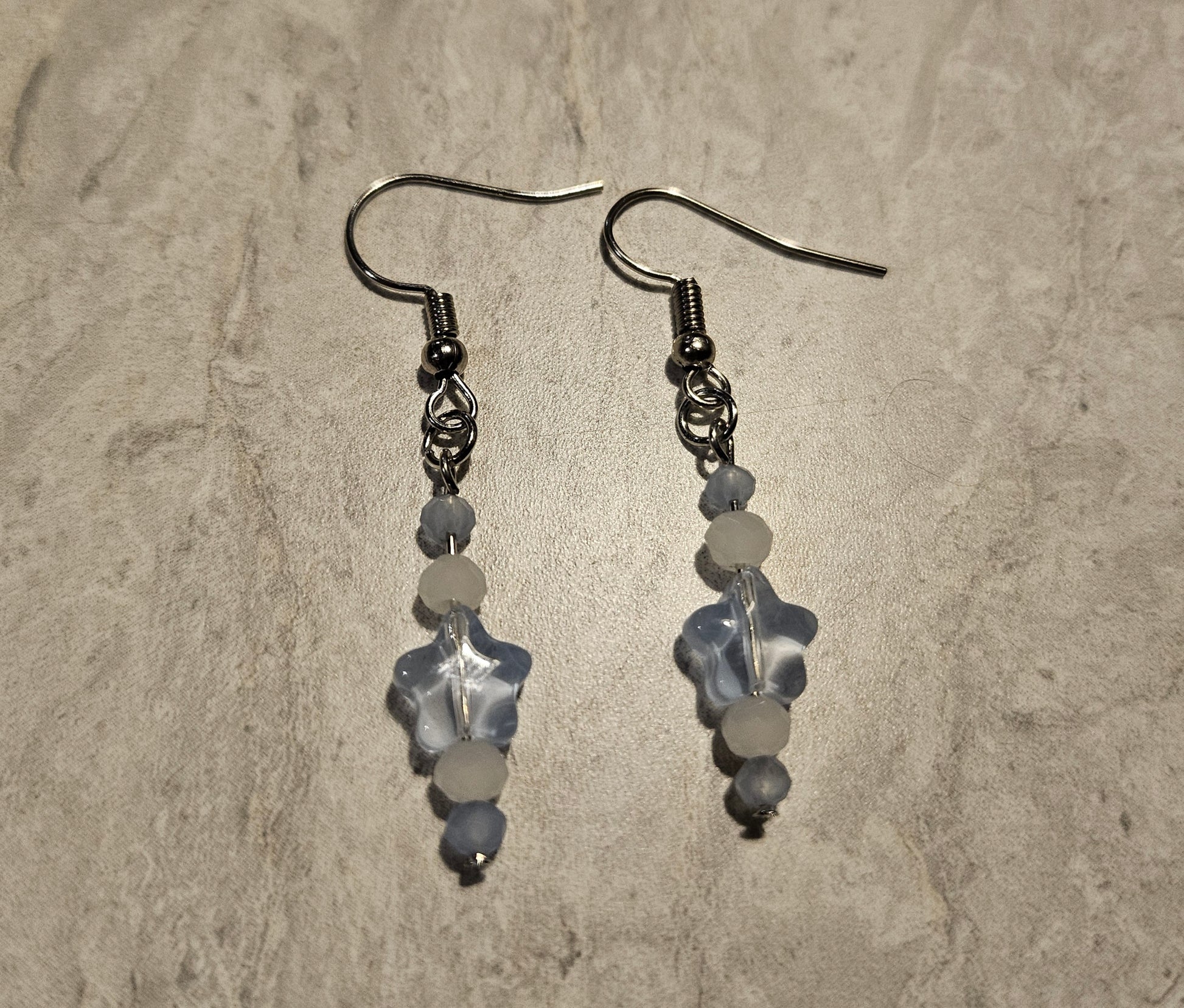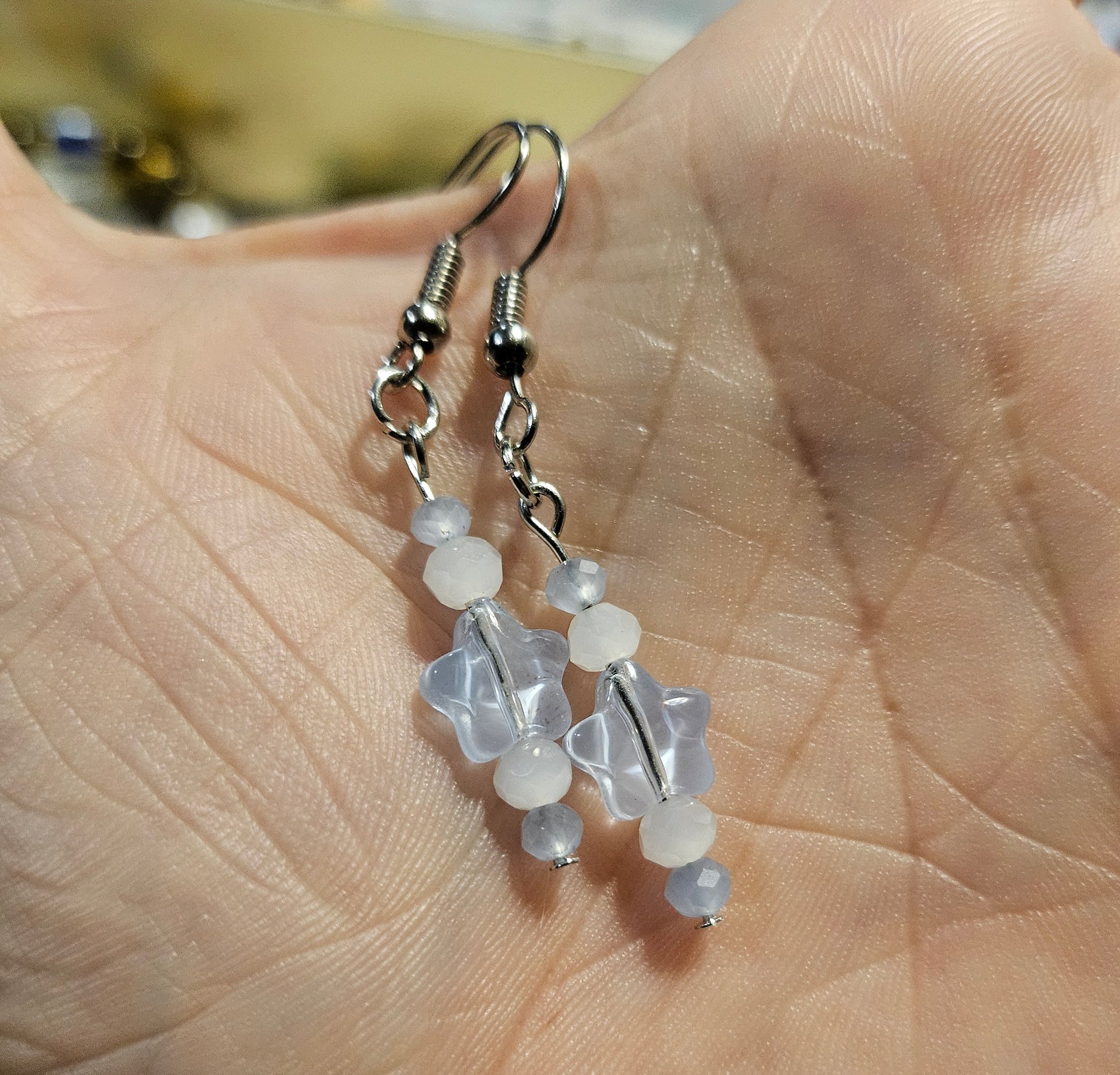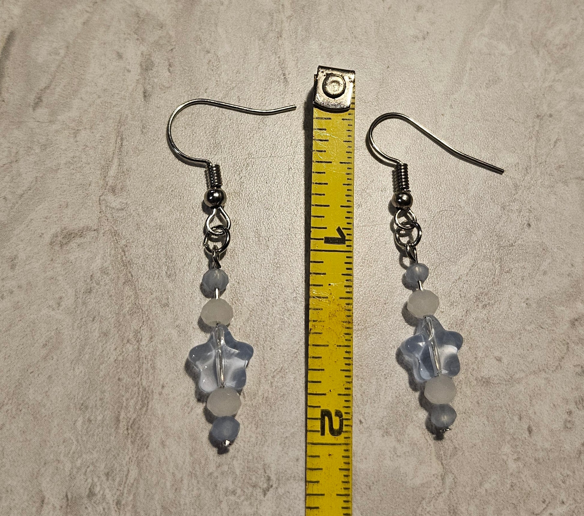 A pair 2" earrings made with light blue stars and white glass beads on a silver eye pin with fishook earrings.