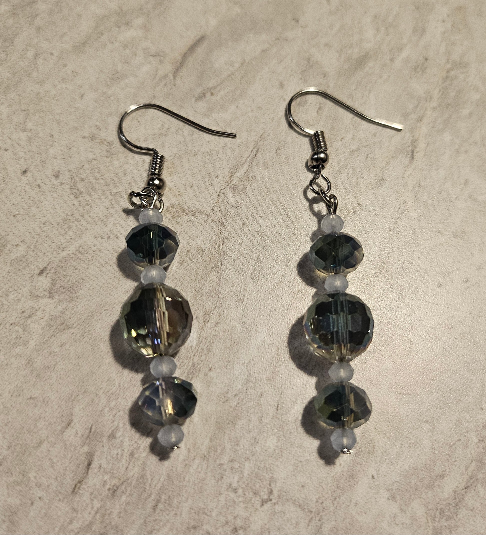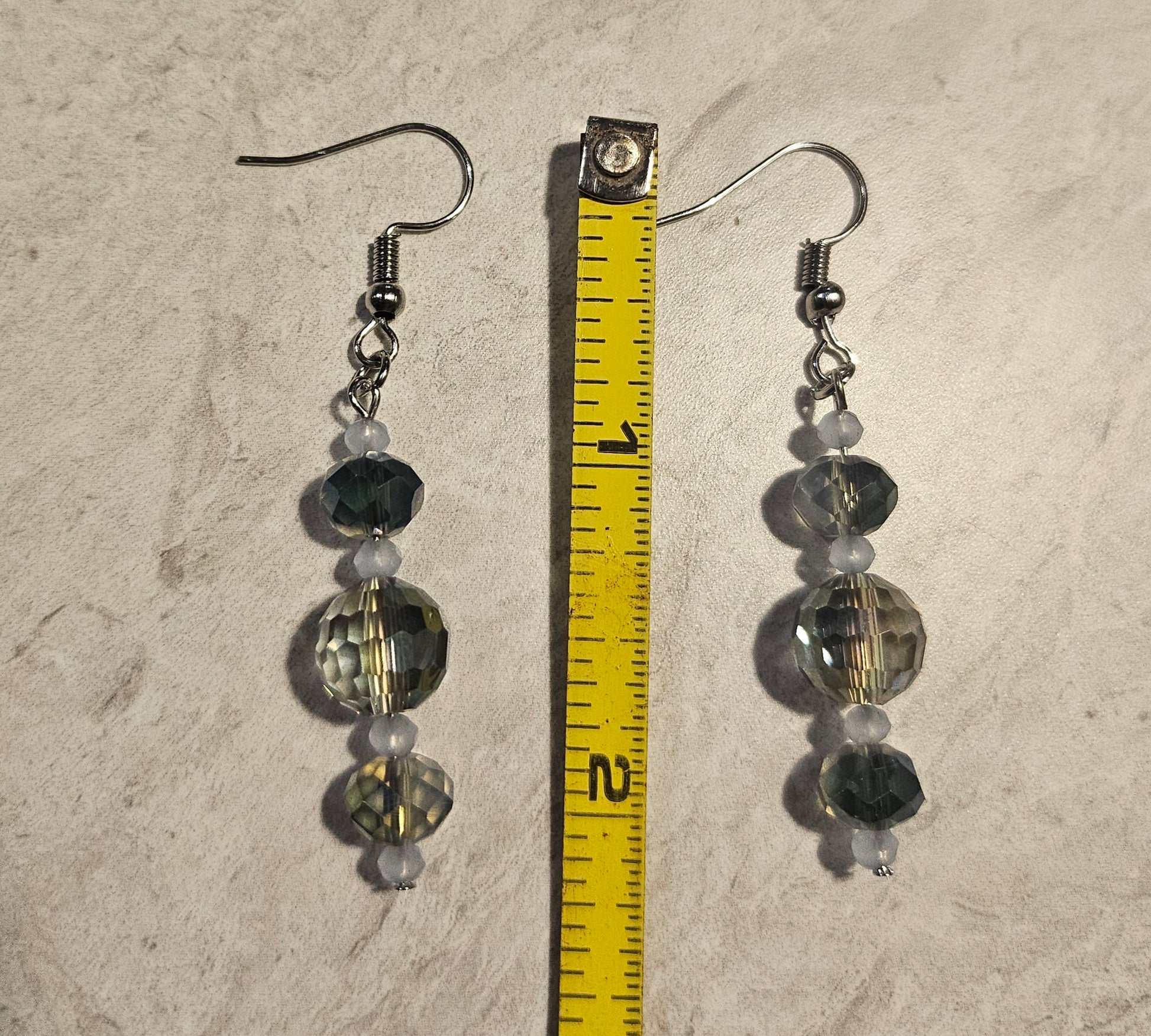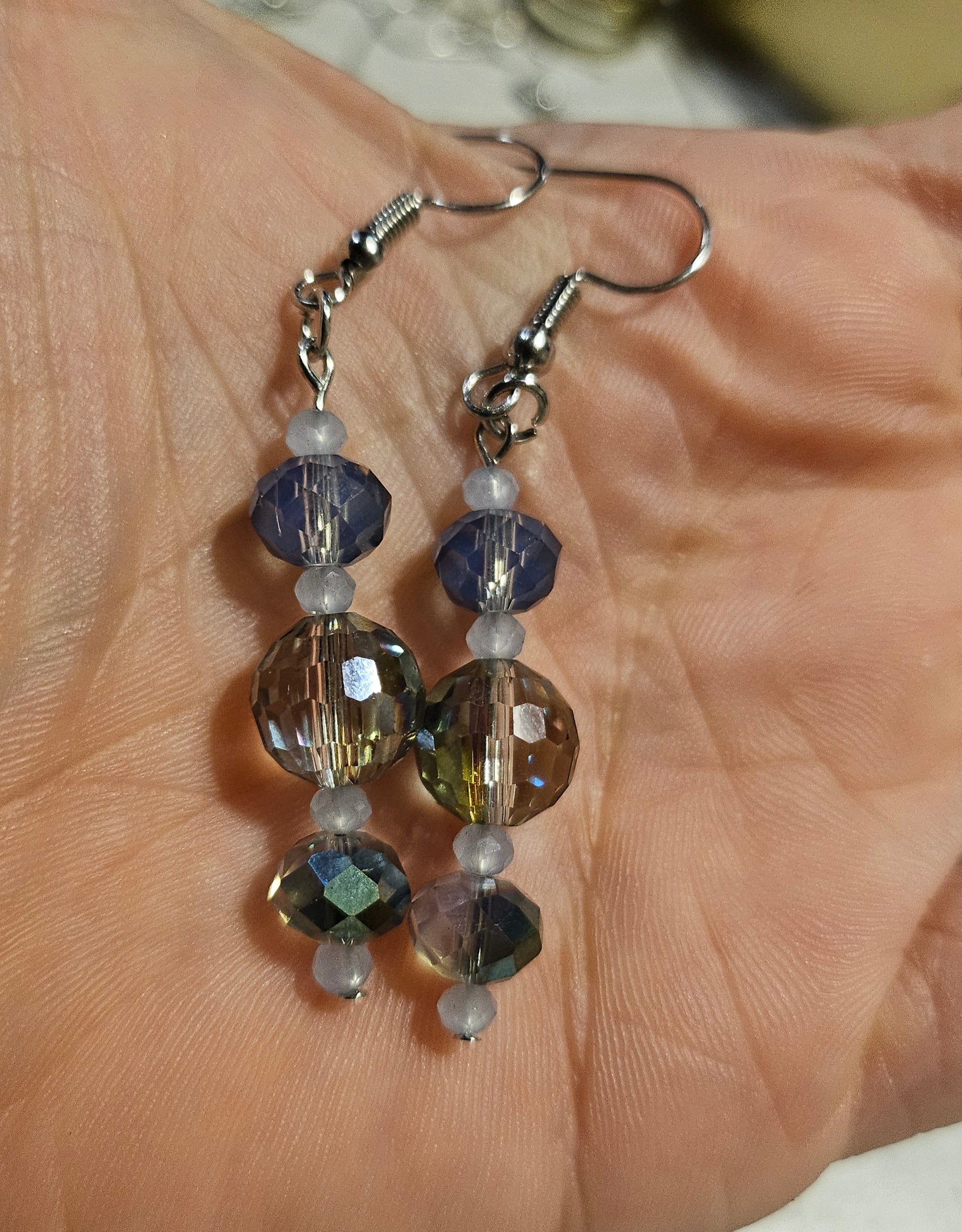 A pair 2" earrings made with blue iridescent glass beads on a silver eye pin with fishook earrings.