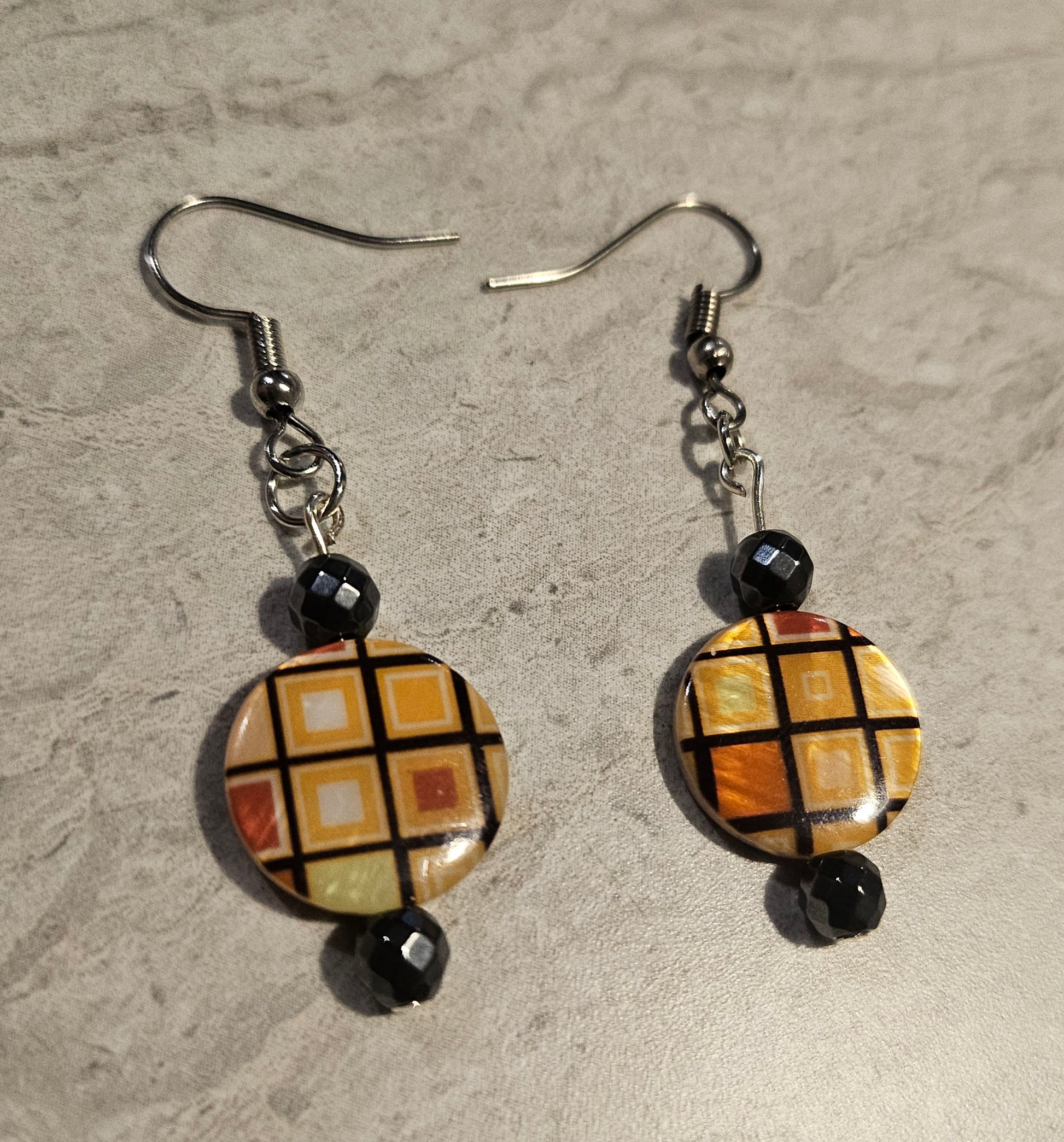 A pair of 2" fishhook earrings, featuring black and orange checkered disks with a Hematite bead on top and bottom of the disk.