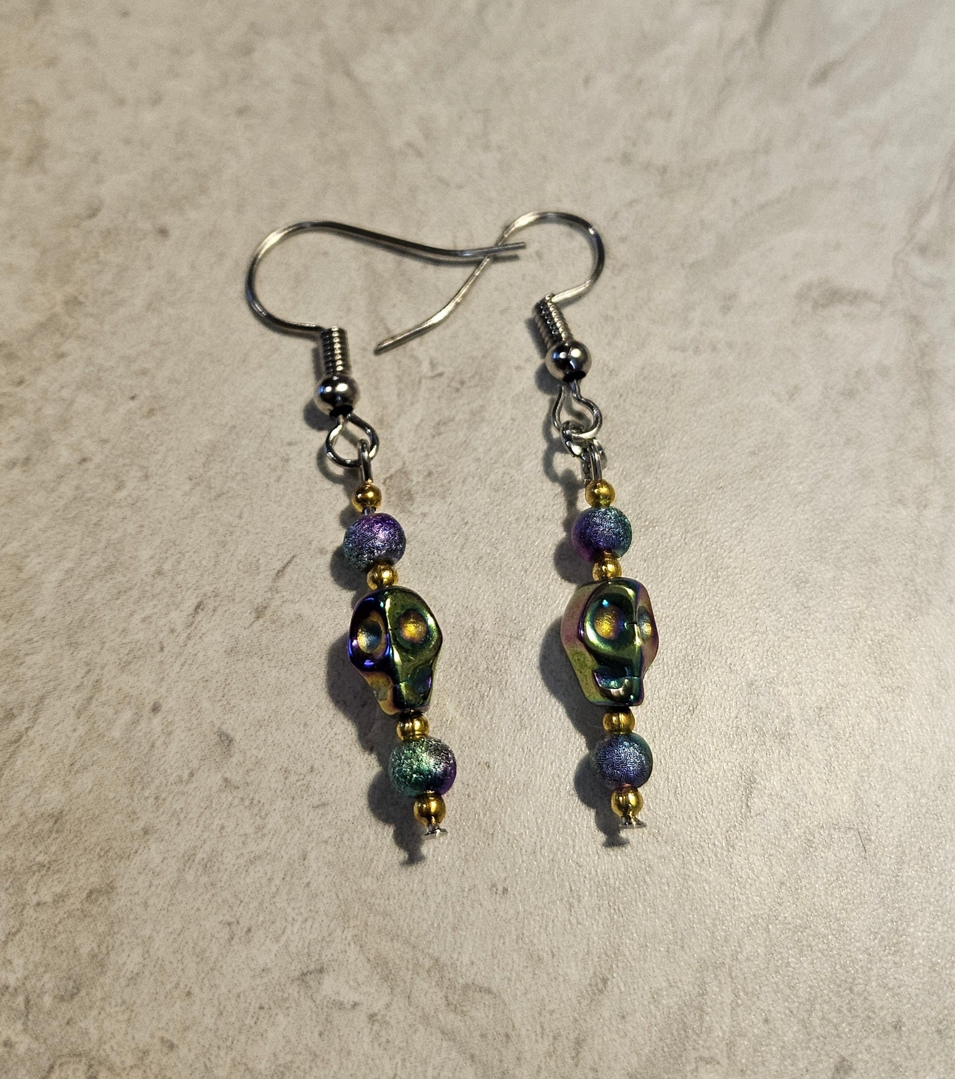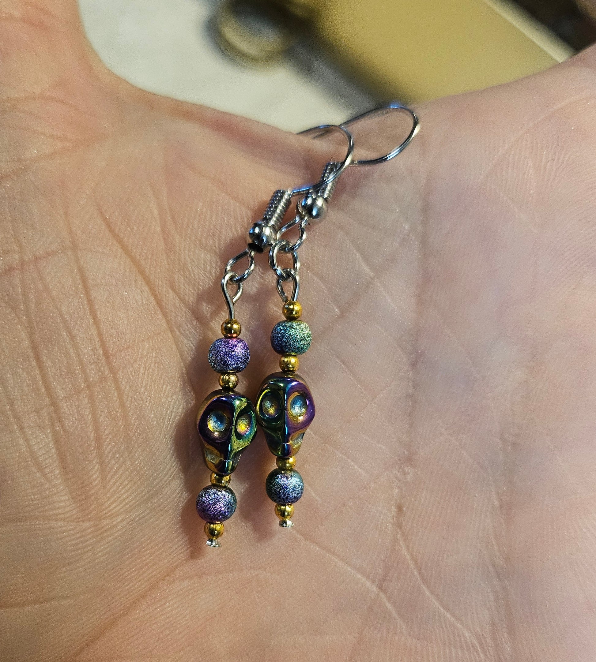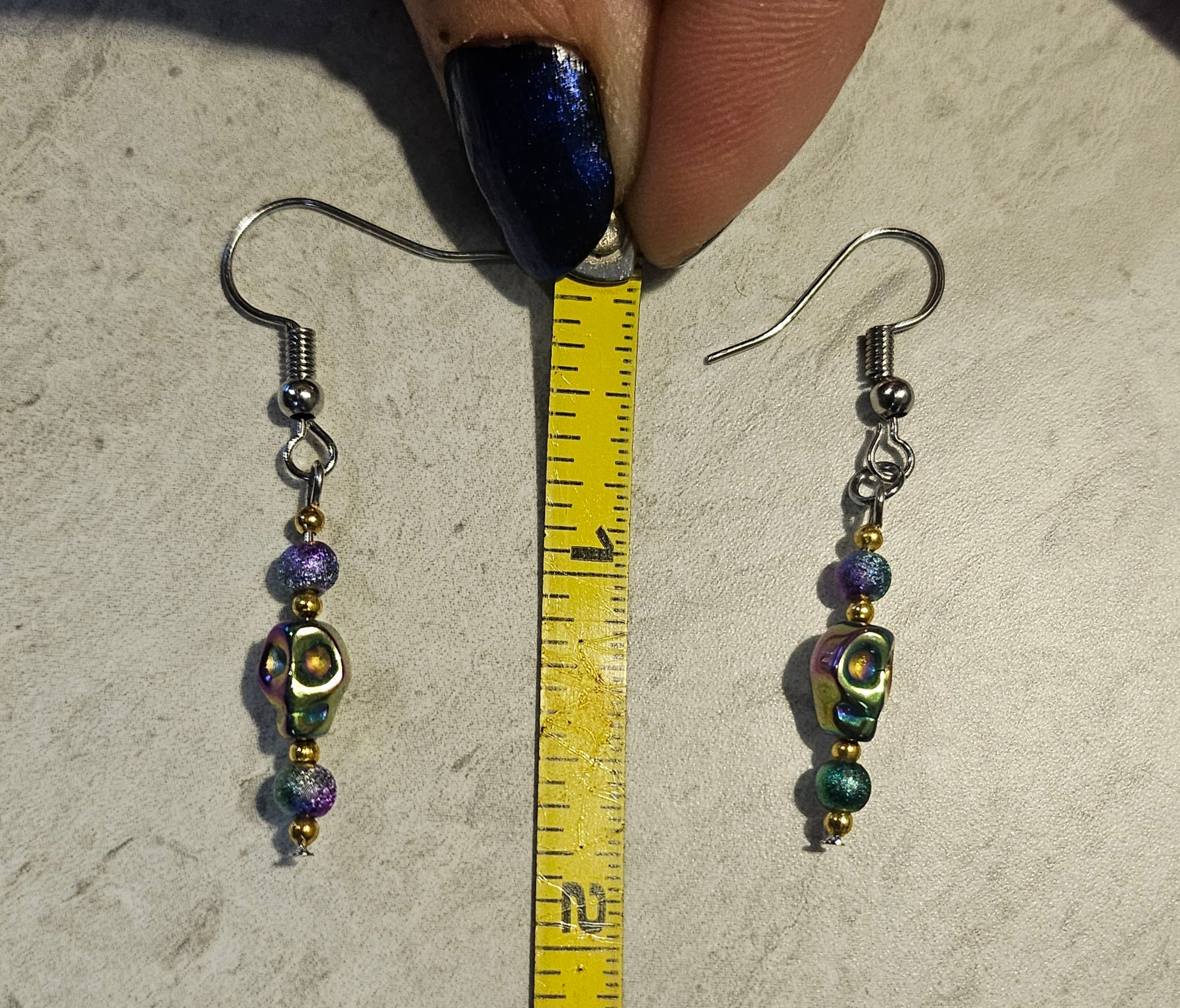 A pair of 2" fishhook earrings made with purple iridescent skull beads.