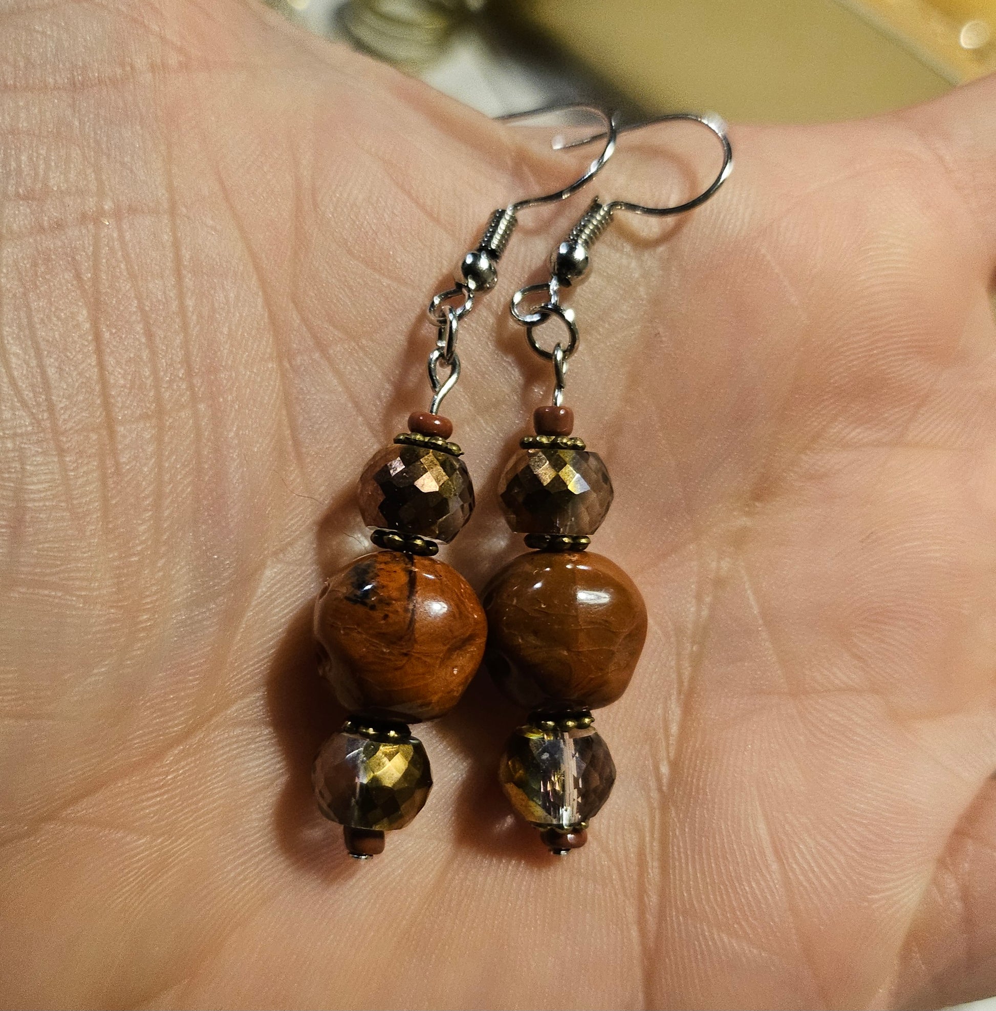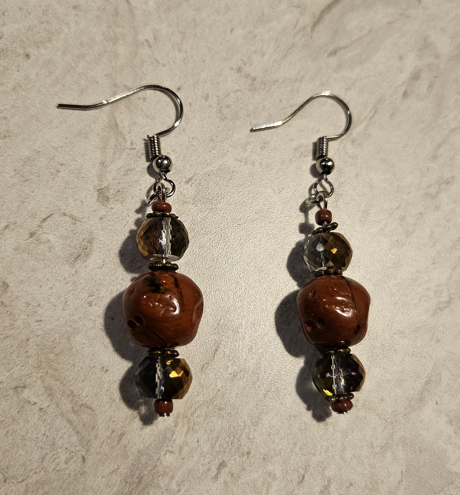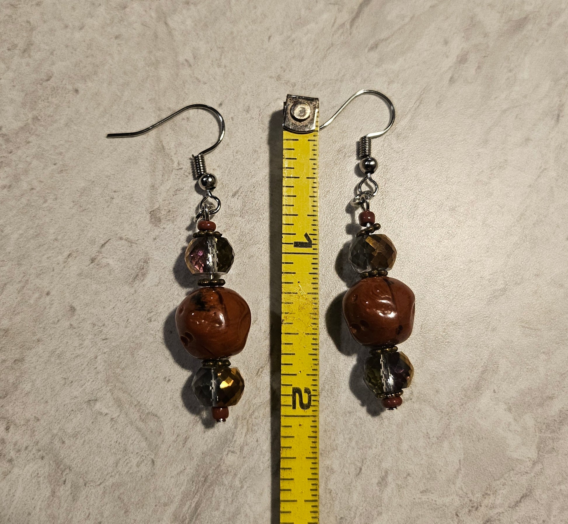 A pair 2" earrings made with maroon beads spaced with iridescent brown beads on a silver eye pin with fishook earrings.