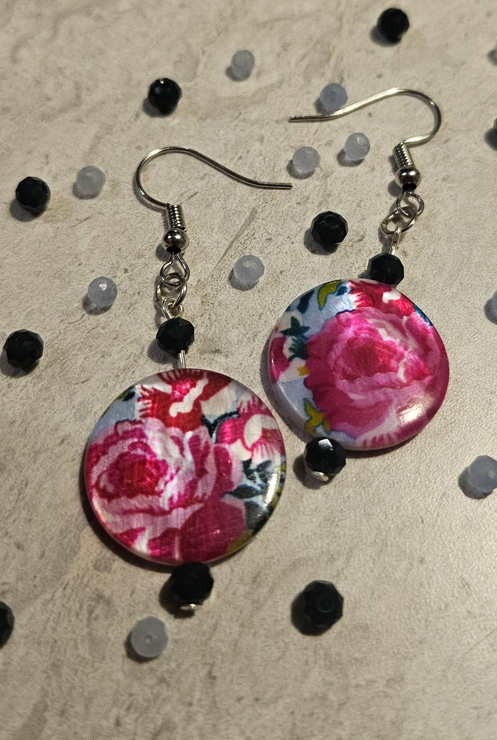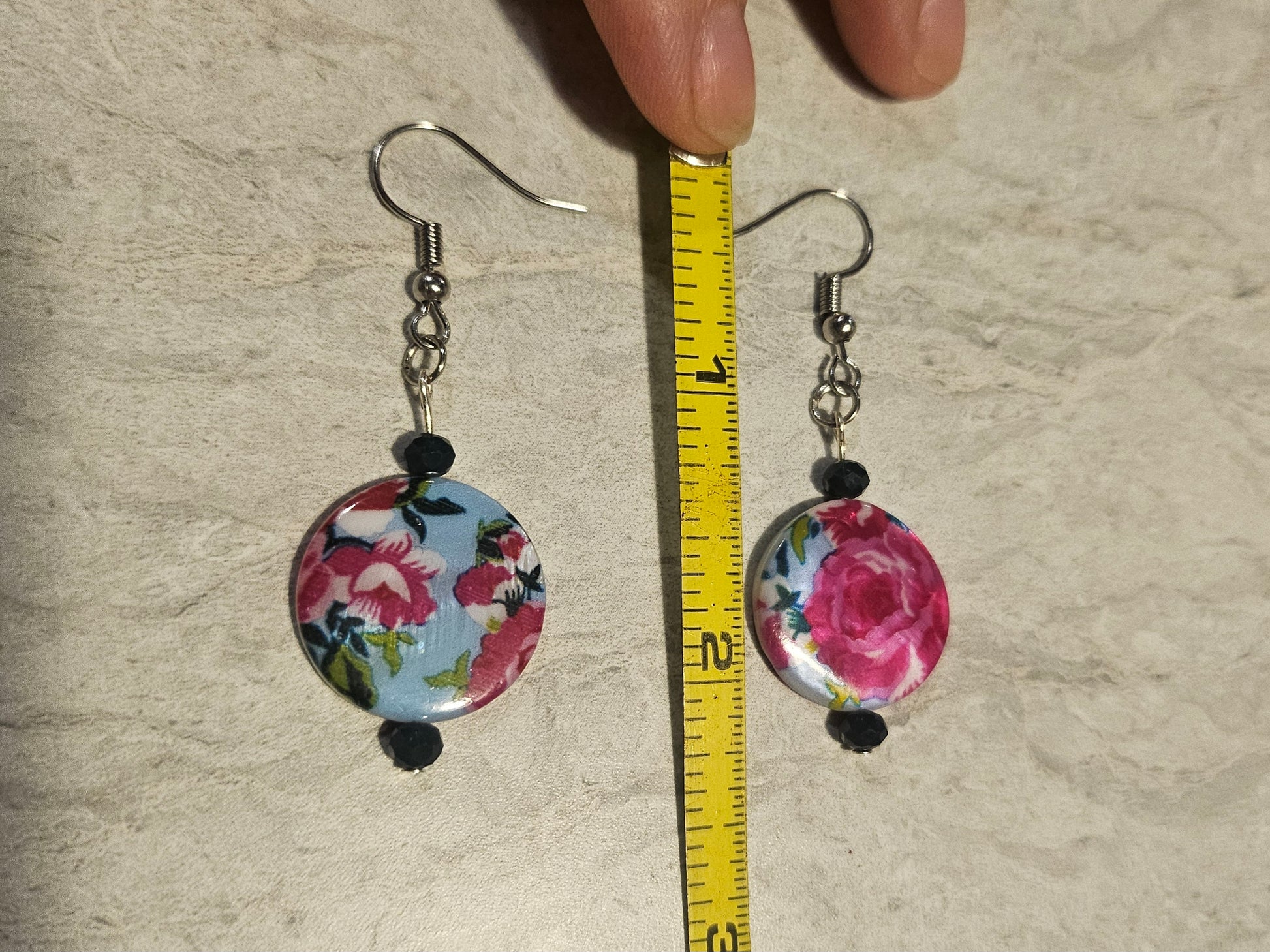 A pair of 2" earrings featuring light blue abalone disks with pink roses on silver eye pins with dark green glass beads on top and bottom of the disk.