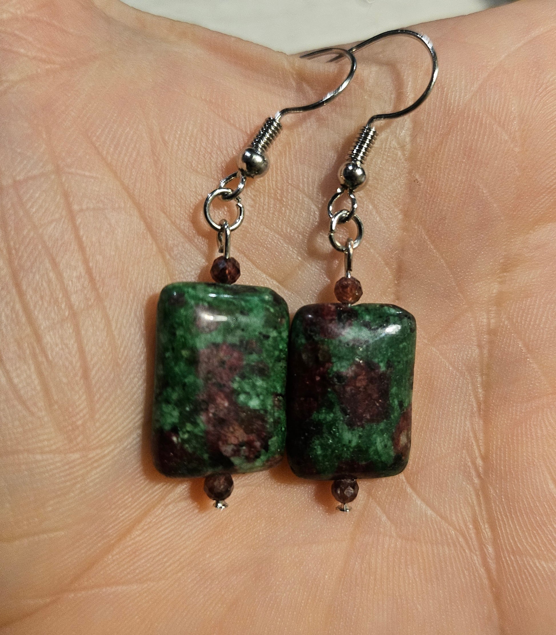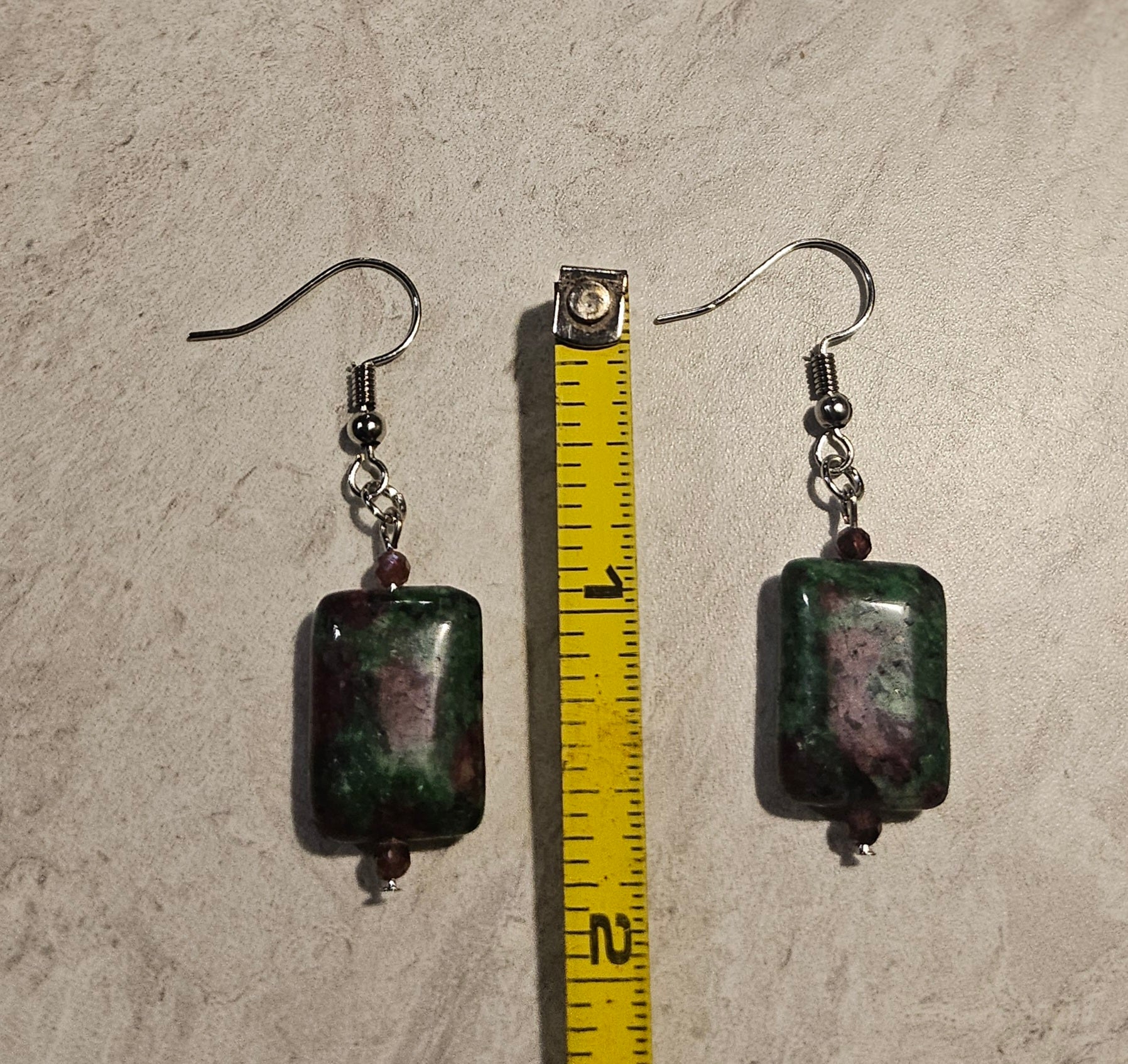 A pair 2" earrings made with rectangle ruby zoisite beads spaced with garnet beads on a silver eye pin with fishook earrings.