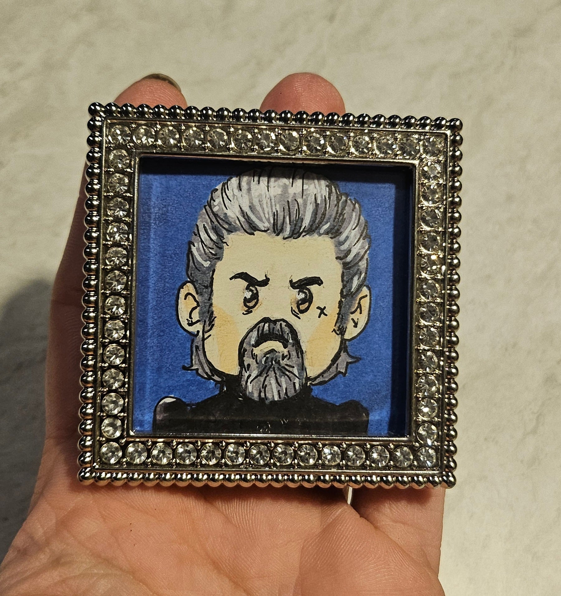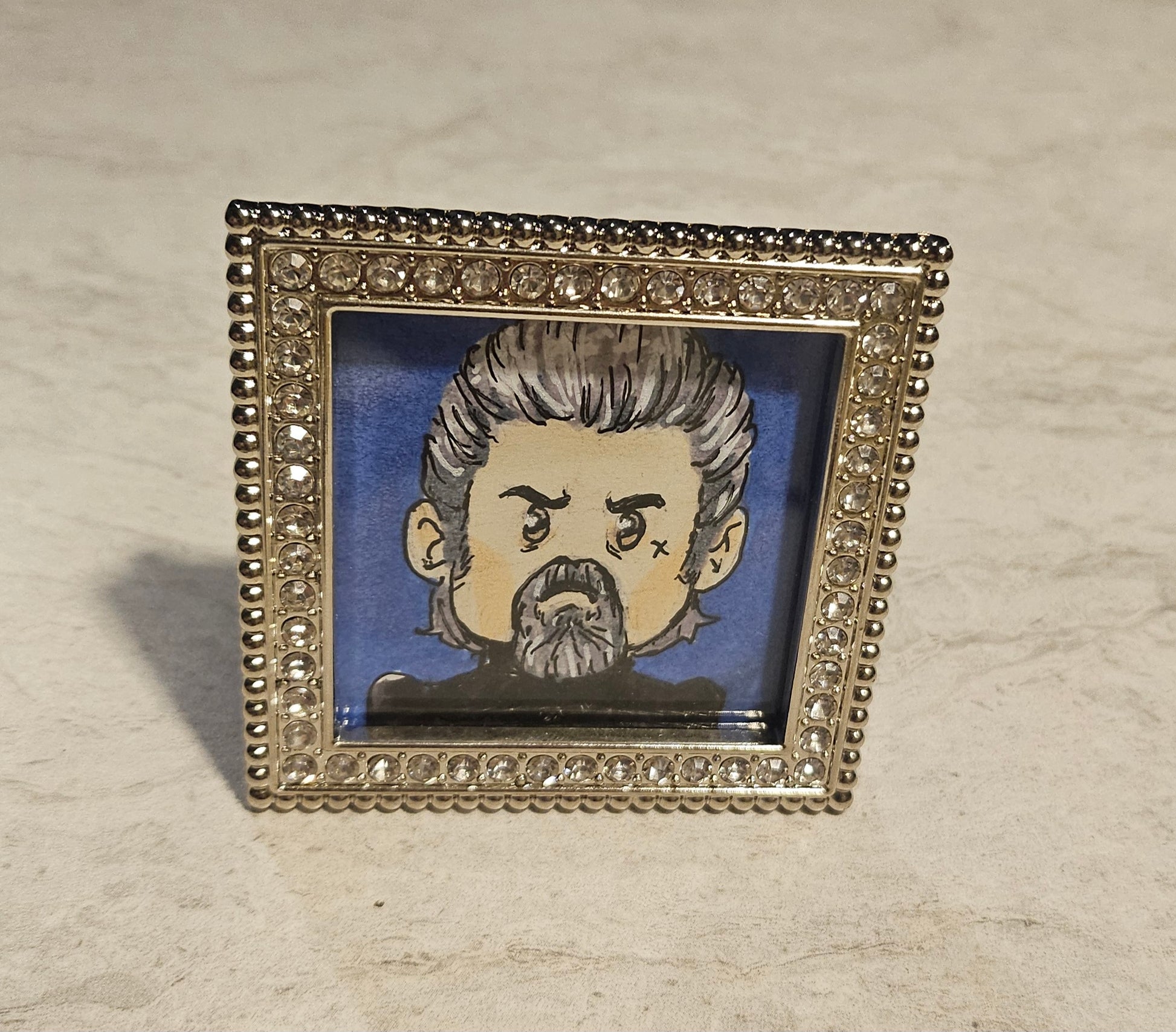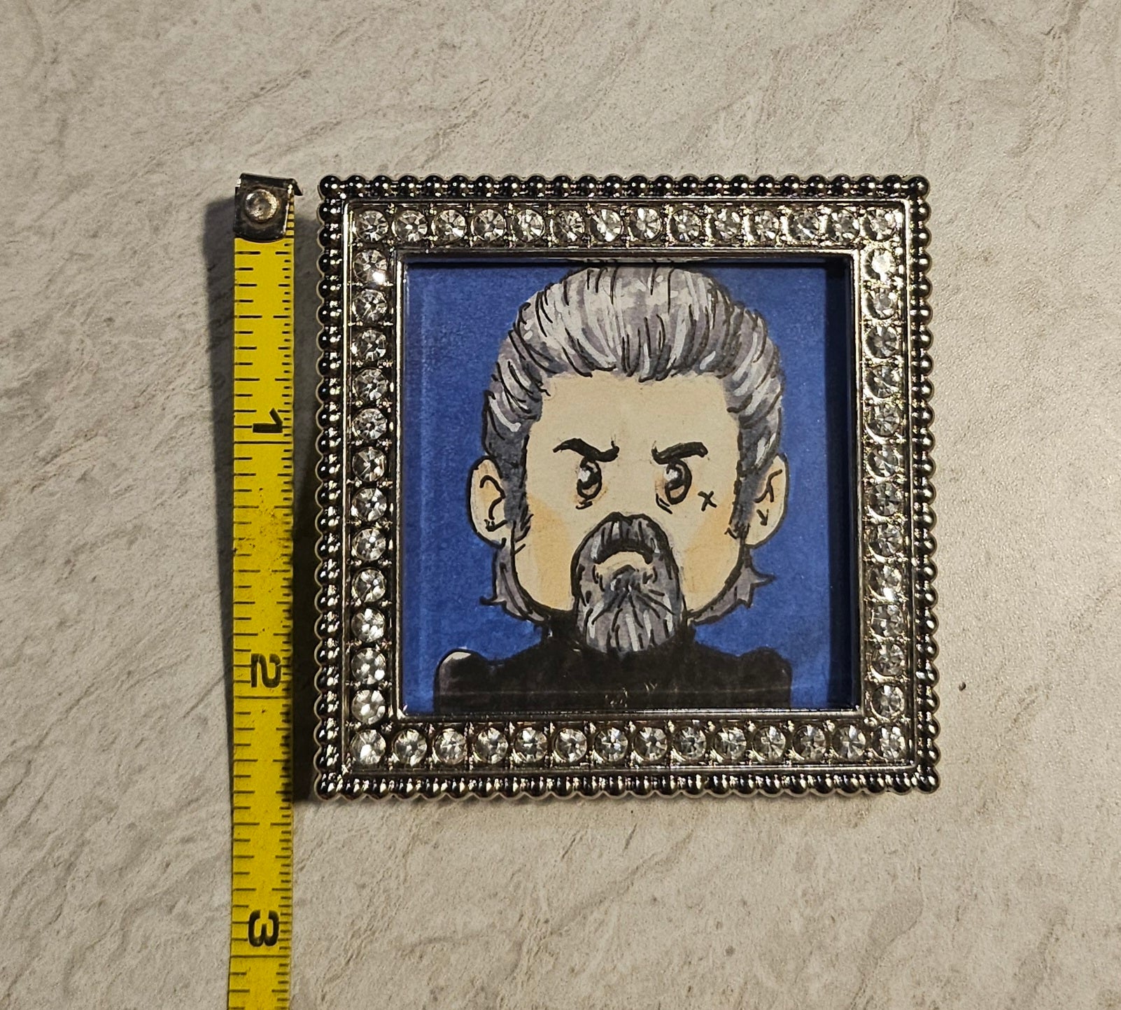 A 2x2 original chibi drawing of Izzy Hands from OFMD in a 2.5×2.5 rhinestone standing frame.