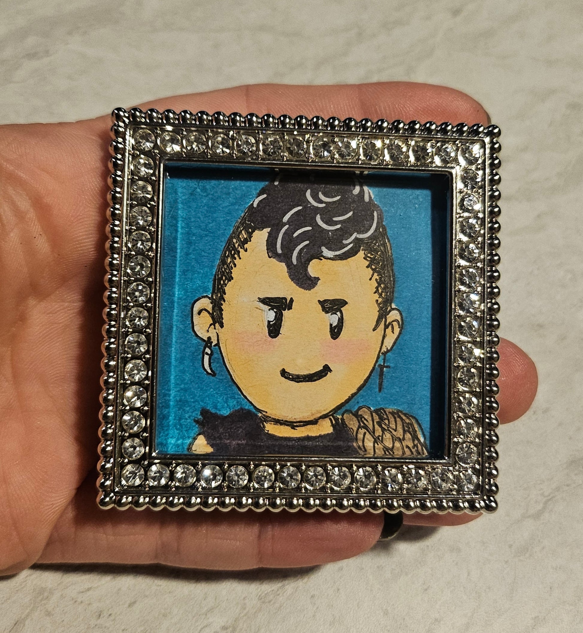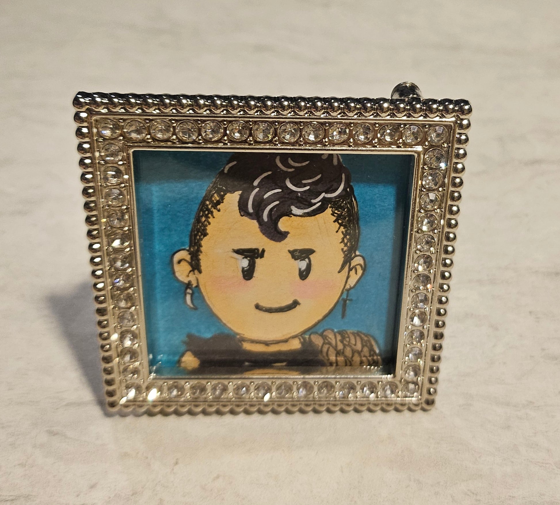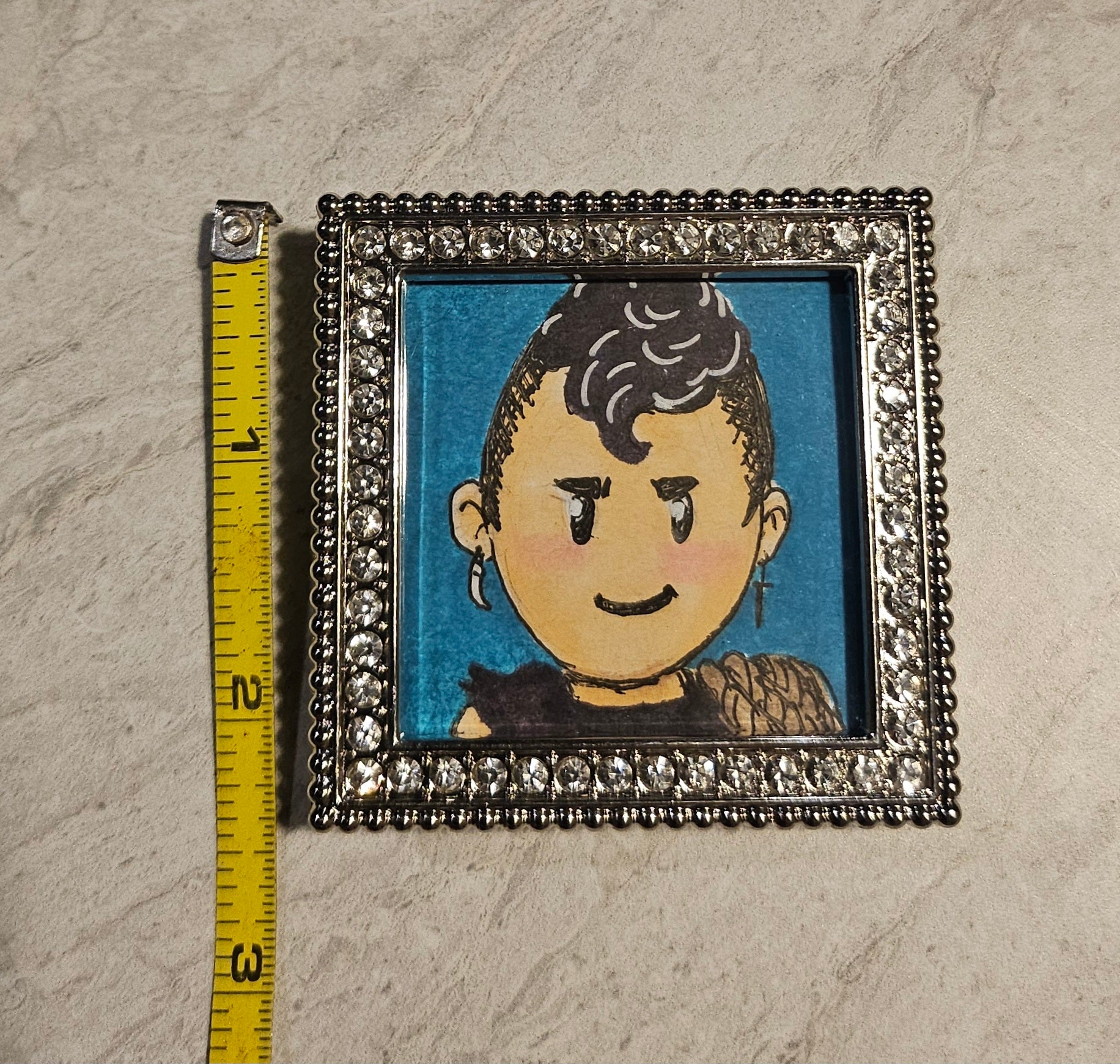 A 2x2 original chibi drawing of Jim from OFMD in a 2.5×2.5 rhinestone standing frame.