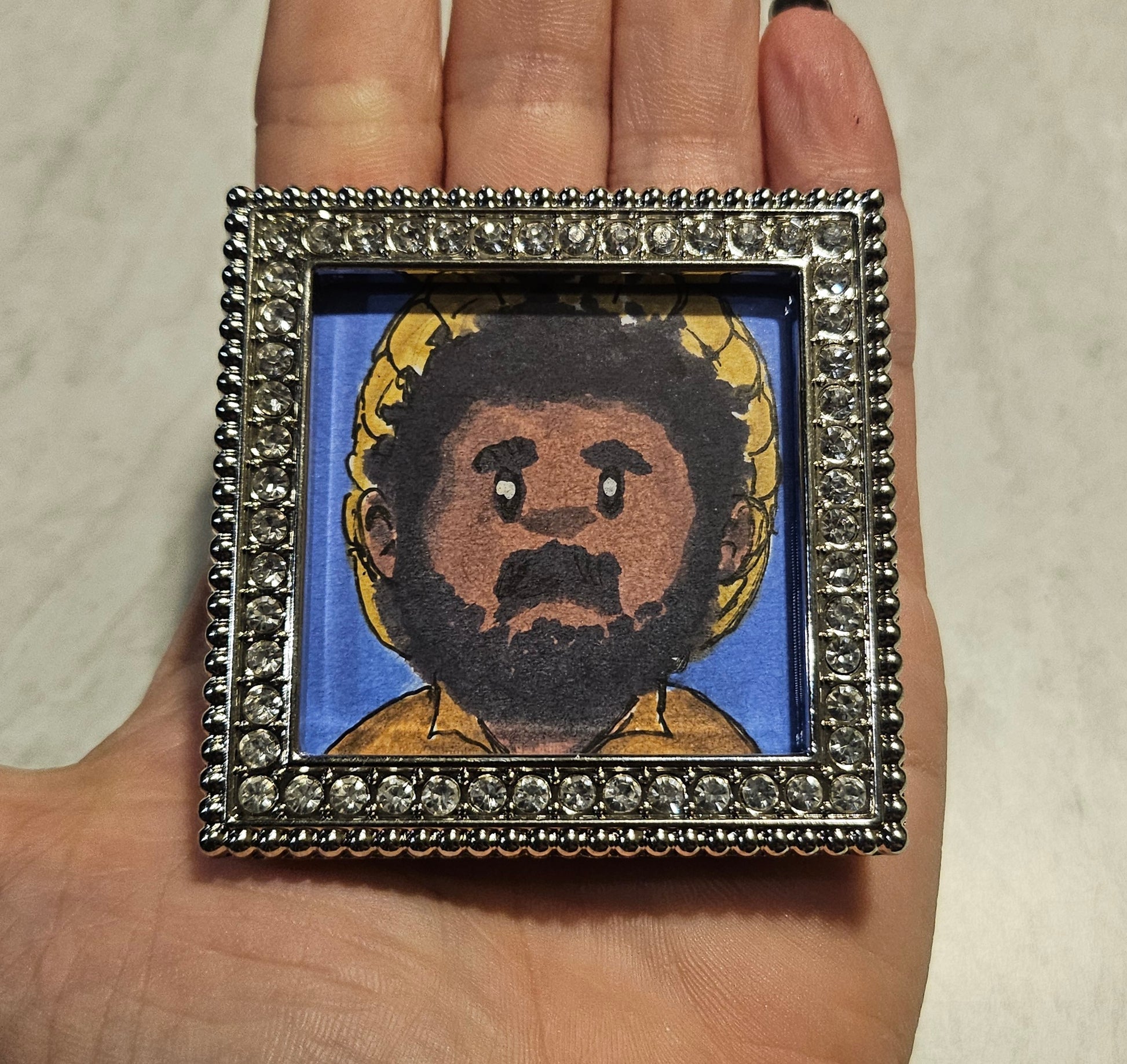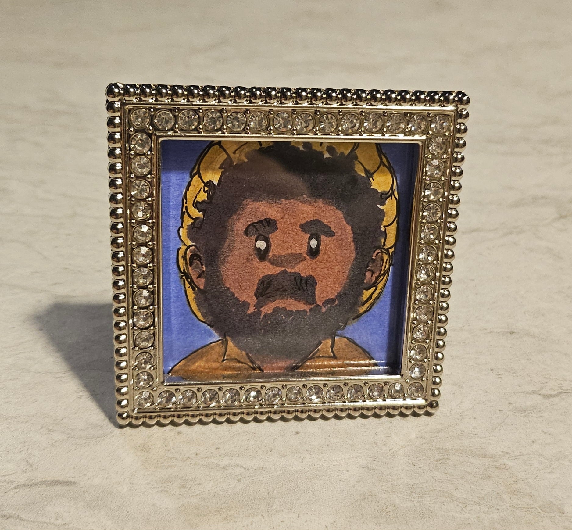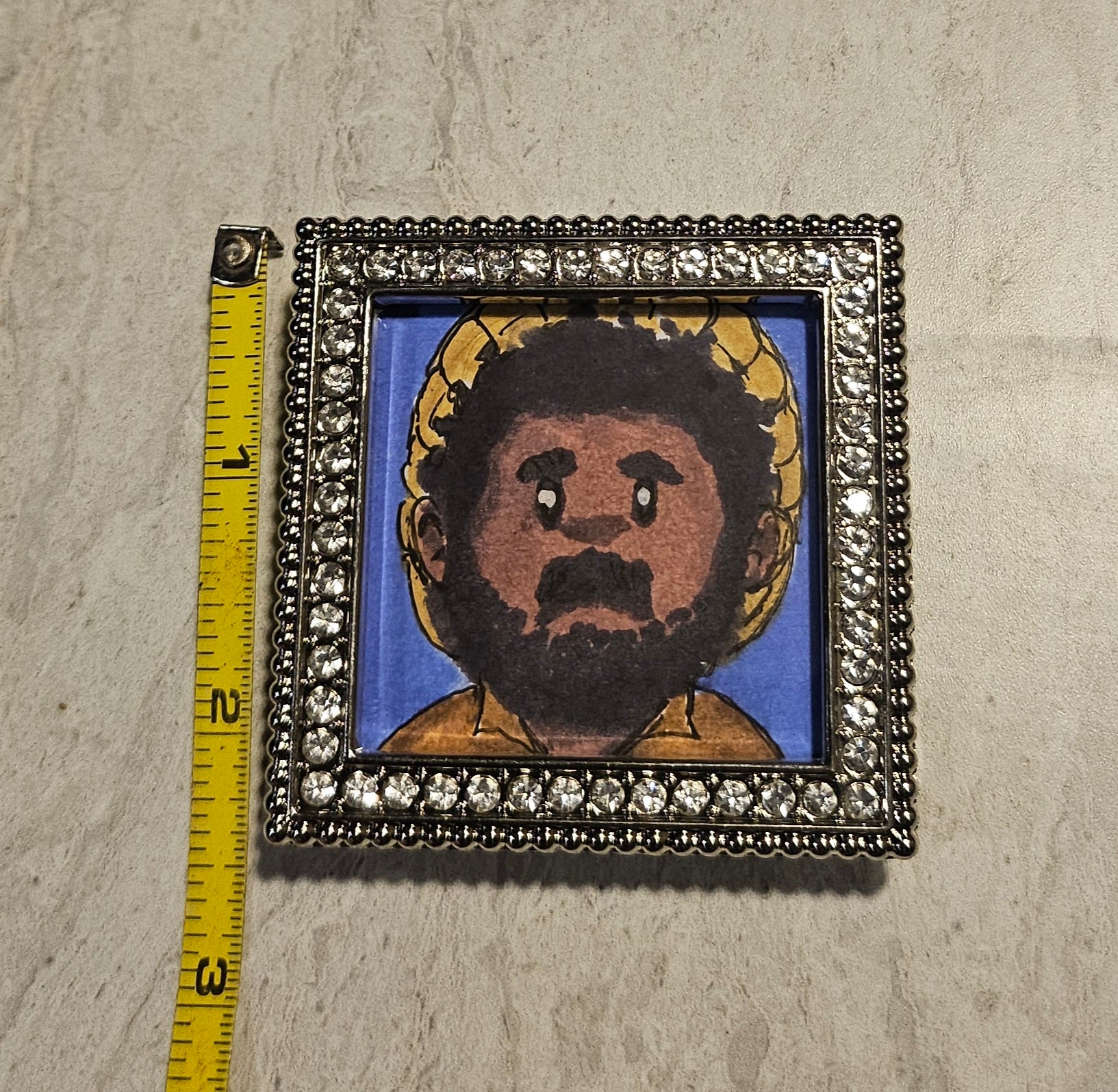 A 2x2 original chibi drawing of Olu from OFMD in a 2.5×2.5 rhinestone standing frame.