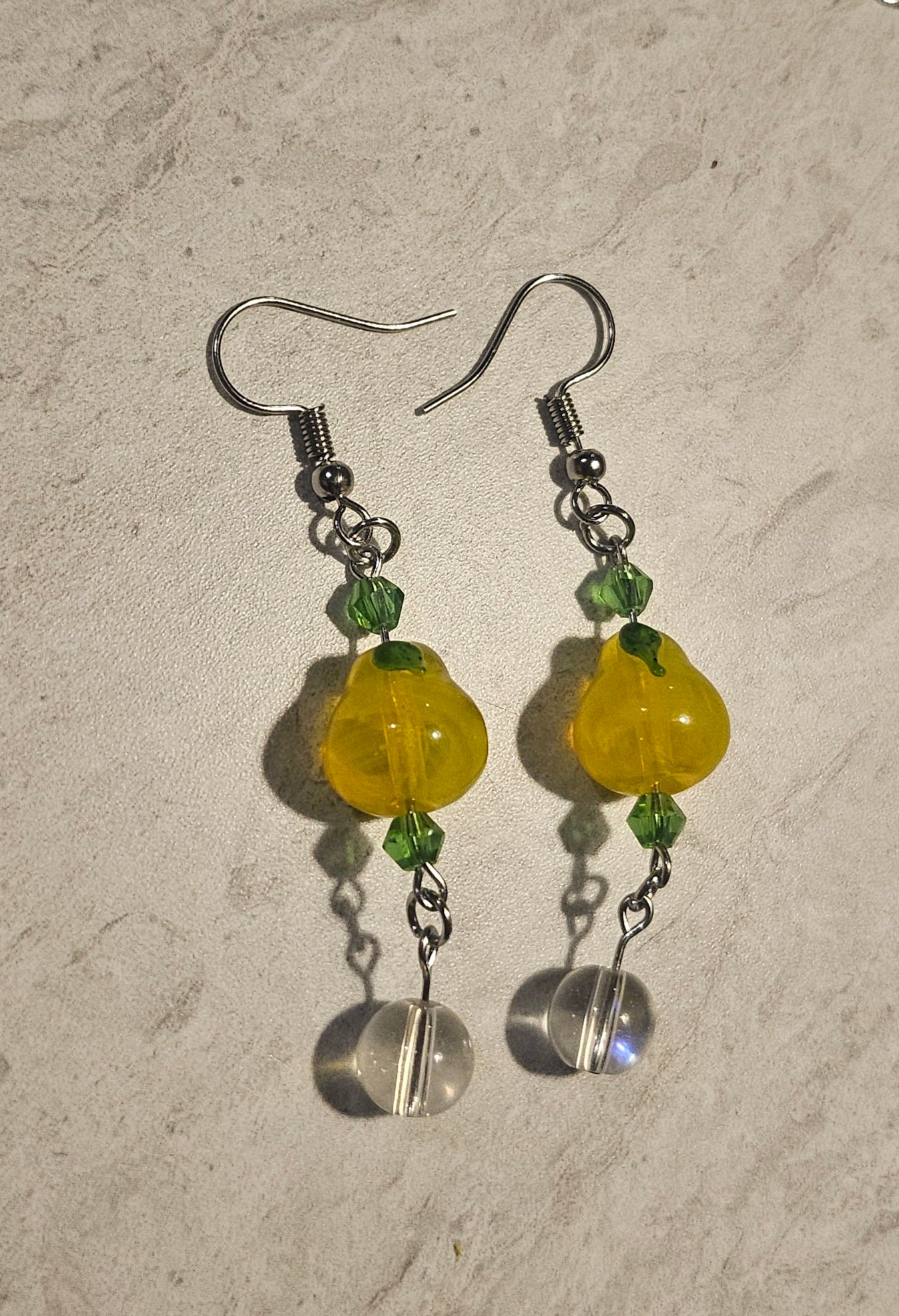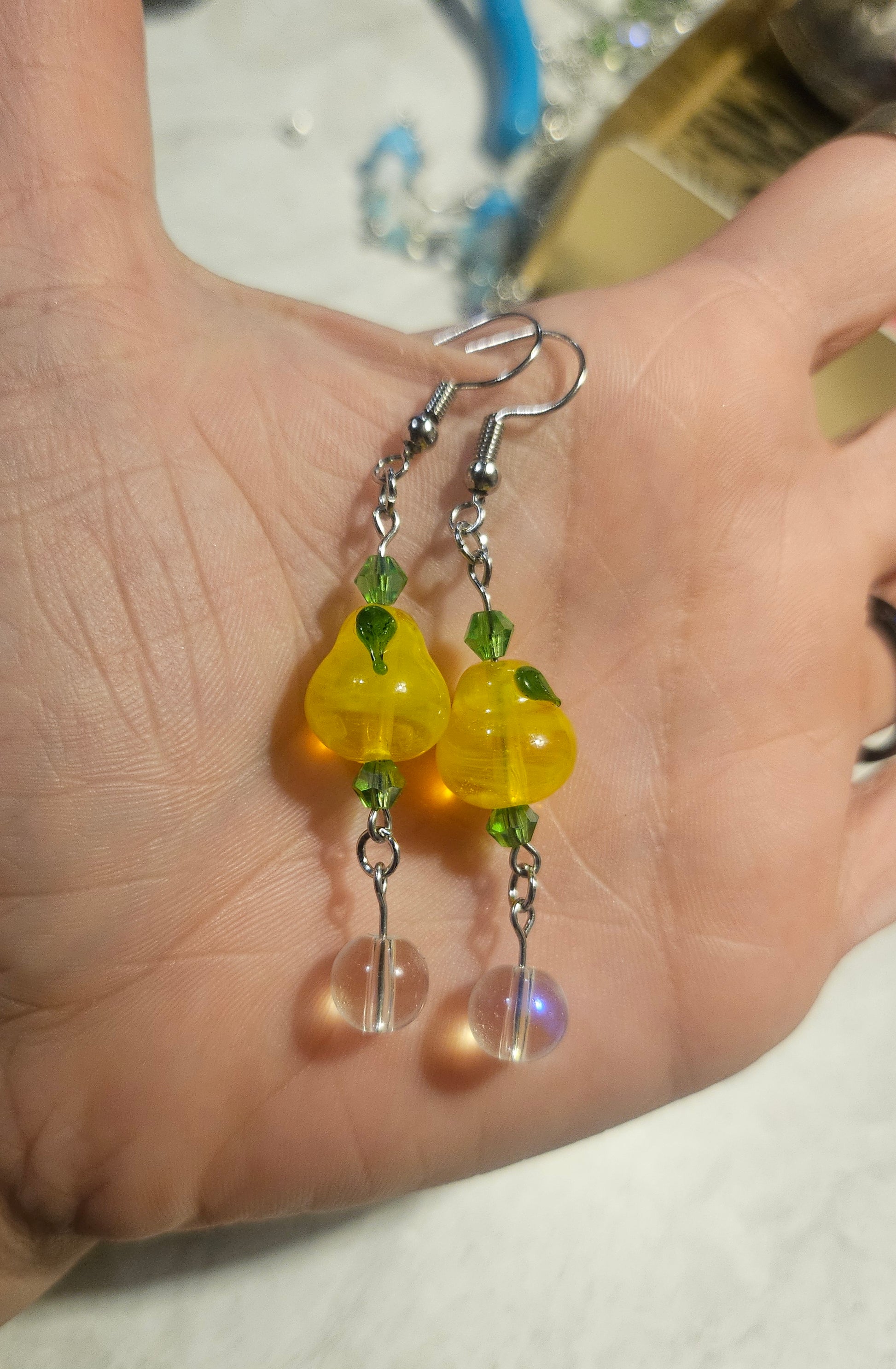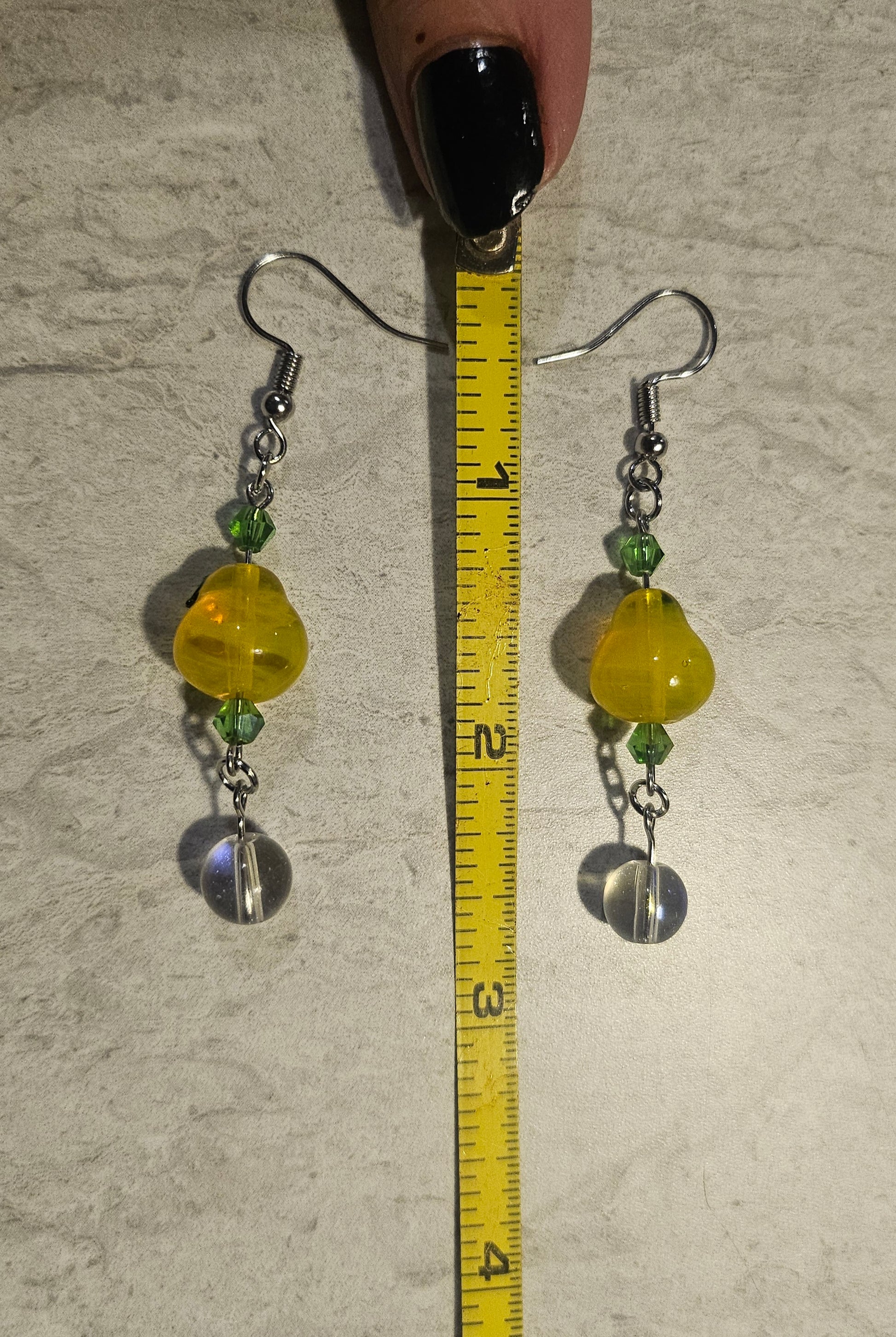 A pair of 3" earrings featuring glass pear beads, iridescent glass beads and green spacer beads.