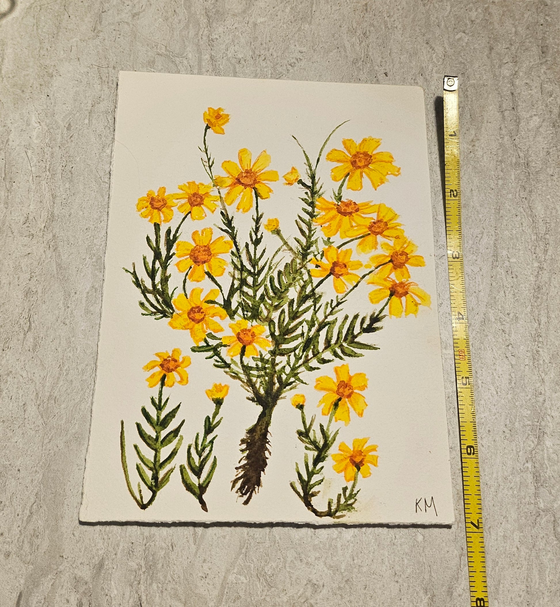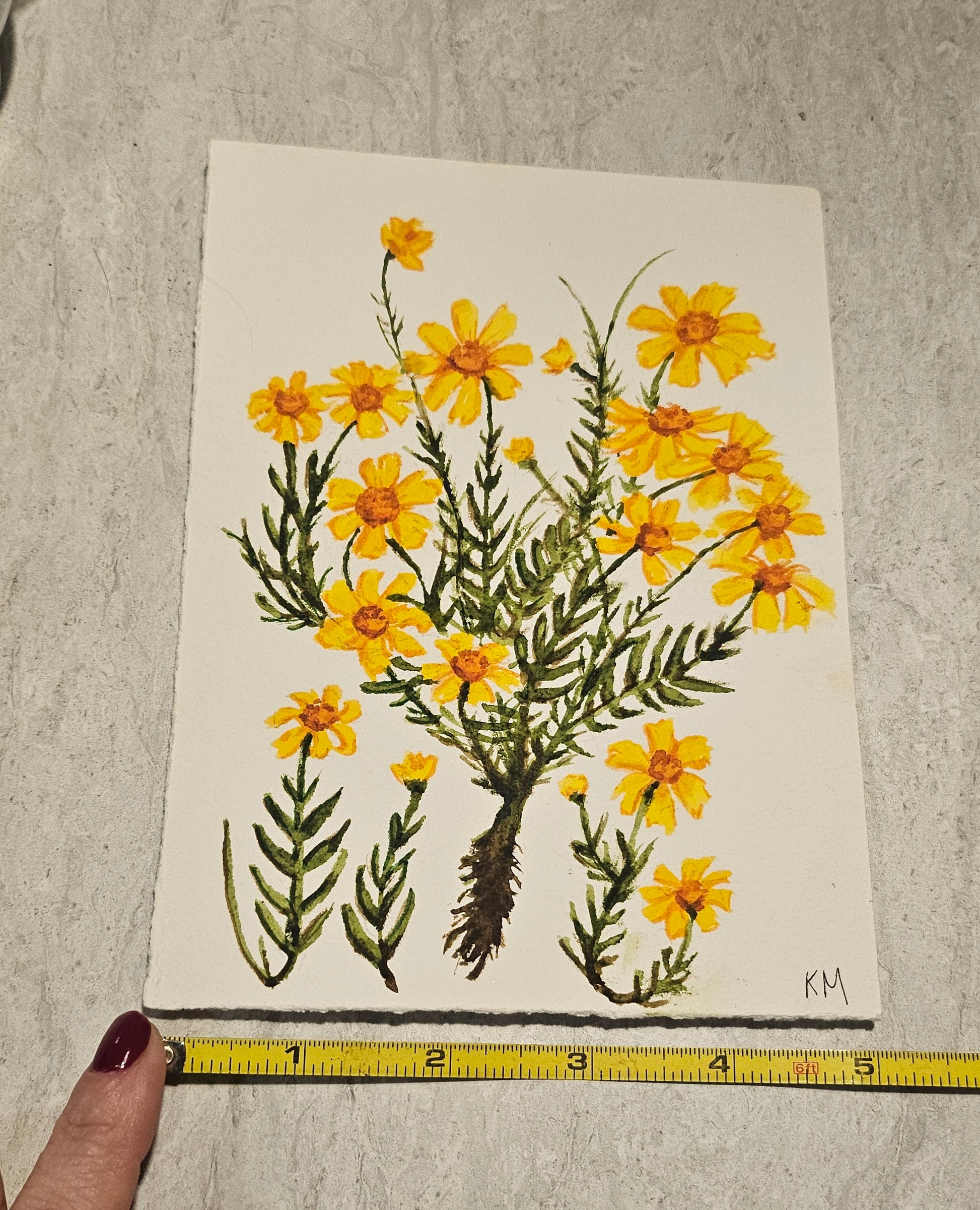 An unframed original 5x7 watercolor by @magicbubblepipe of yellow flowers.