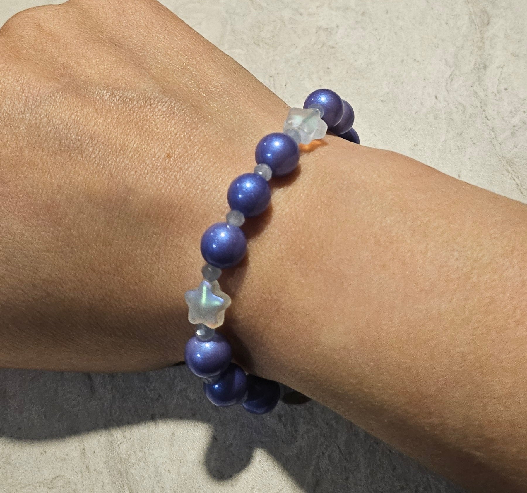 A 6-7" stretchy bracelet made with iridescent white stars and purple iridescent beads. Double knotted and secured with a crimp bead.