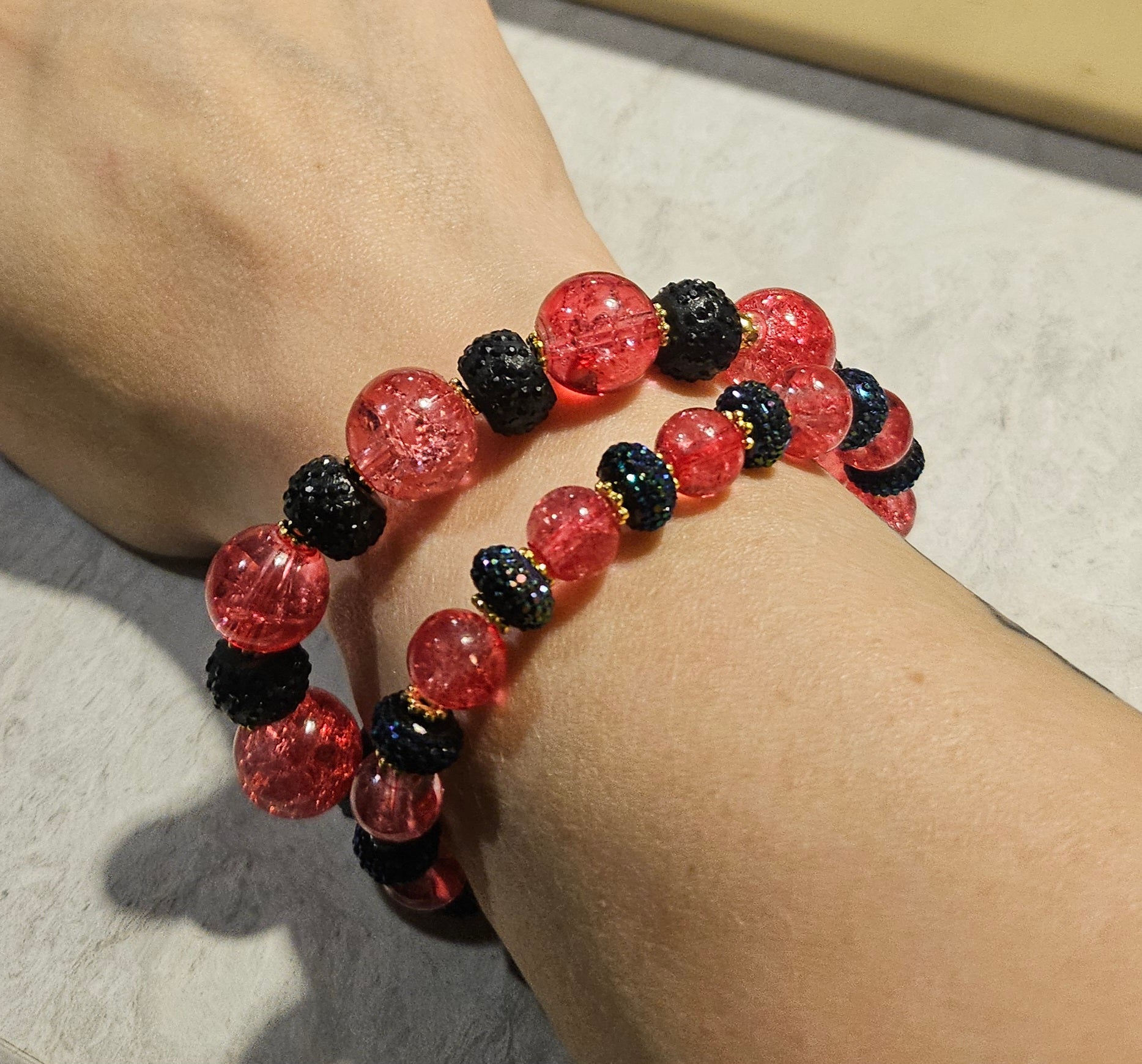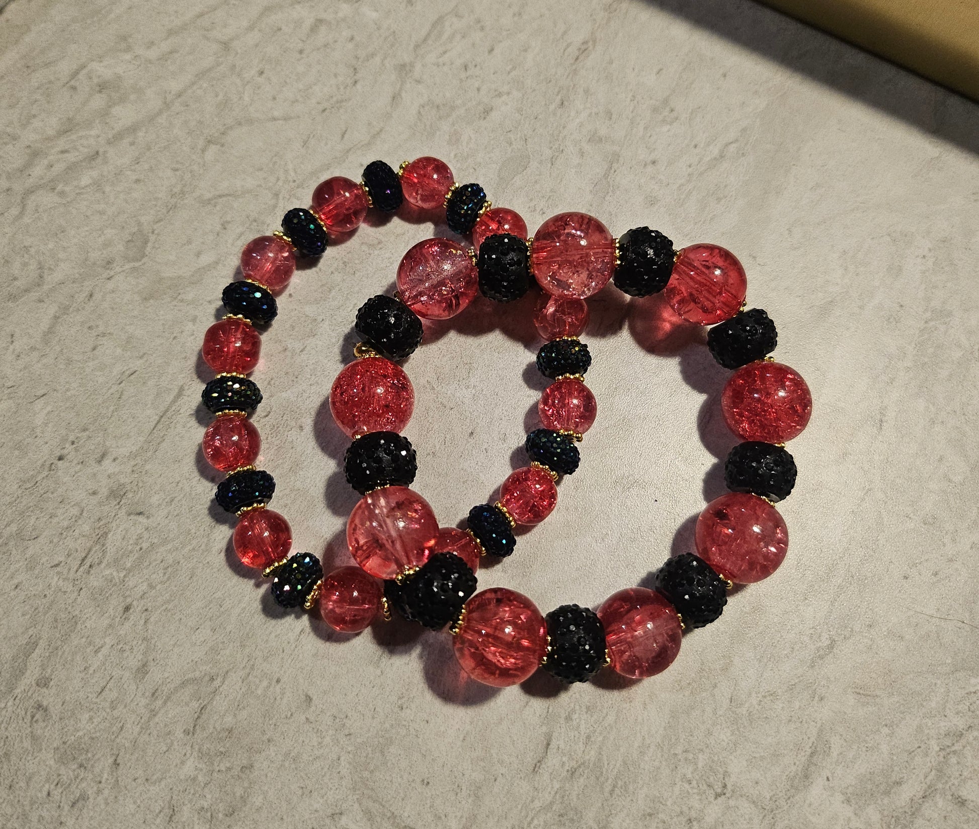 A 6-7" bracelet set made with pinkish red beads spaced with black rhinestone beads on a 1mm stretchy string. Double knotted and secured with a crimp bead.
