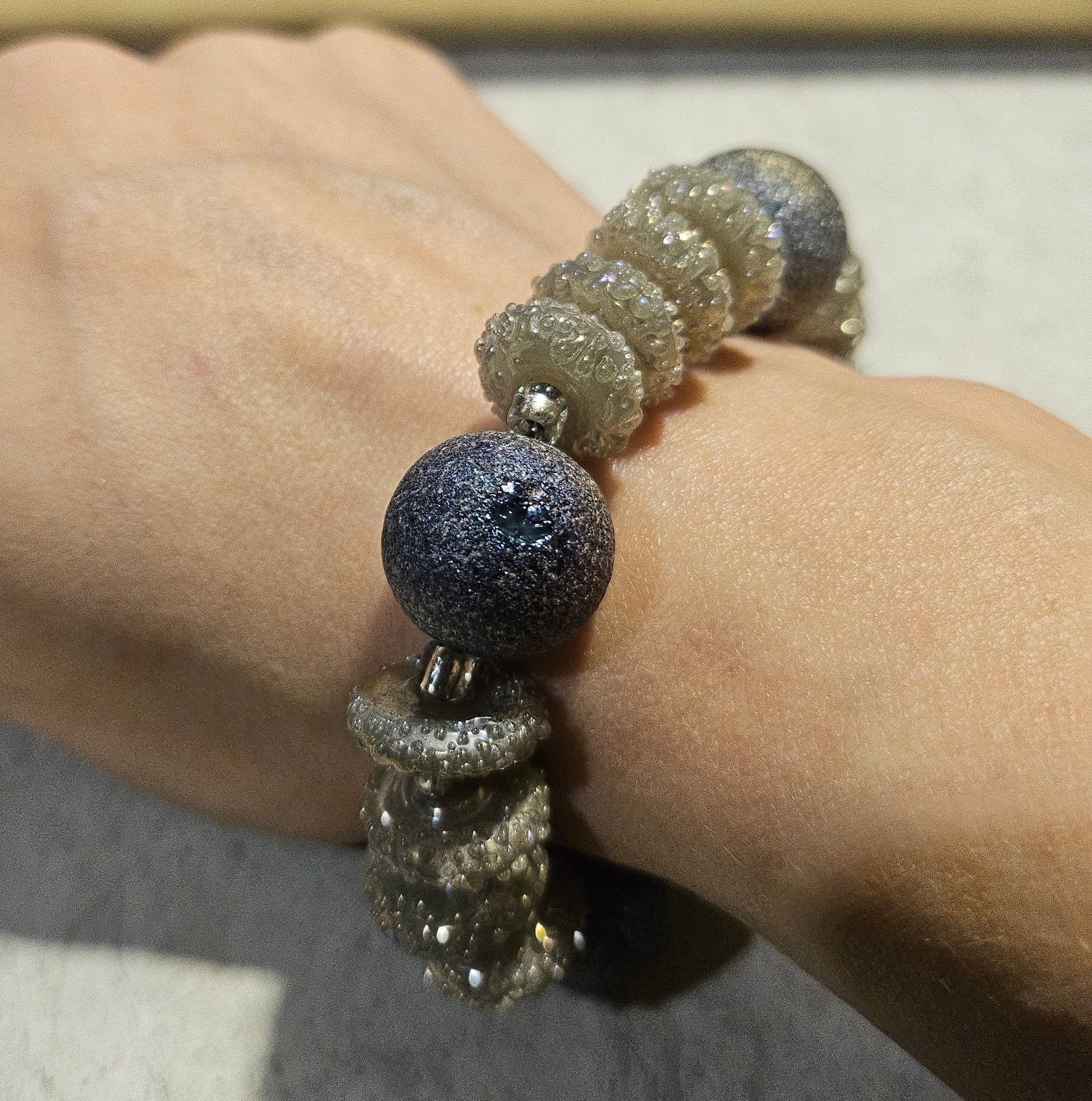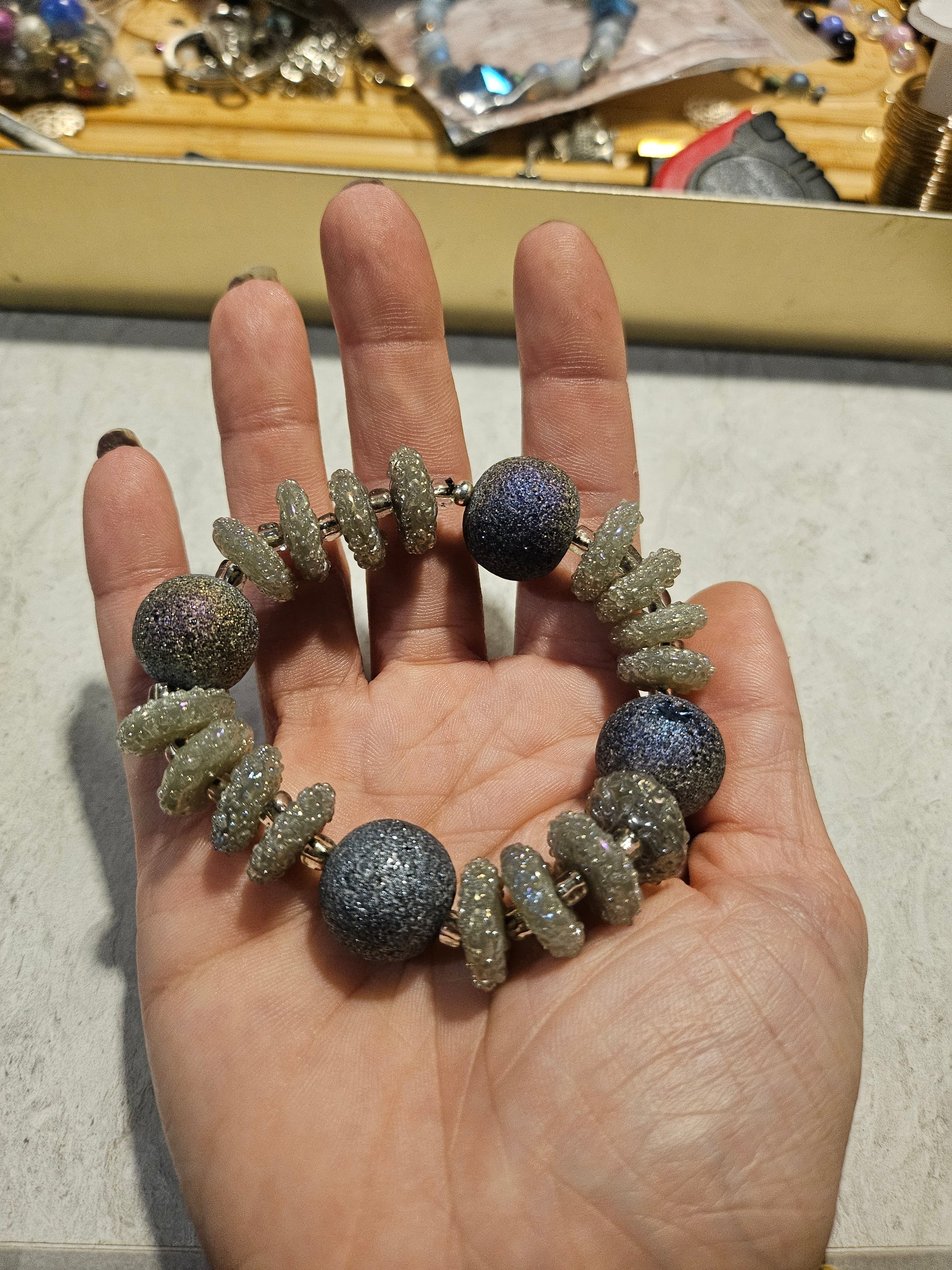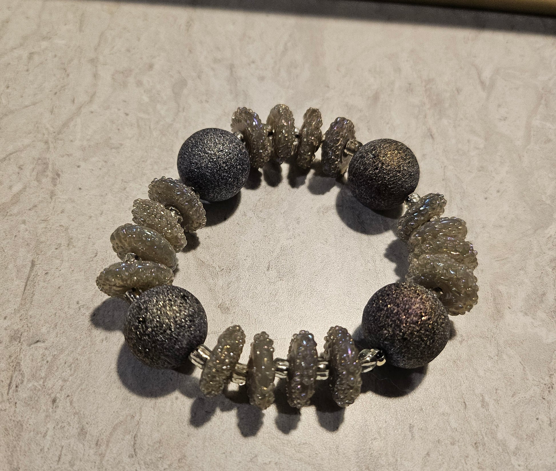 A 6-7" Stretchy bracelet made with gray iridescent round and disk beads. On 1 mm stretchy string, knot secured with a double-knot and crimp bead.
