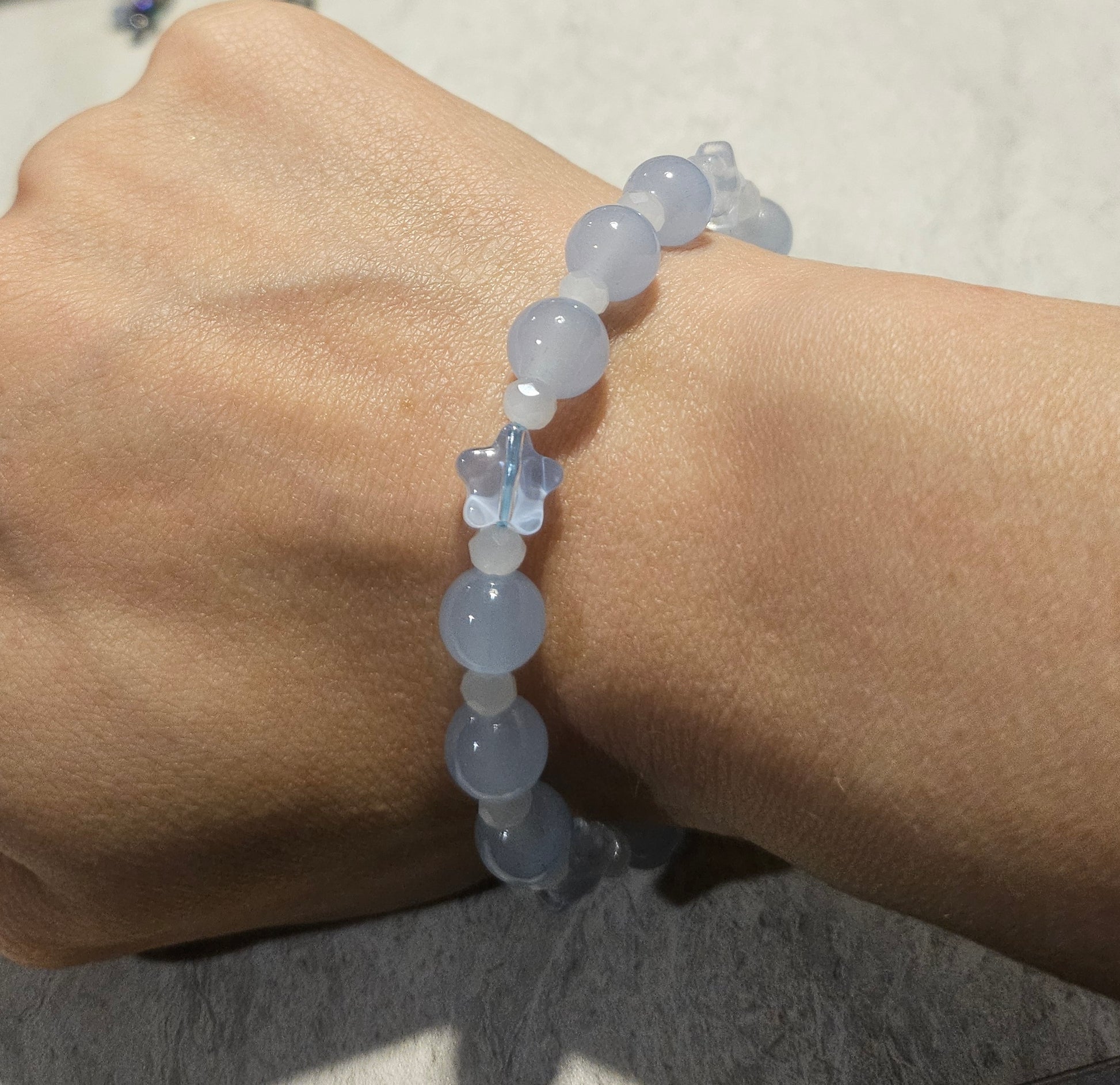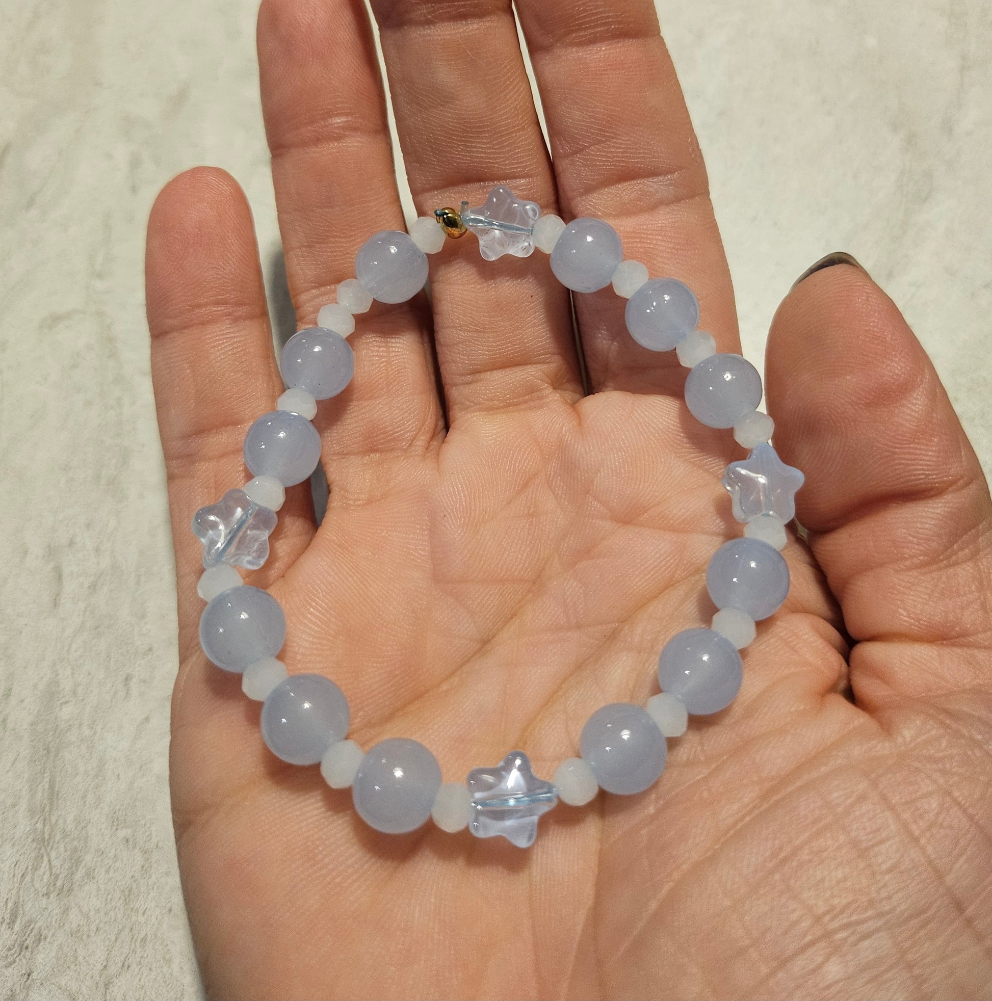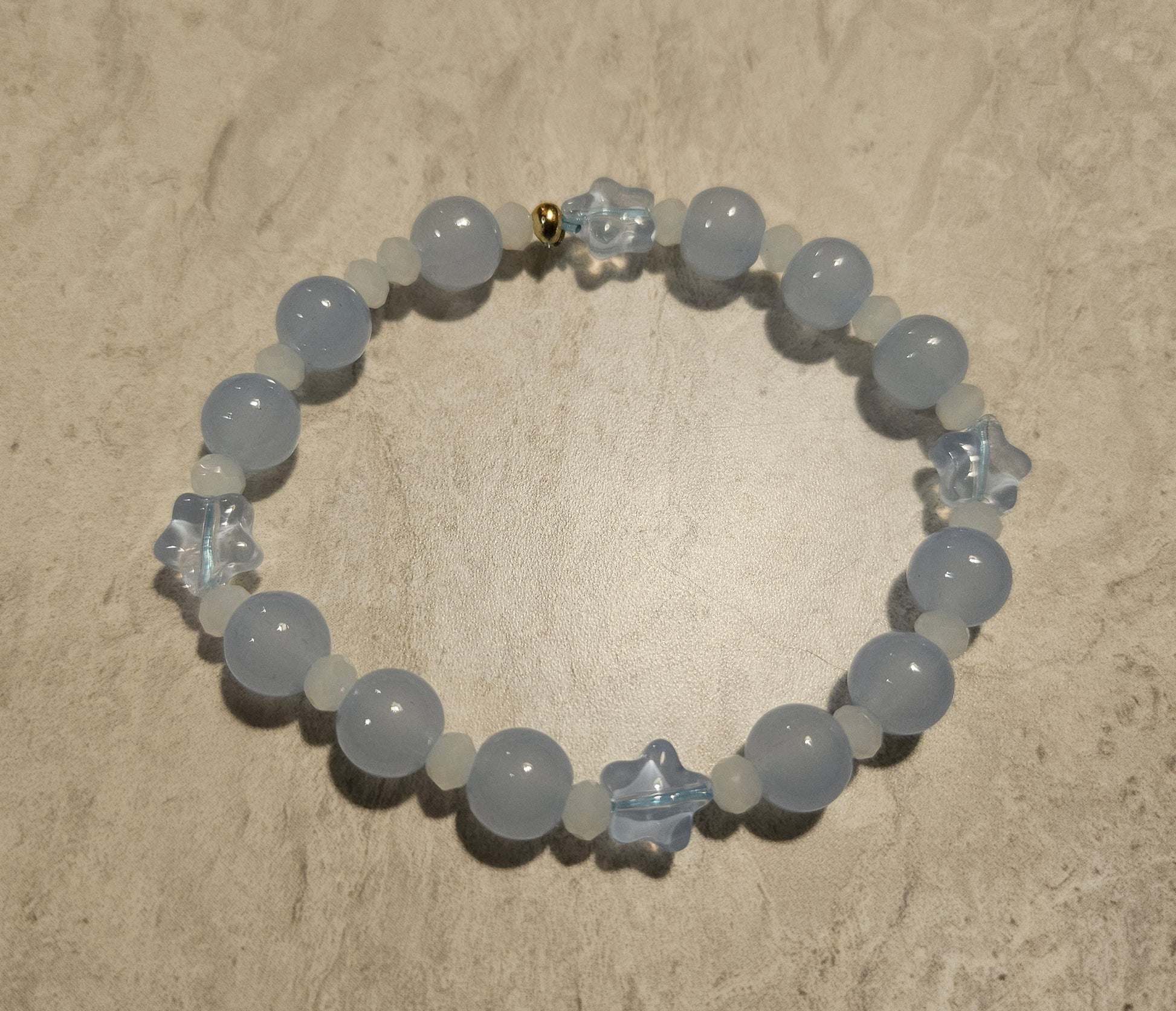 A 7" bracelet on stretchy string, beads are round blue glass and light blue blue stars. Knot secured with crimp bead.