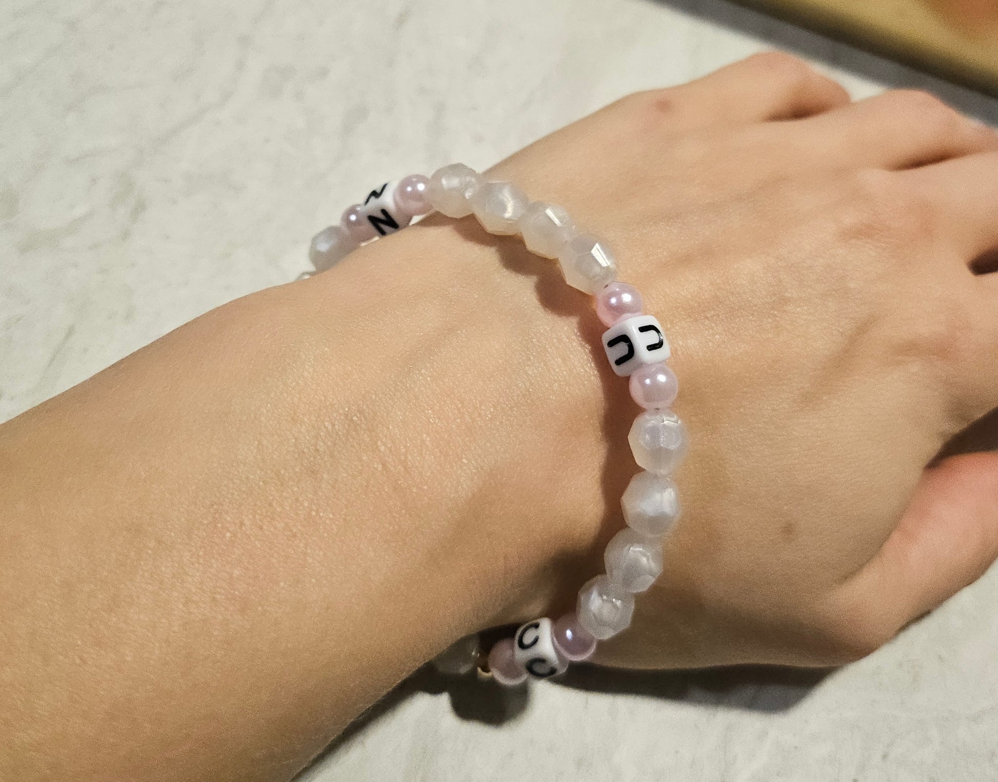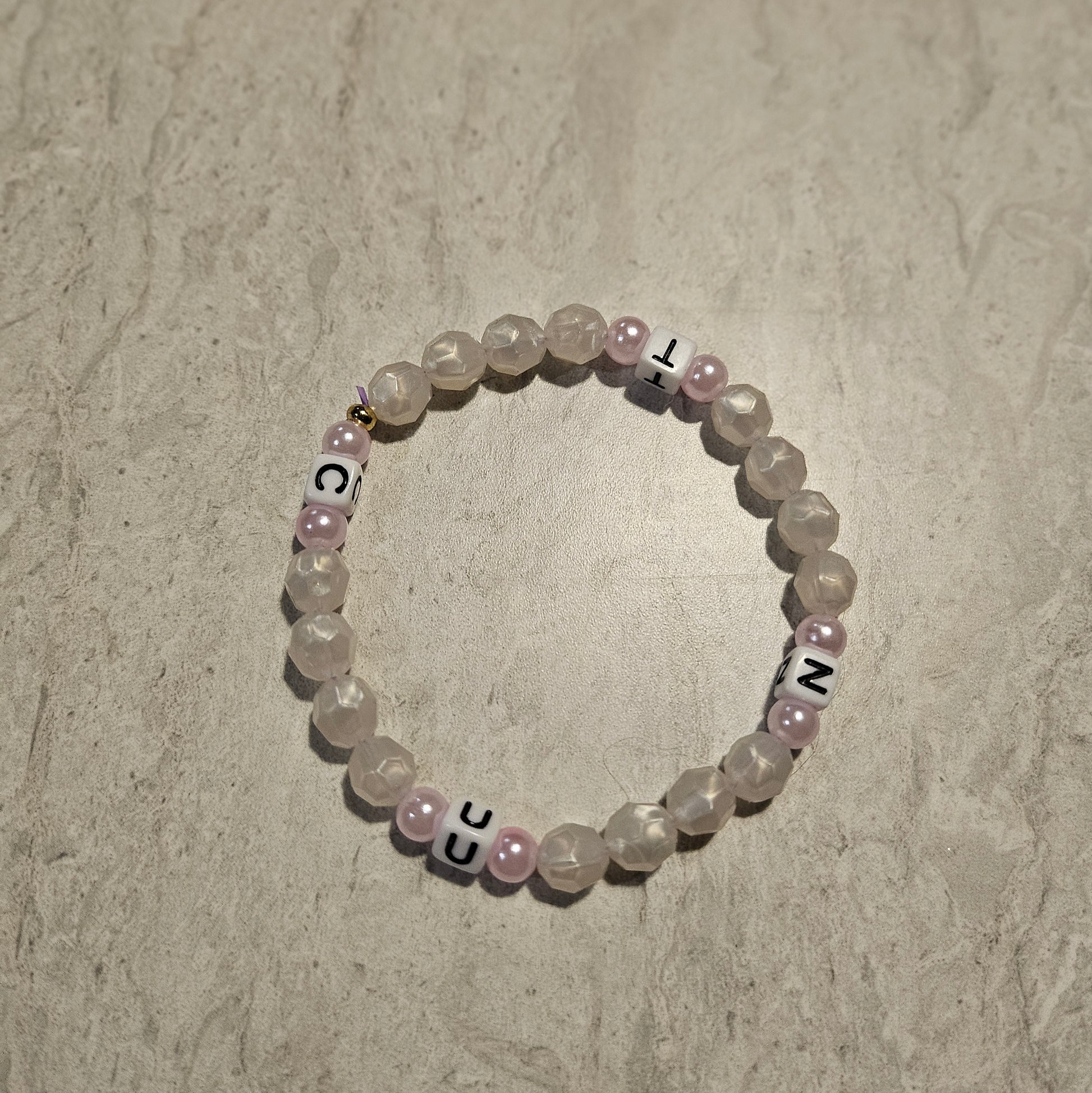 A 7" stretchy bracelet made with pink and white plastic beads and square letter beads that spell something cheeky. Knot secured with crimp bead.