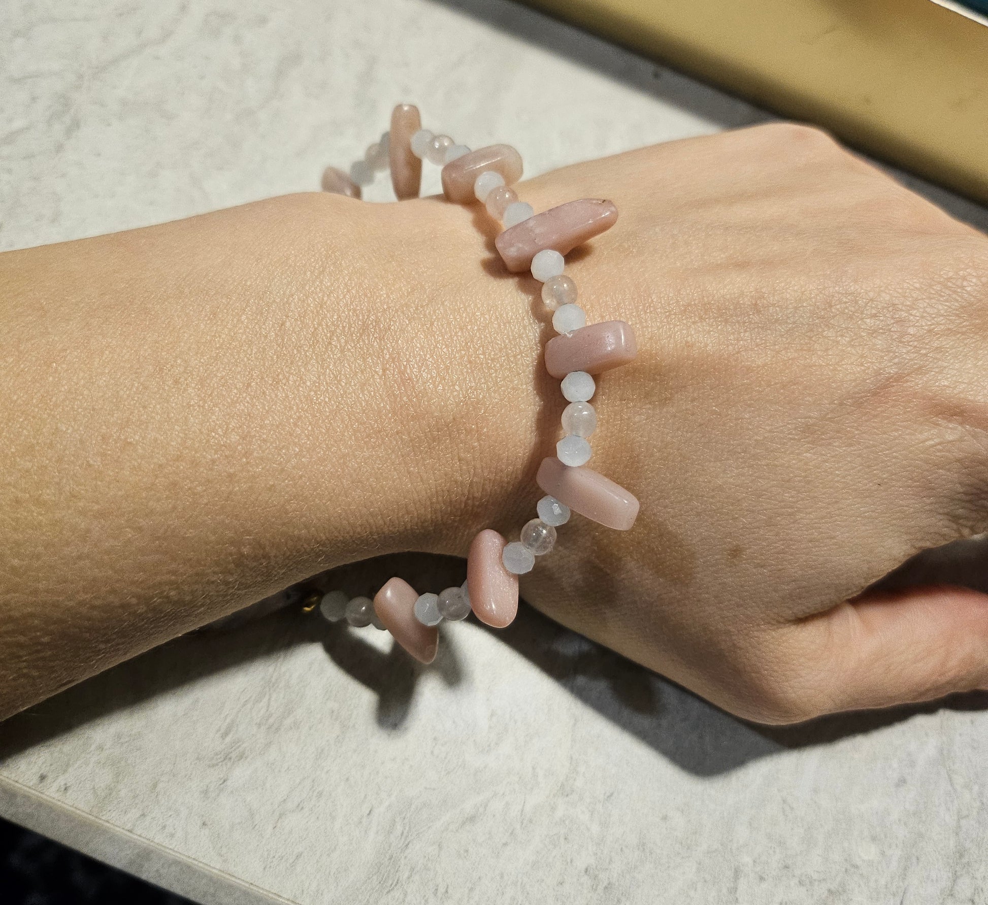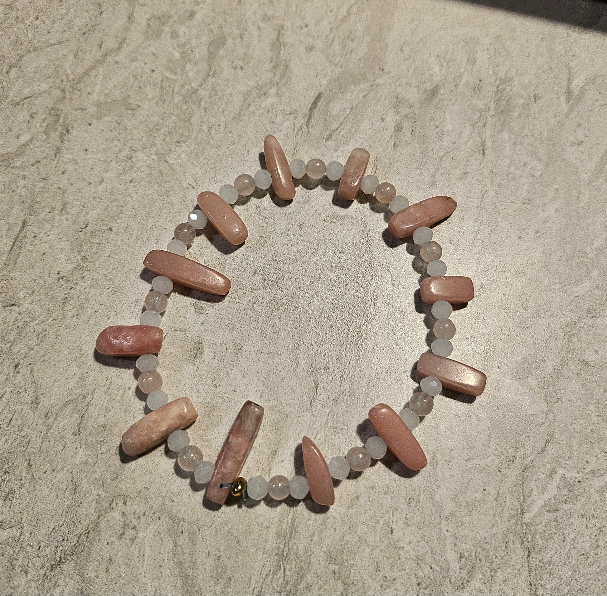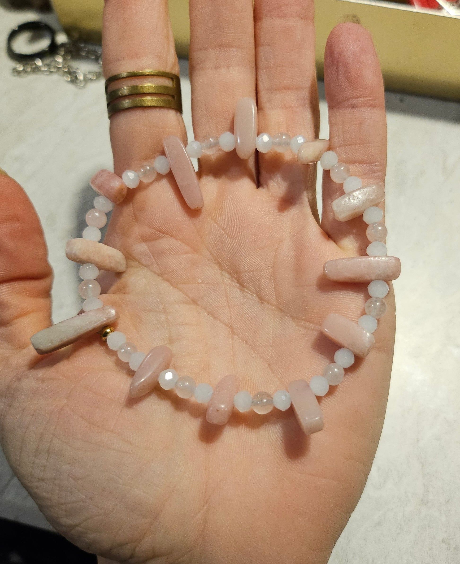 A 7" stretchy bracelet made with different sized rose quartz beads. Knot secured with a crimp bead.