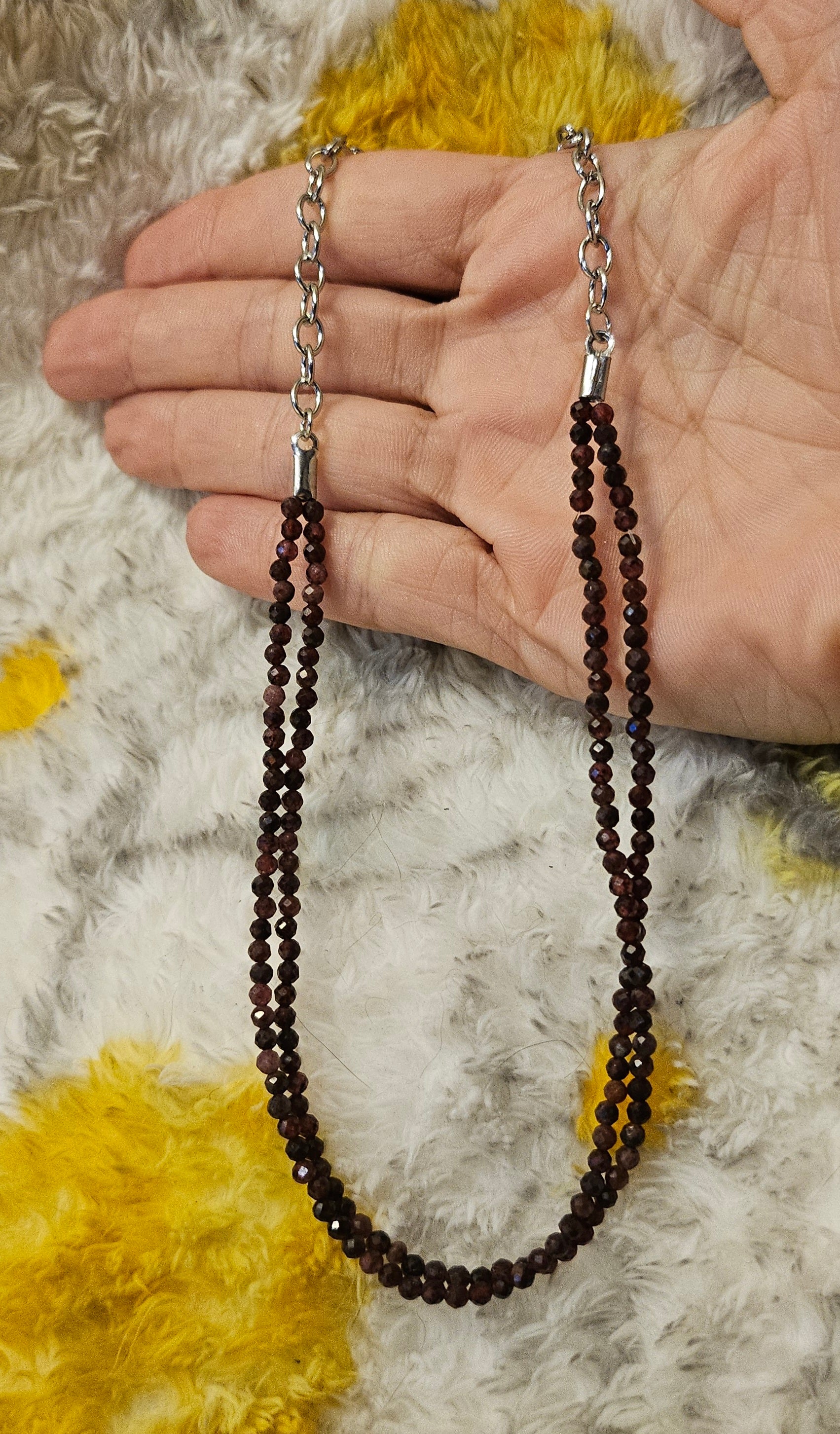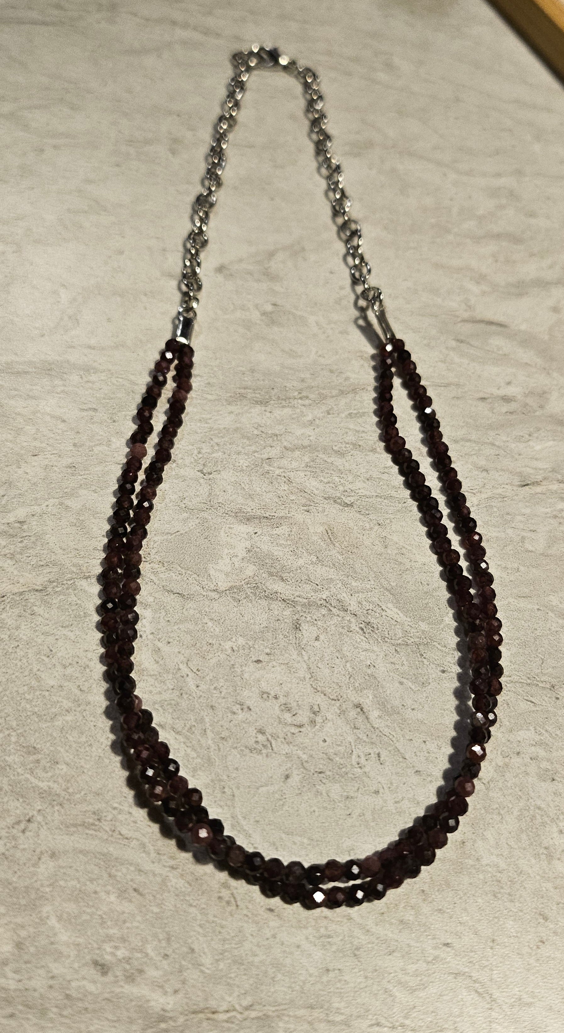 A choker made out of two strands of garnet, layered to resemble a slit throat. The hardware is silver and the necklace is lobster clasp.