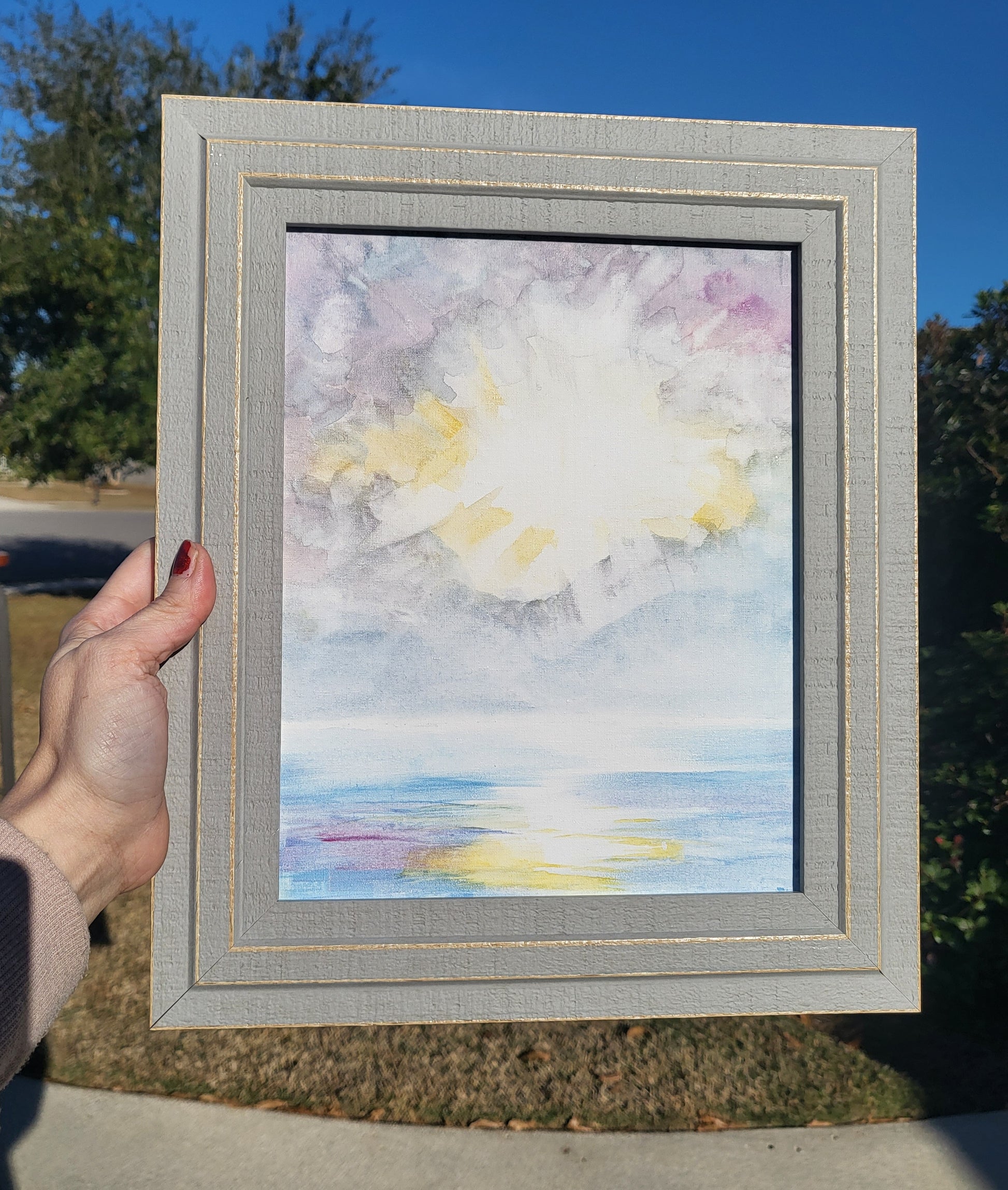 8x10 framed original watercolor done by magicbubblepipe. Painting is of a grey and pink tinged sunrise over the sea in a soft grey frame. Wall ready.