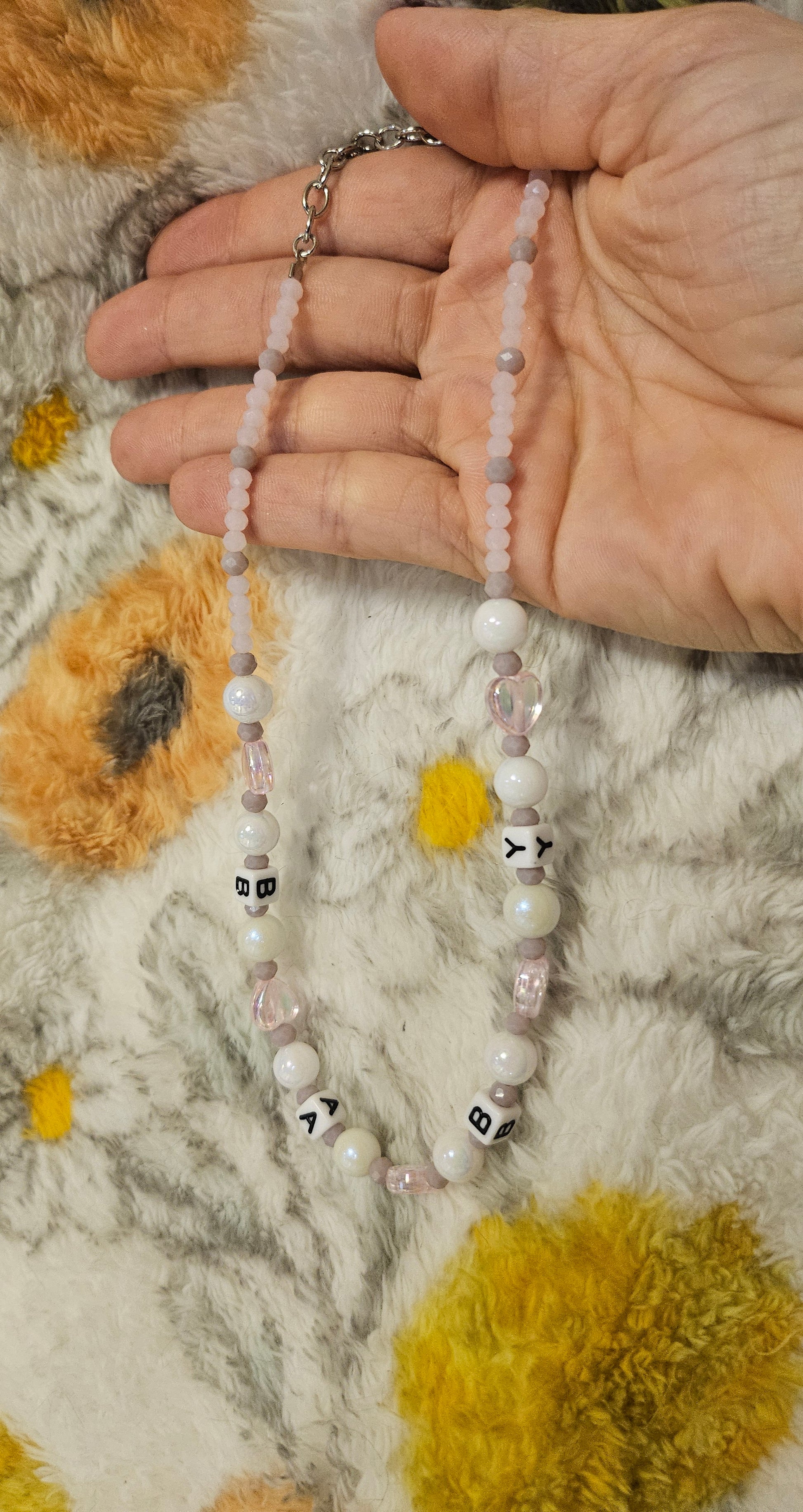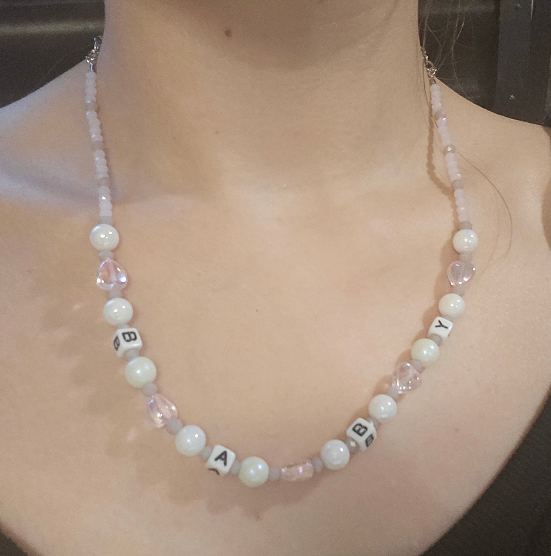 A 9" lobster clasp necklace made with plastic square letter beads, faux white pearls and mauve glass beads for spacers.