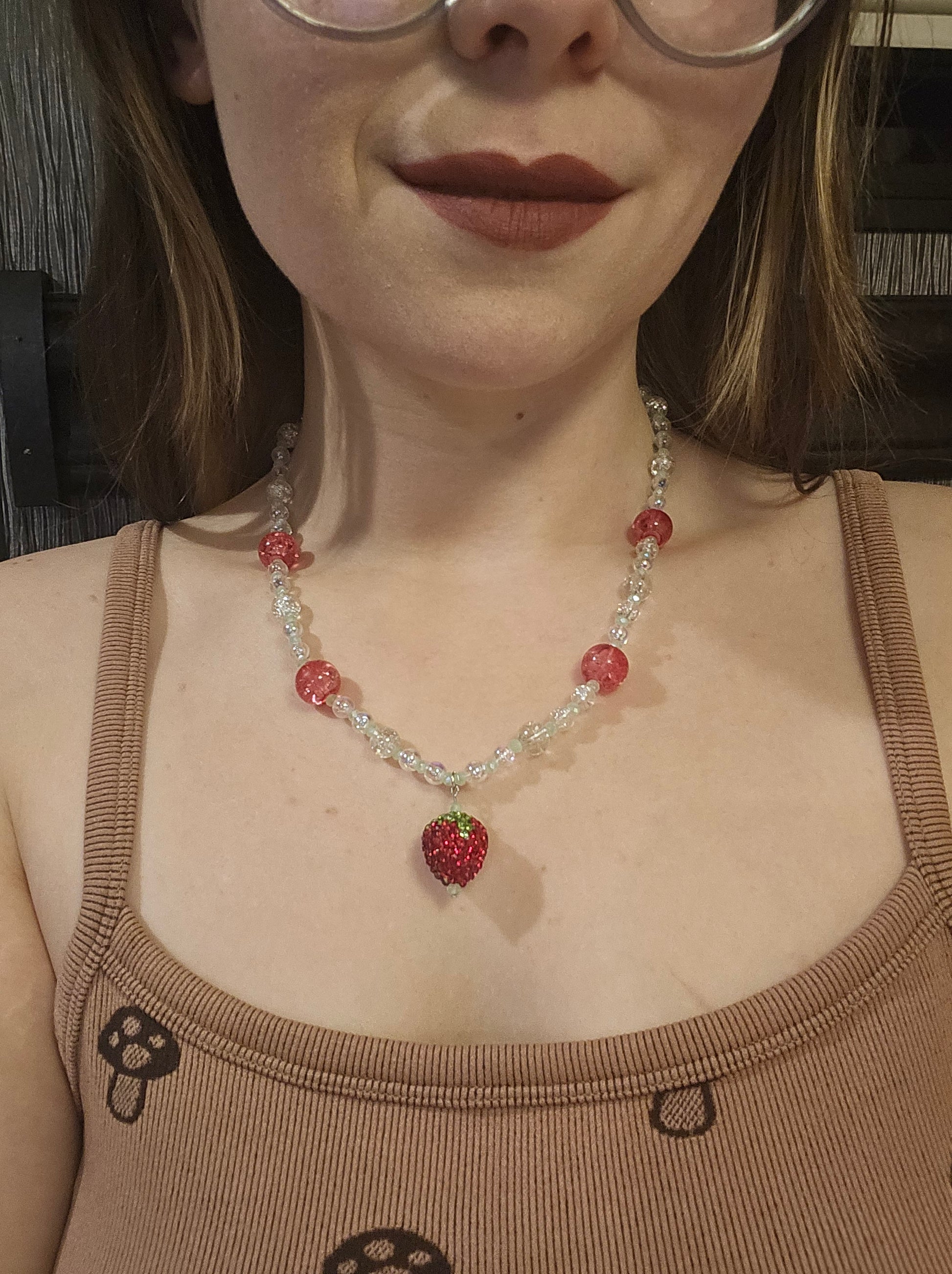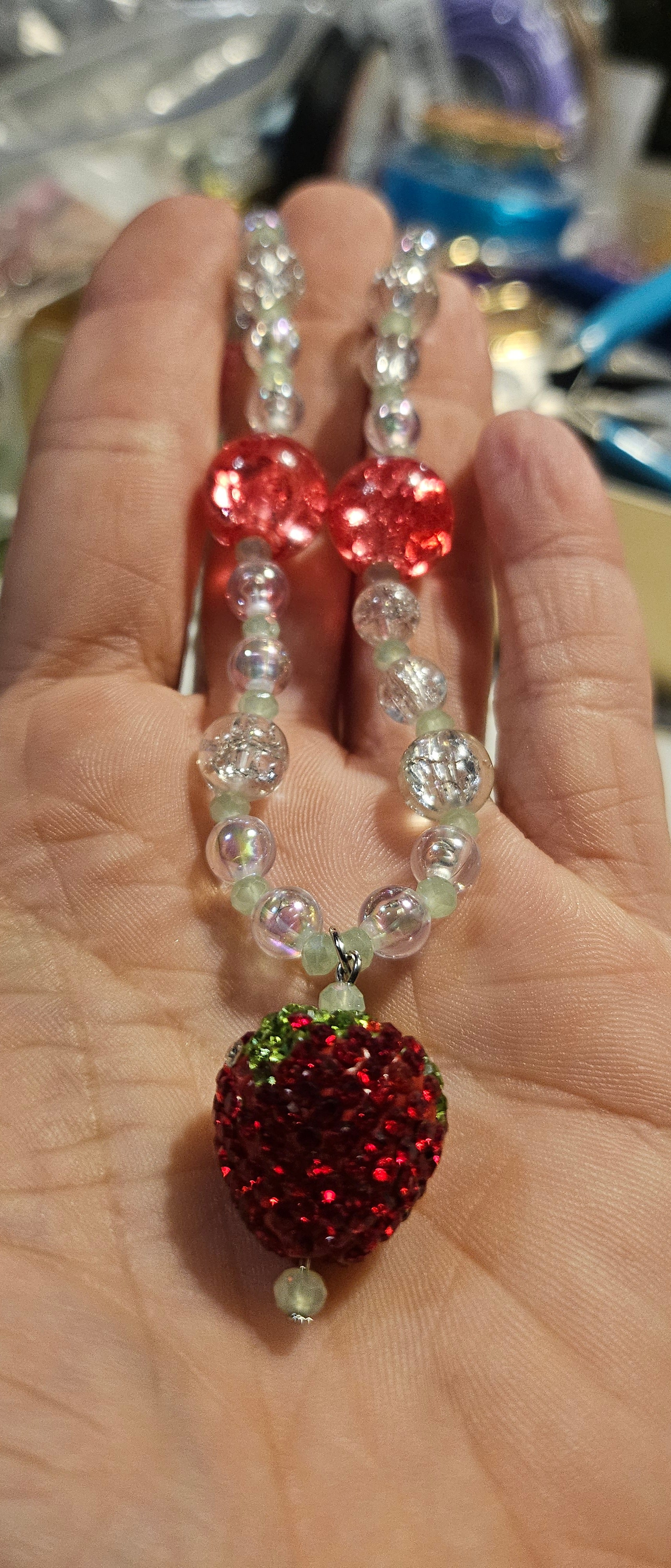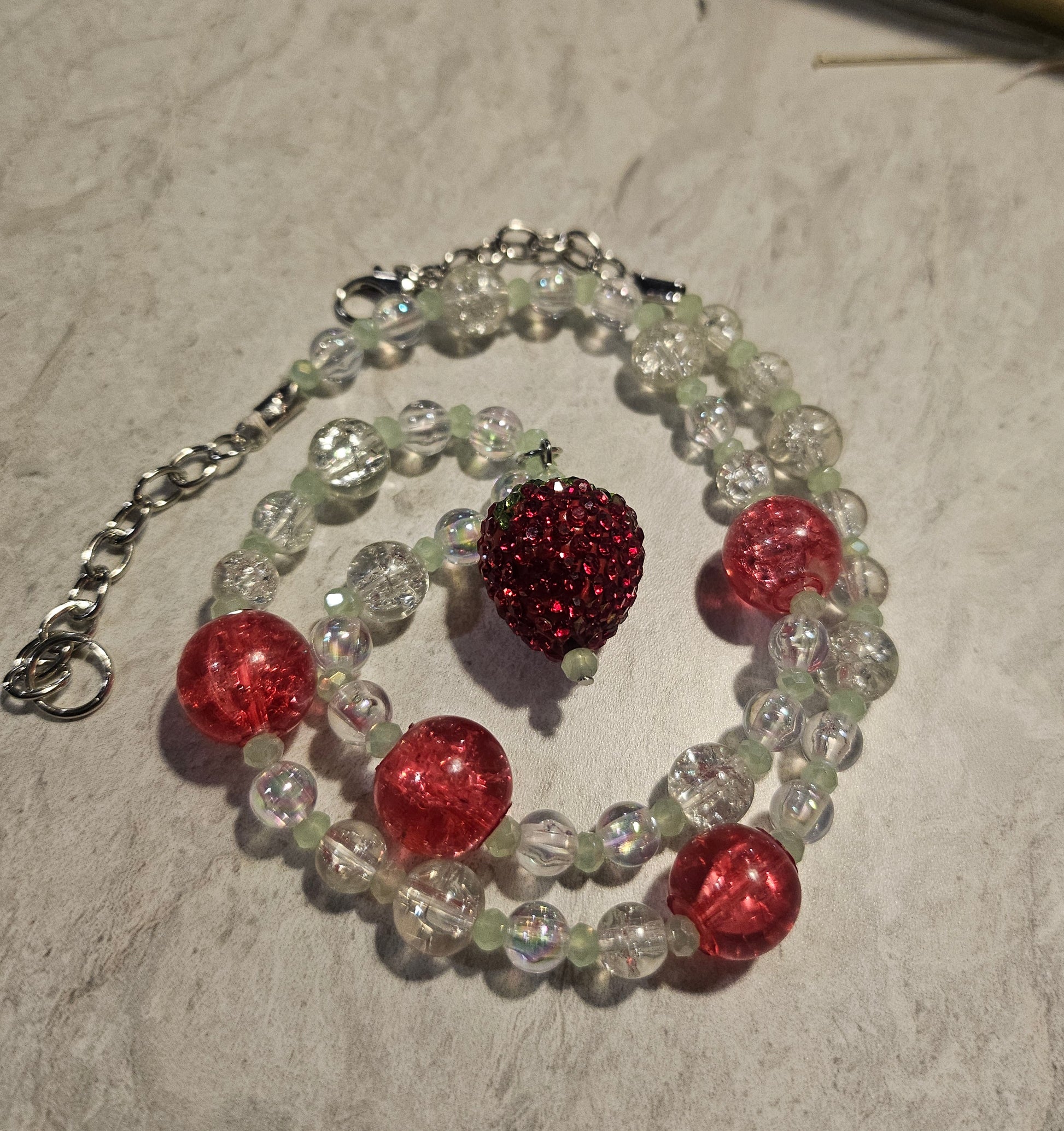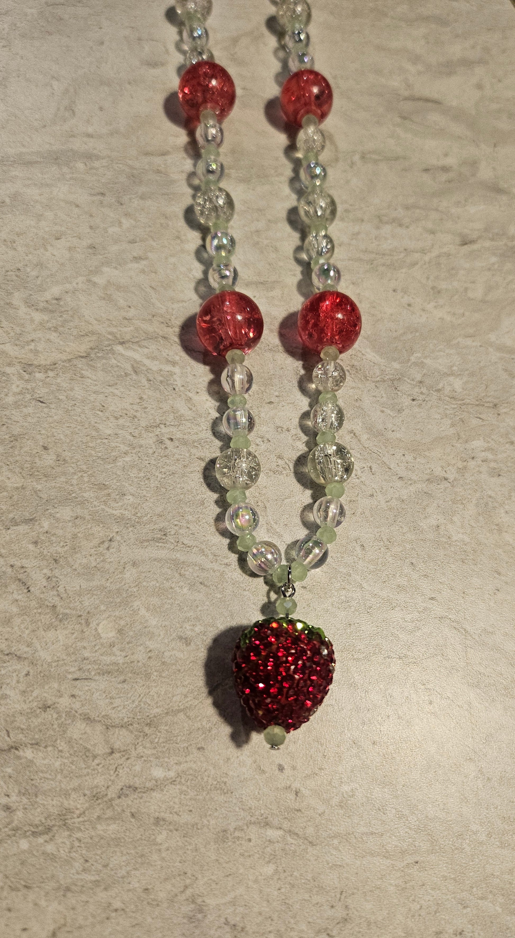 A 9" beaded necklace made with beadalon string. The main beads are clear iridescent crackle bead spaced with a light green faceted glass bead and the charm is a rhinestone strawberry. The hardware is silver with a lobster clasp.