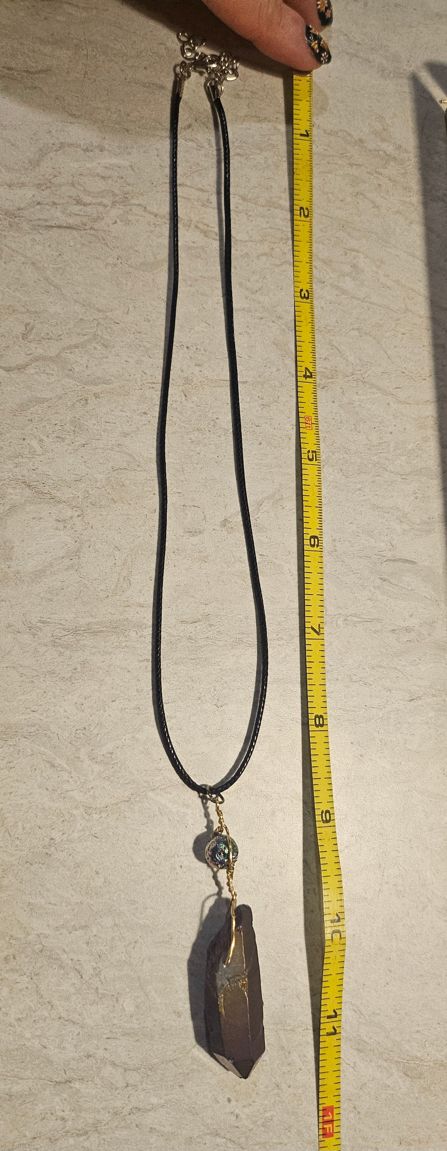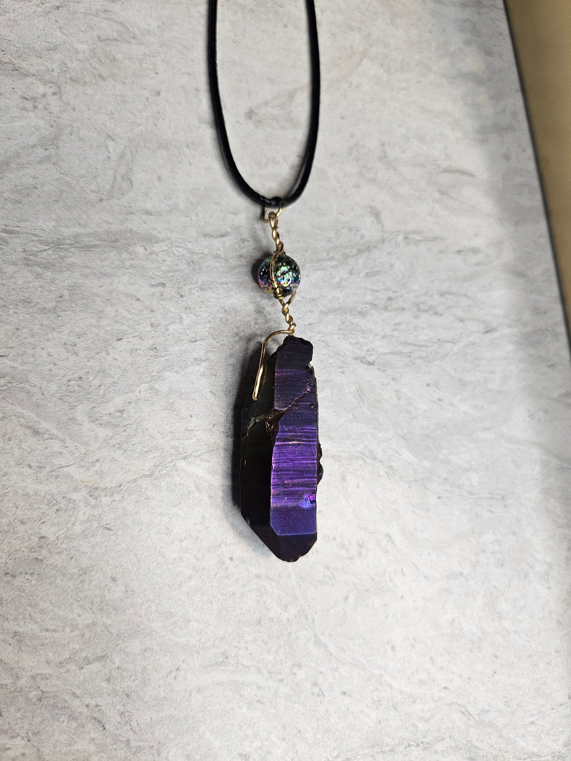 A 9" necklace featuring a dark purple crystal with an iridescent round purple accent bead wrapped in brinze wire. On a black cord with a lobster clasp.