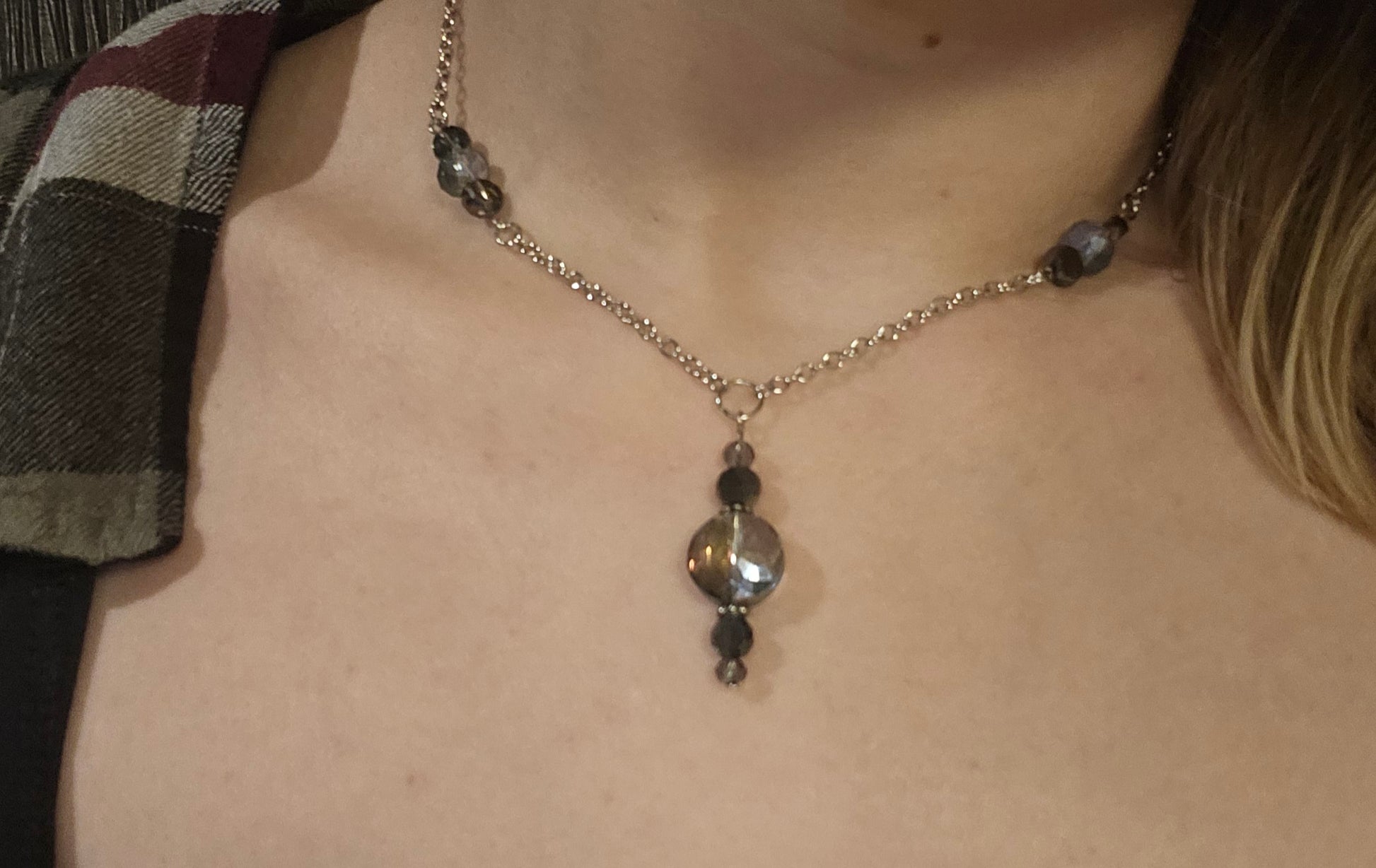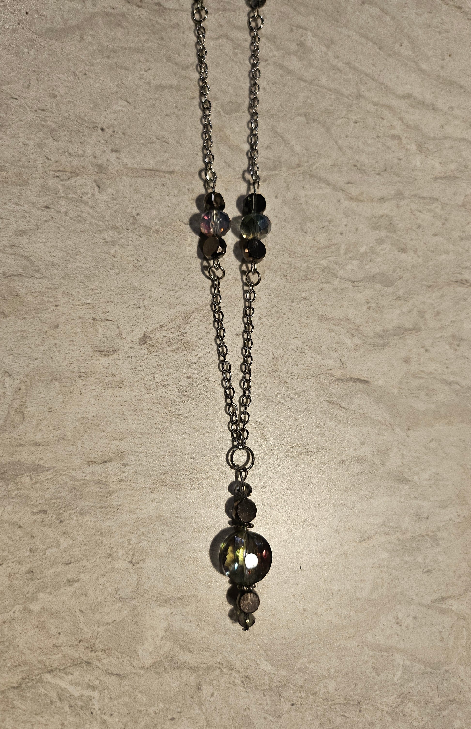 A 9" lobster clasp necklace made with a round iridescent glass beads and glass beads.