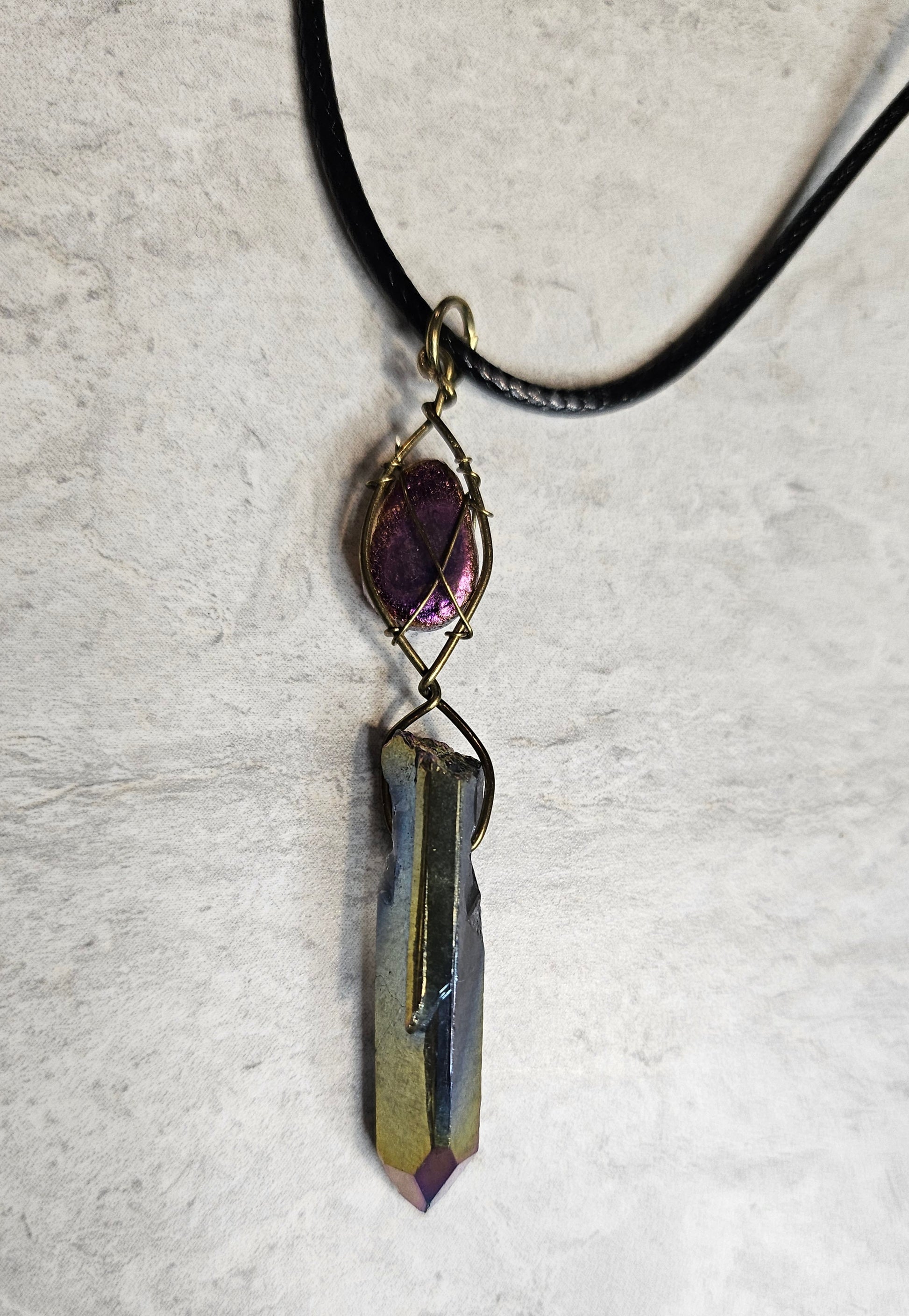 A 9" necklace featuring a dark purple crystal with an iridescent purple teardrop accent bead. Wrapped in bronze wire on a black cord with a lobster clasp.
