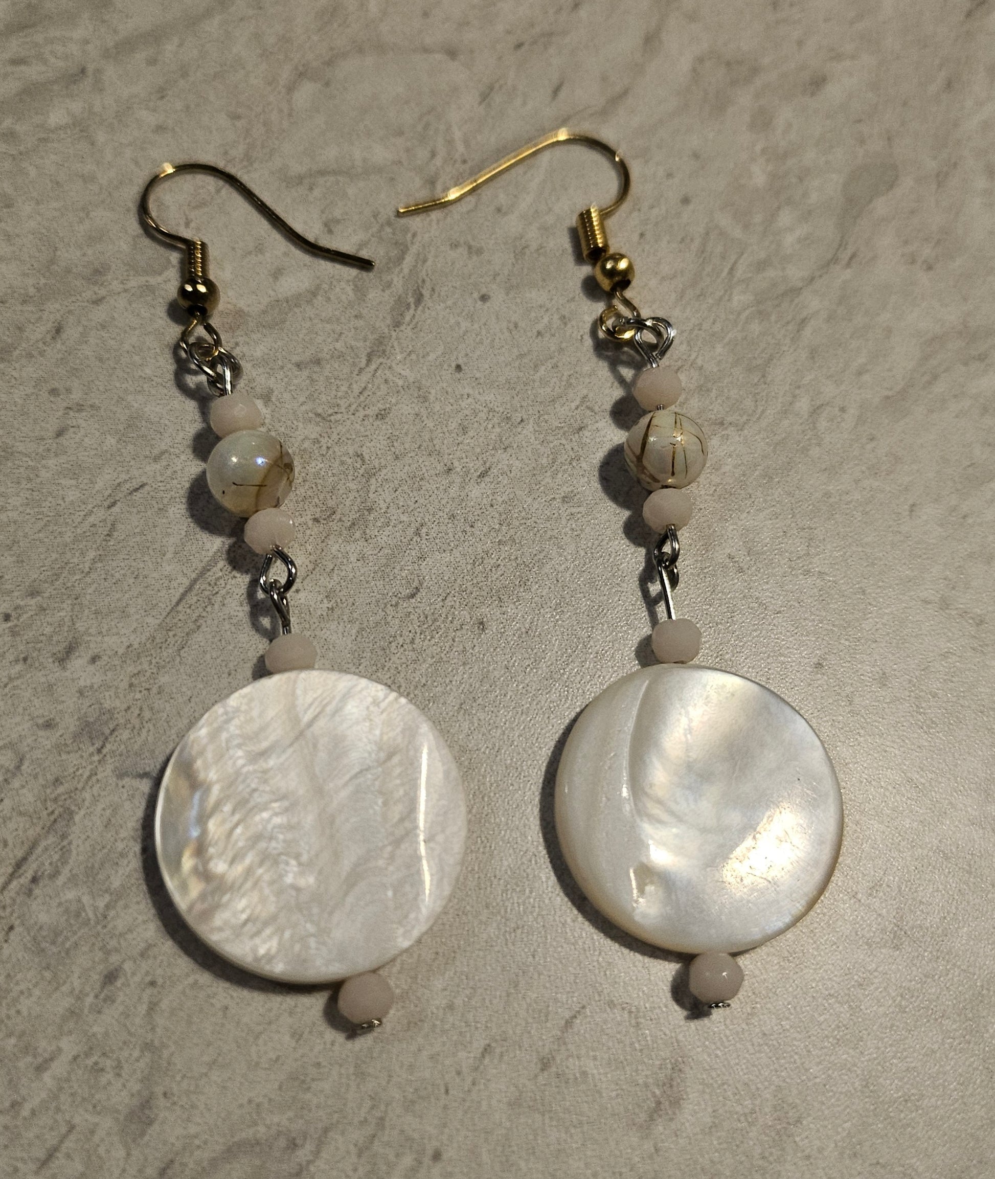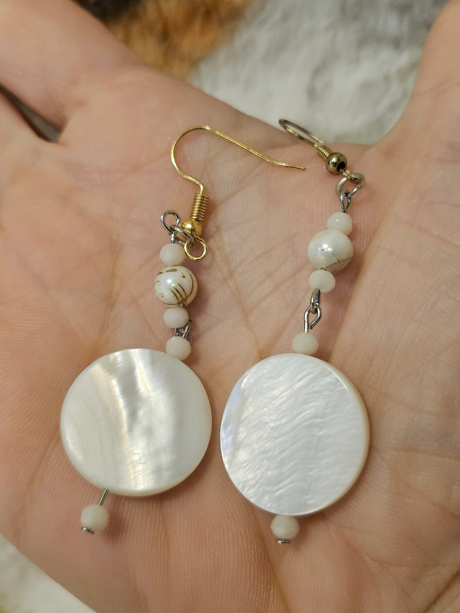 A pair of dangly earrings, featuring iridescent abolone disks with a single gold and white bead at the top, on fishook earrings.
