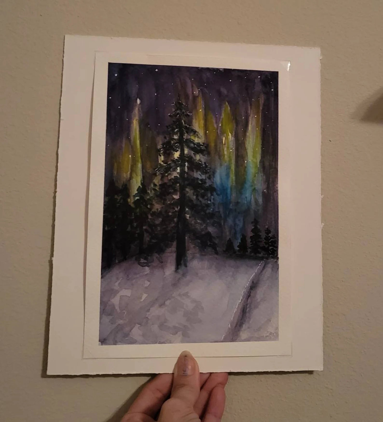 A 6 x 9 original watercolor painting of the night sky lit by the aurora borealis. Mounted on 8x10 acid free white matboard with acid free mounting corners. Original watercolor done by @magicbubblepipe on insta š