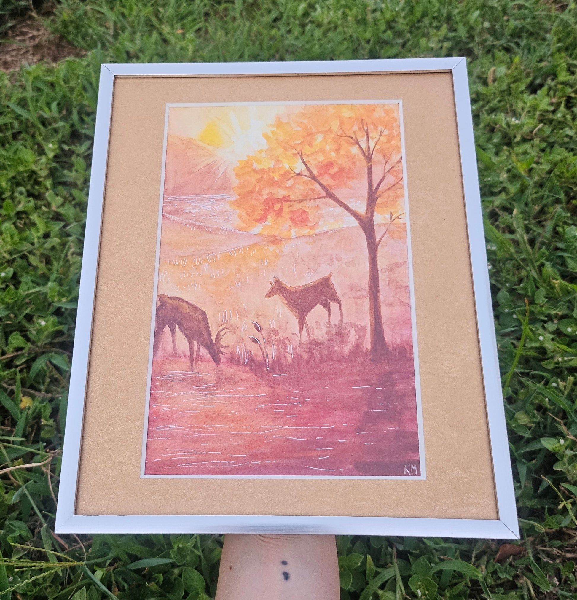 A 6 x 9 original watercolor painting of two deer by a river, rich autumn light behind them. The mat isba textured gold and the frame is silver