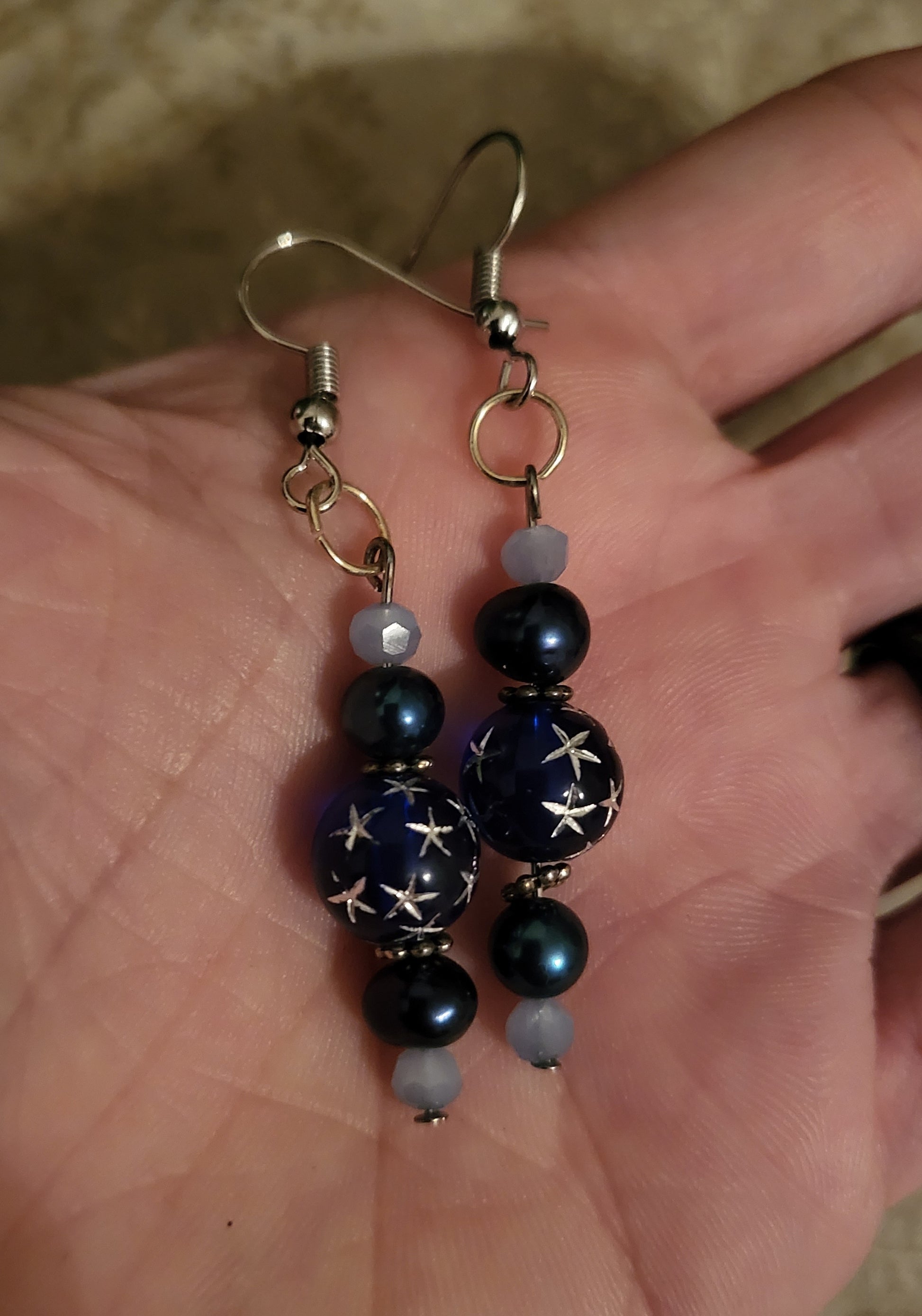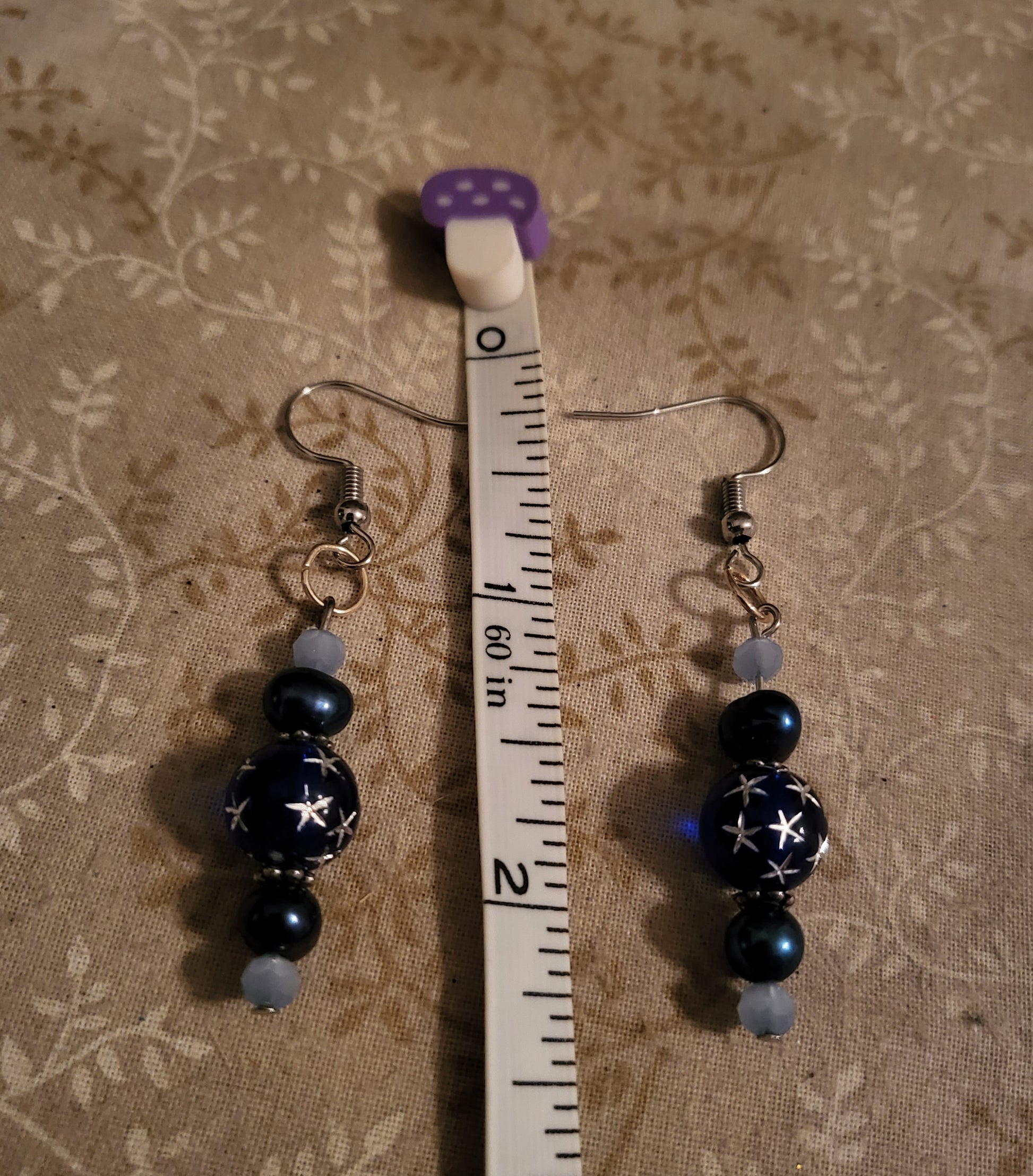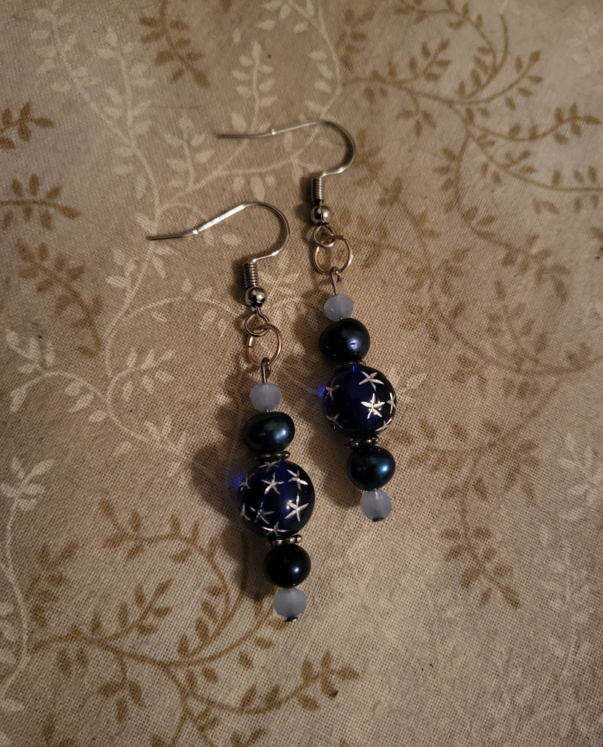 A pair of 2" dangly earrings on copper wire featuring a dark blue bead with silver stars and black fresh water pearls for accents on fishhook earrings.