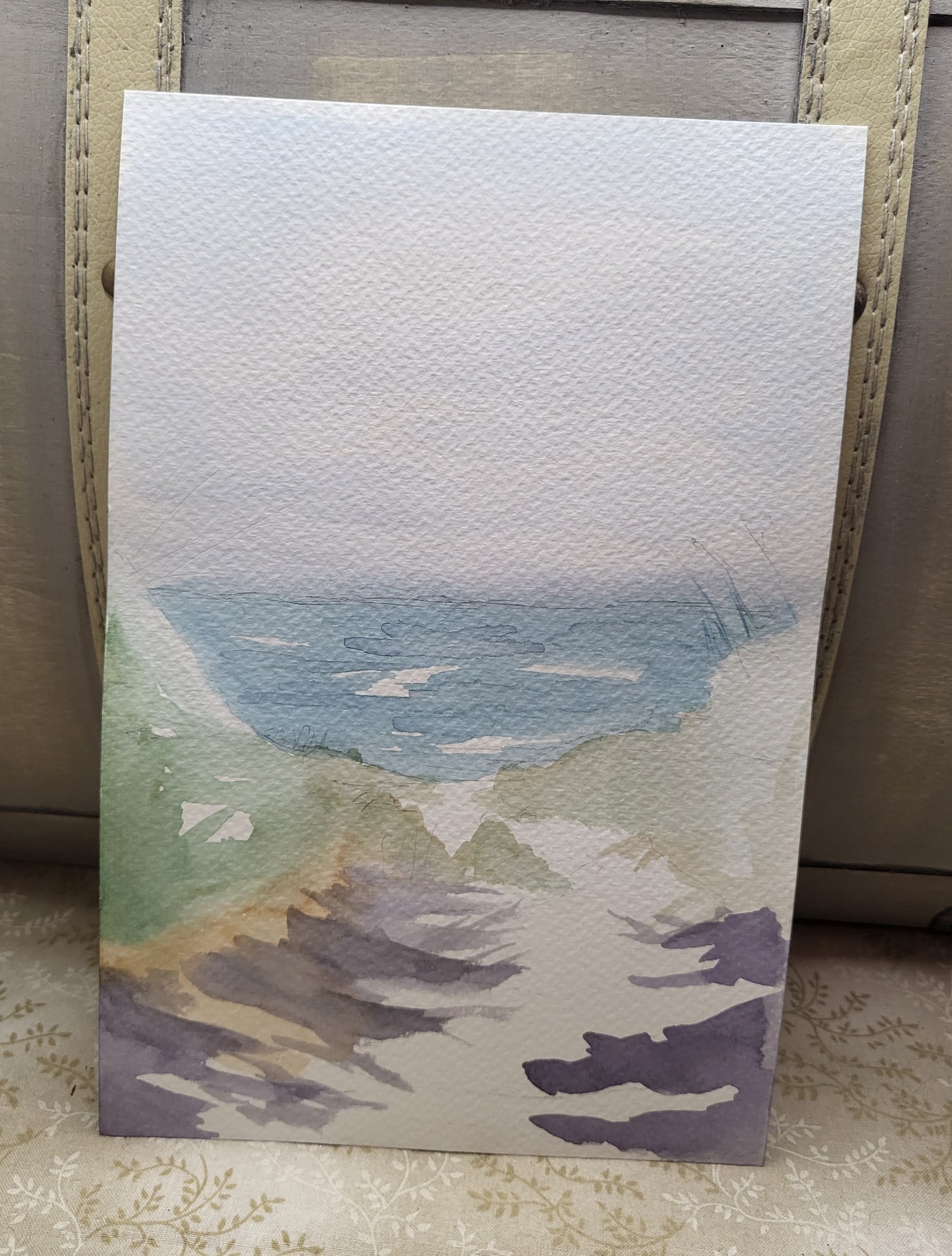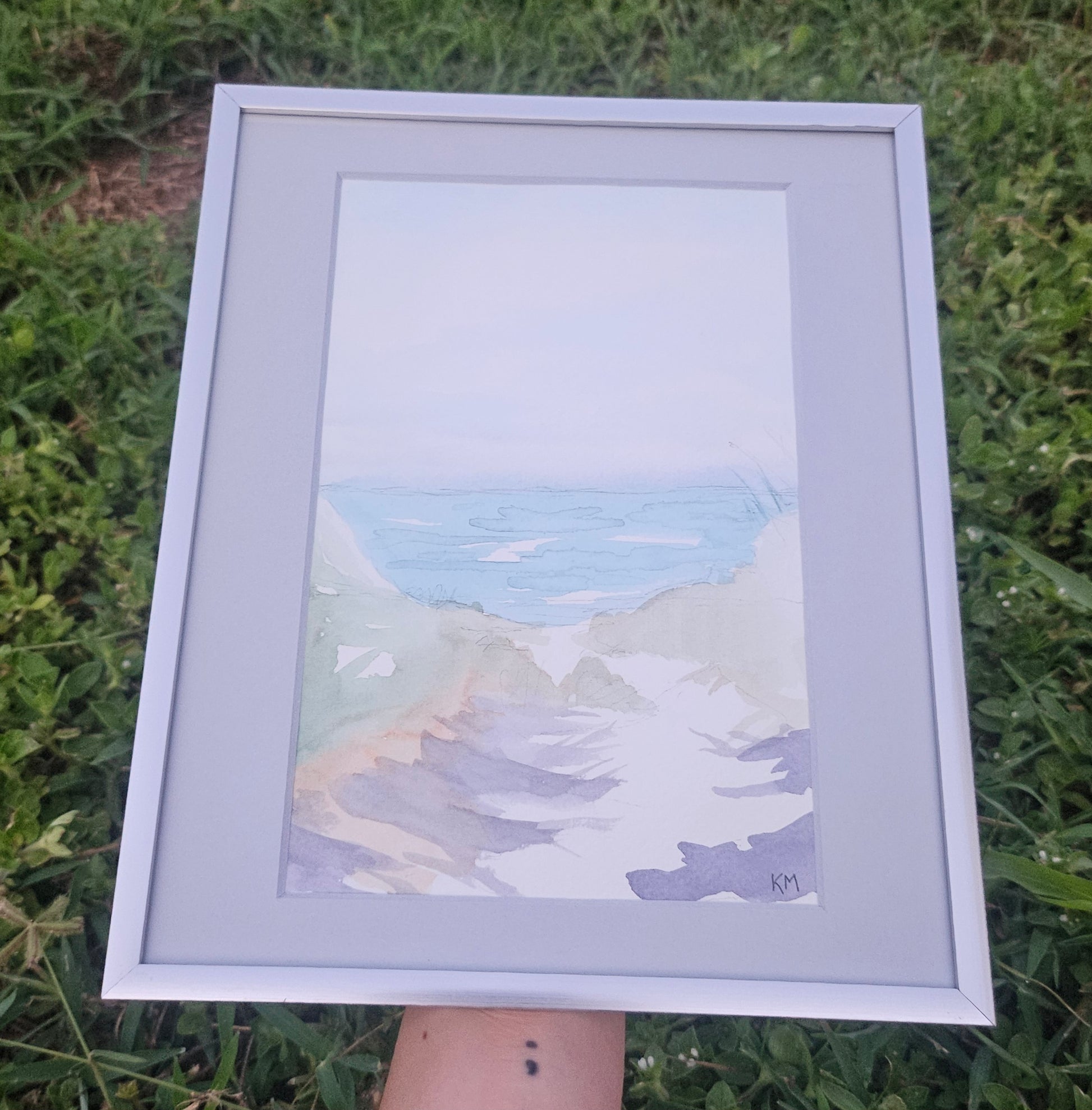 An original watercolor of a sandy walkway leading down to the water. Done by magicbubblepipe. Mat is a cool grey and fits into an 8x10 frame. The frame is silver and can sit or hang.