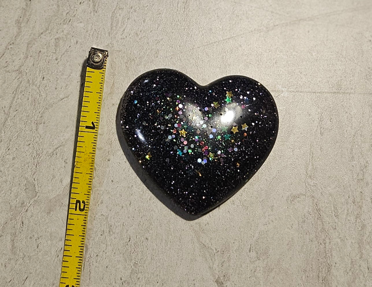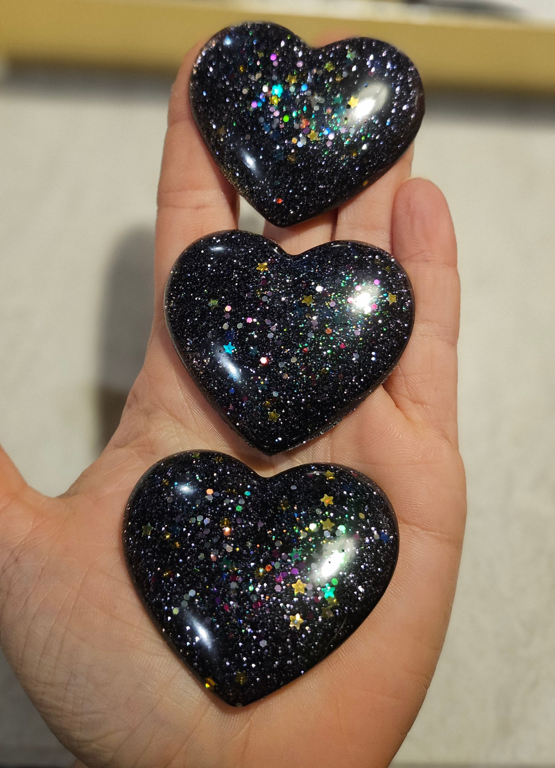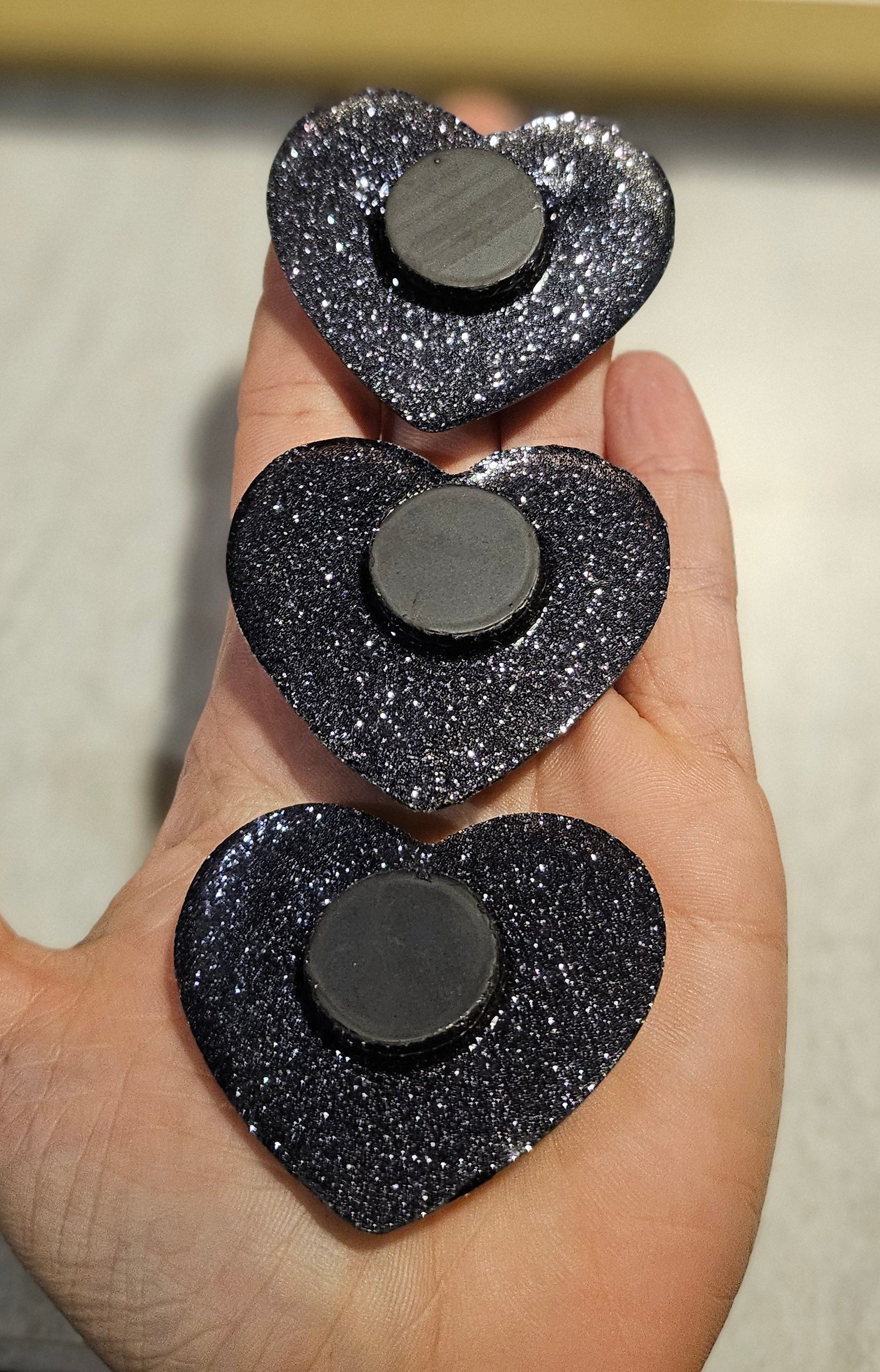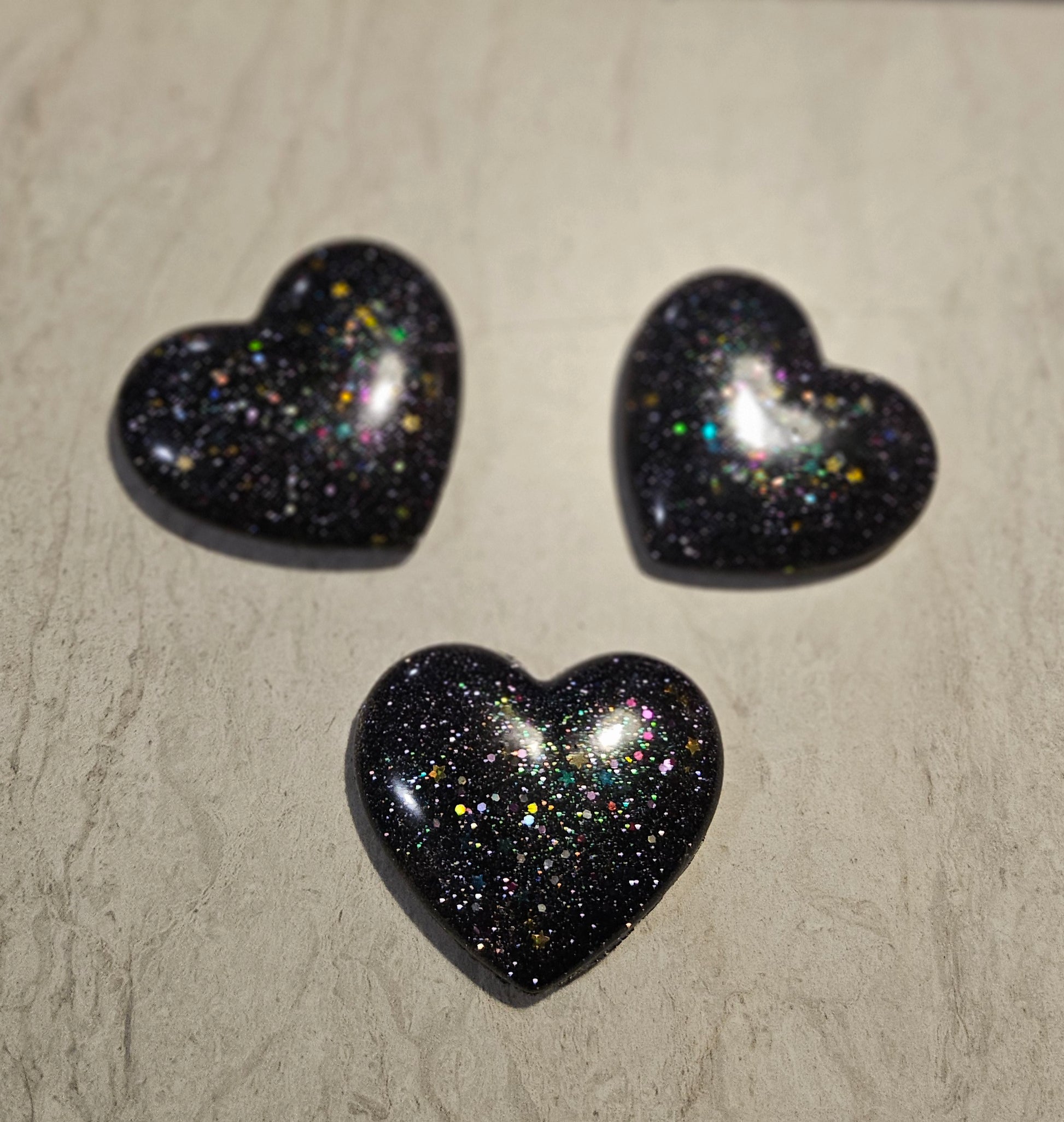 A 3 piece magnet set made with epoxy resin and fine black glitter layered with holographic glitter. Hearts measure 2".