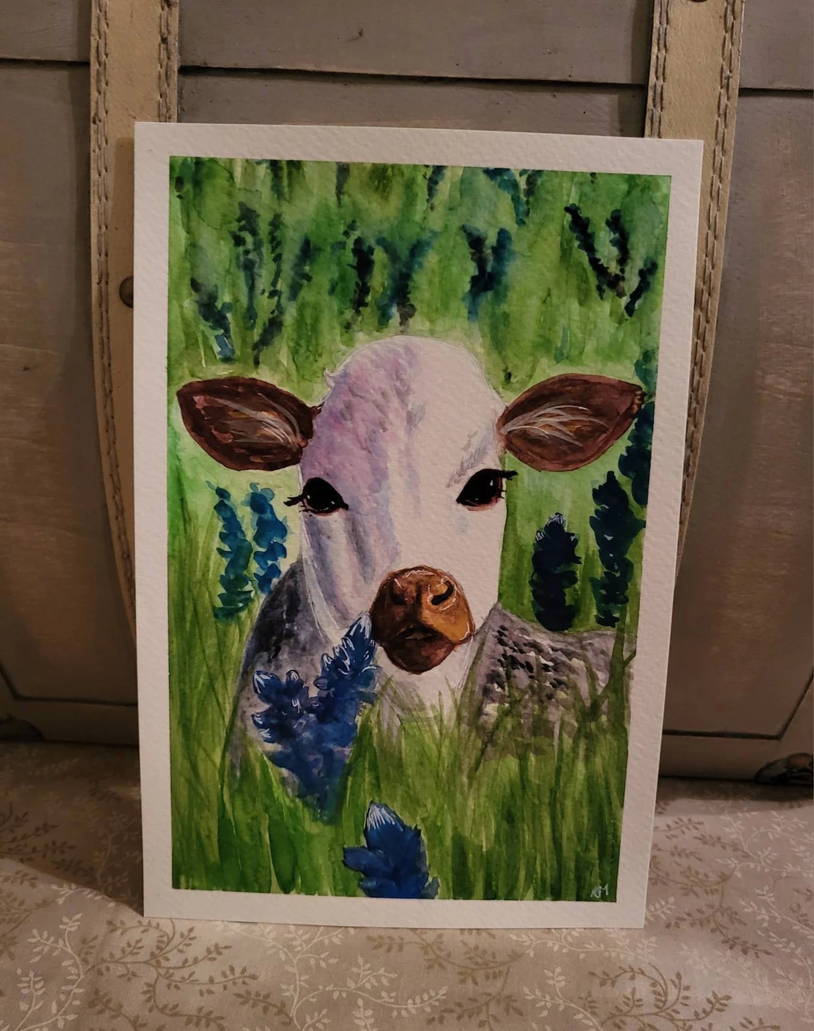 A 6 x 9 original watercolor painting of a Texas longhorn calf lying in a blue bonnet field.