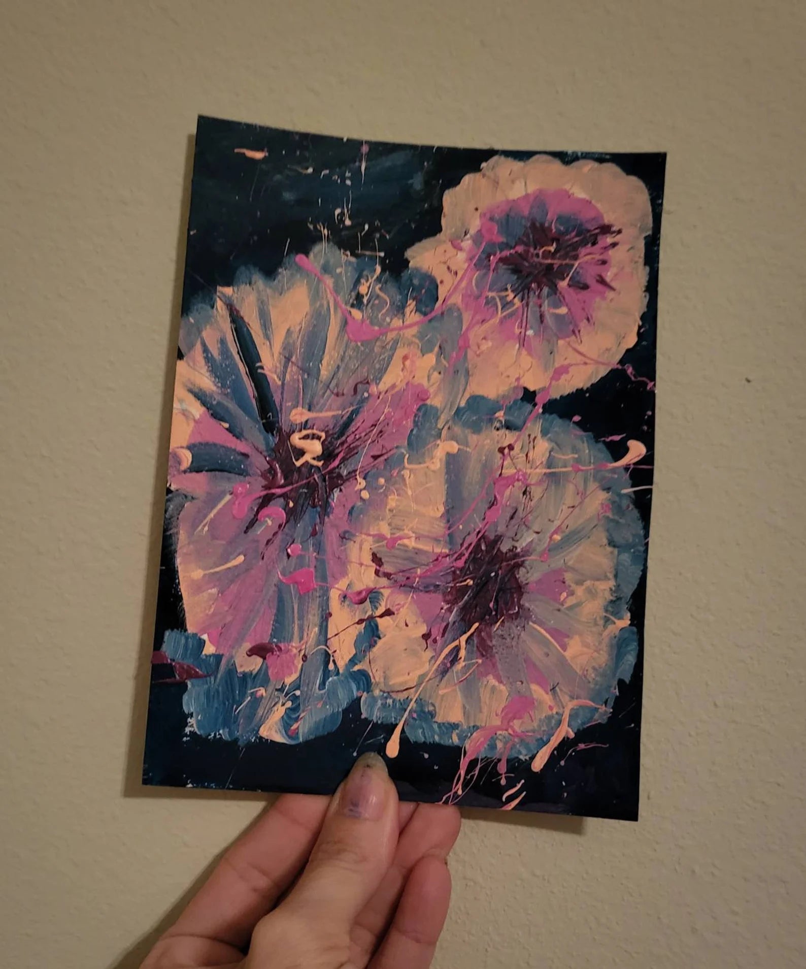 Pink stylistic flowers with a dark blue background. 5x7 acrylic canvas.