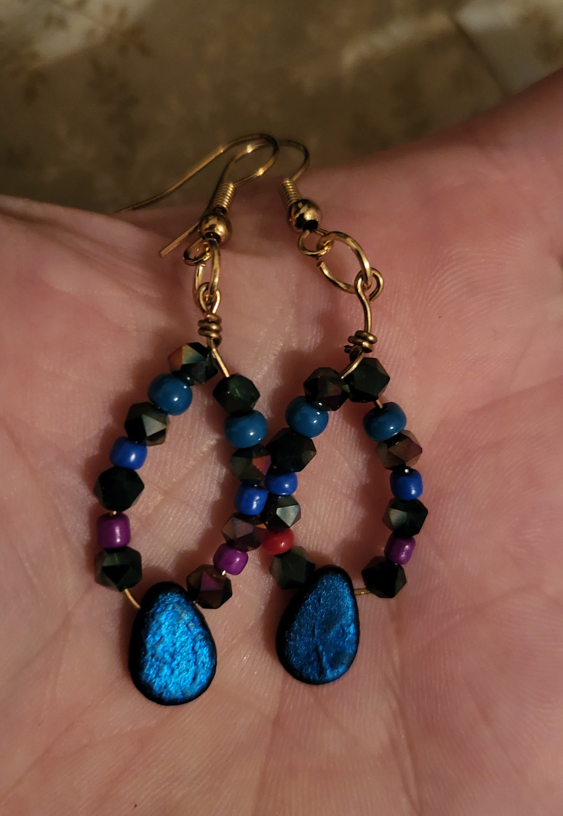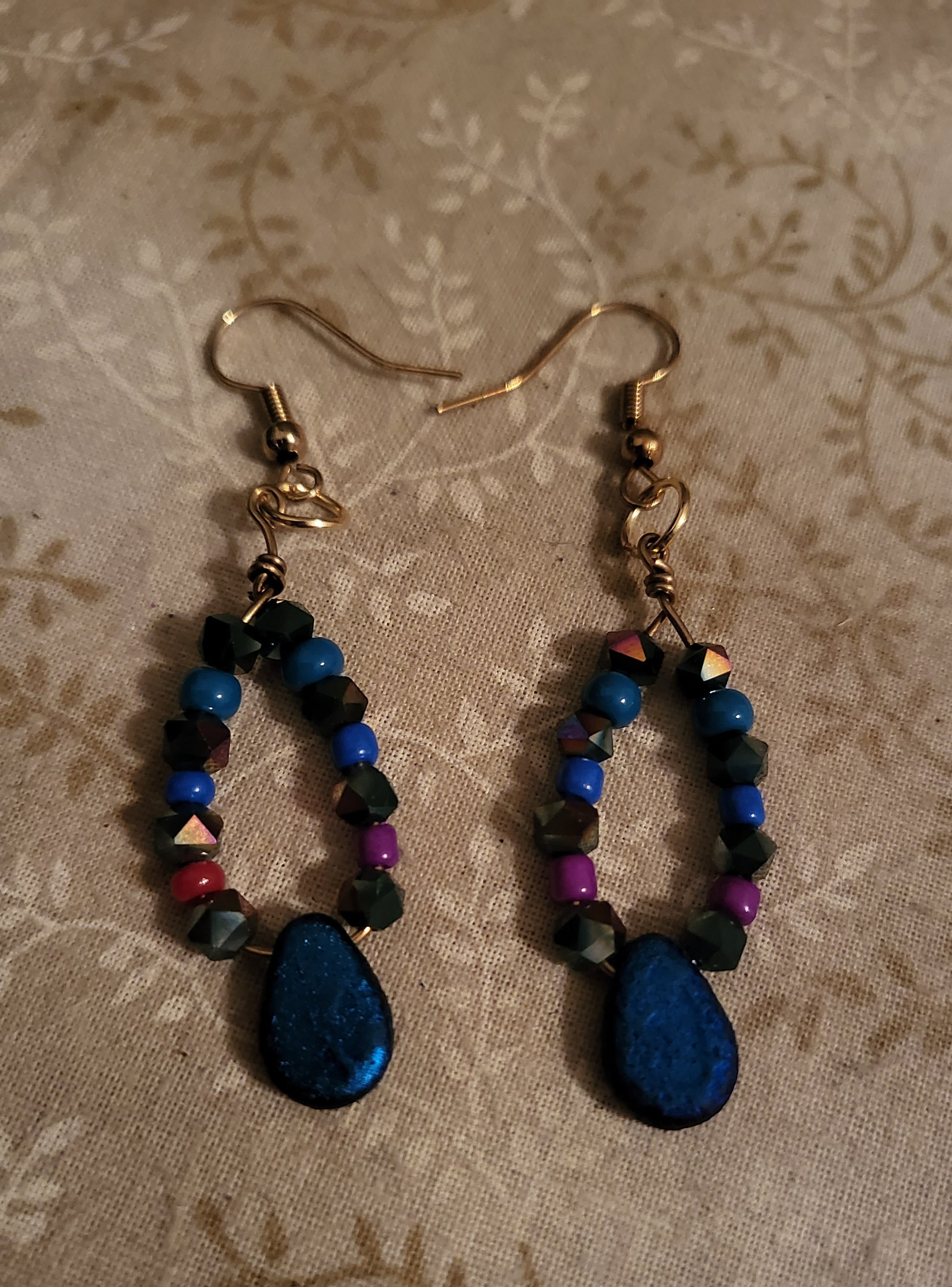 A pair of dangly earrings on copper wire featuring a blue iridescent teardrop bead with purple/blue beads for accents. On fishook earrings.
