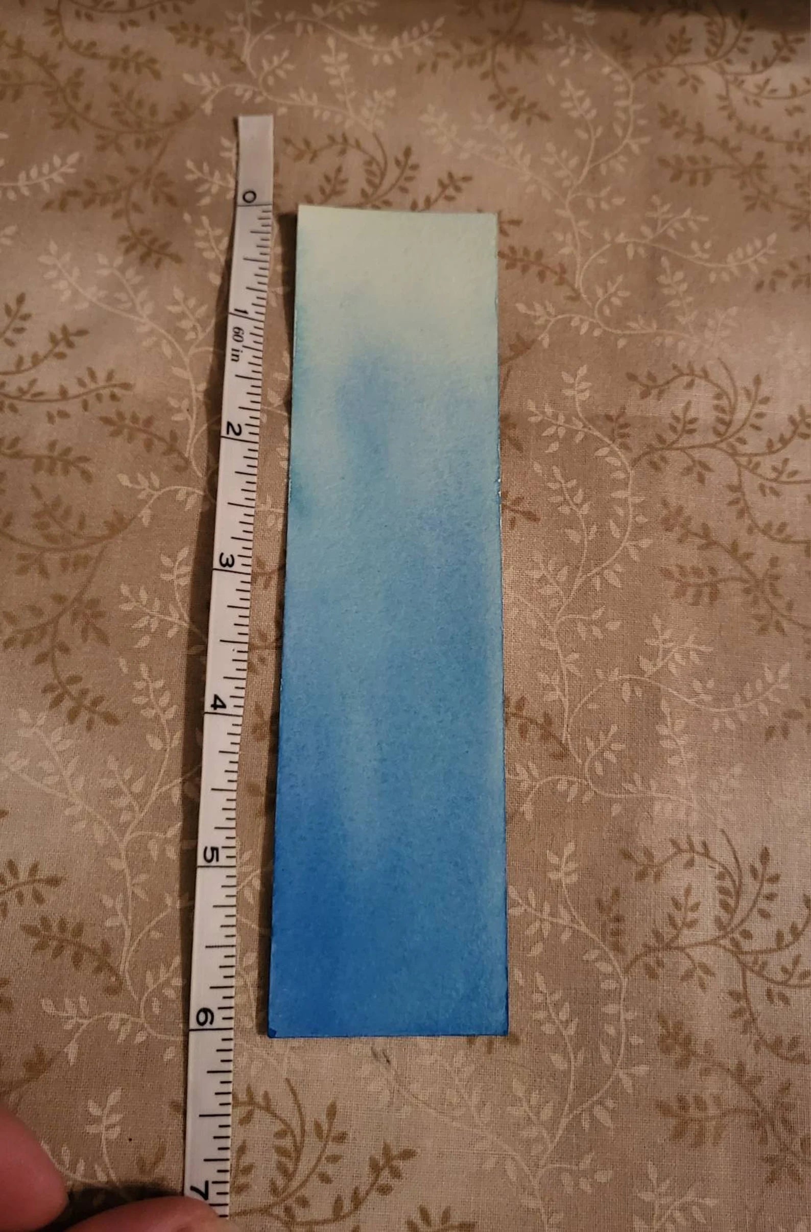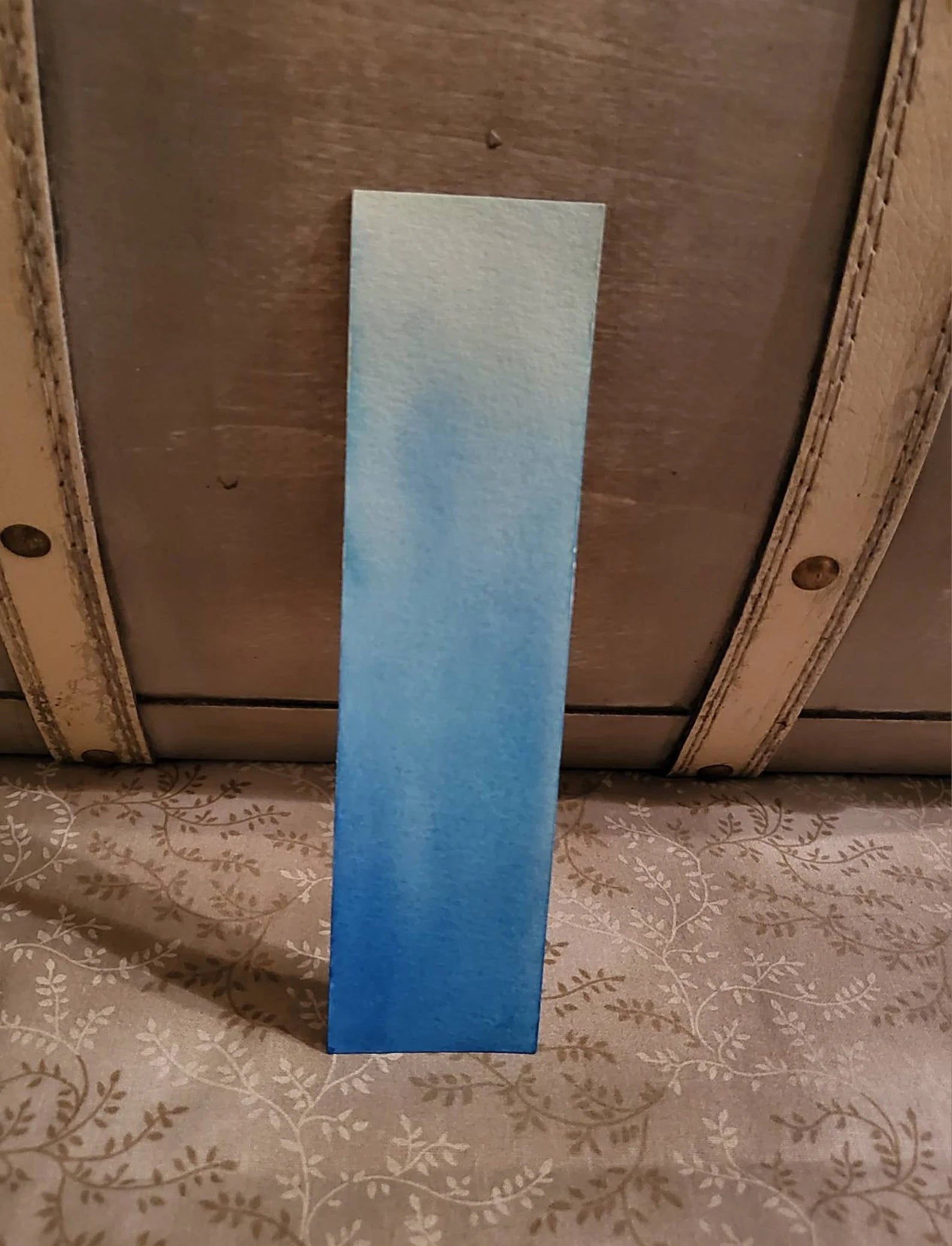 A 1.5x6 bookmark of a blue gradient on 110lb cardstock,watercolor paint