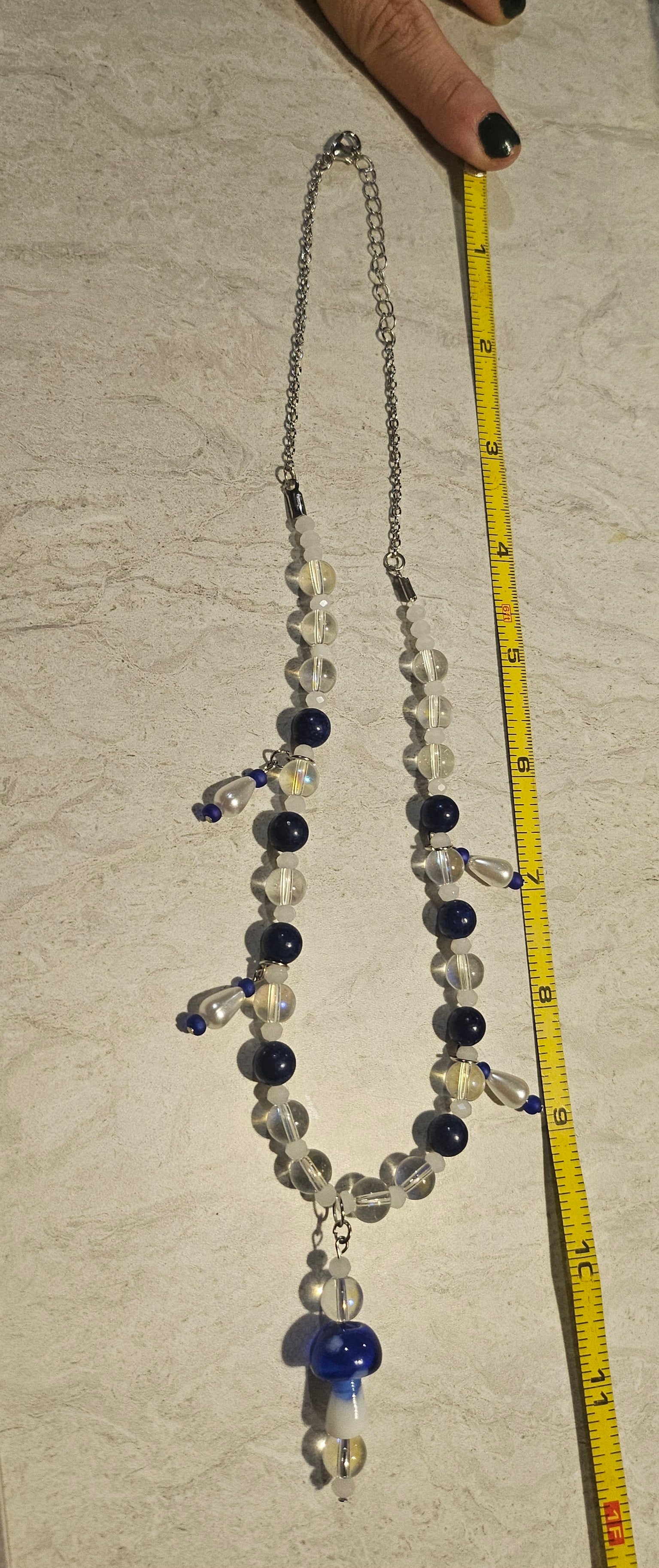 A 10" lobster clasp necklace, featuring a blue glass mushroom bead. The accent beads are 8mm lapis lazuli and reflective glass with faux pearl teardrop charms.